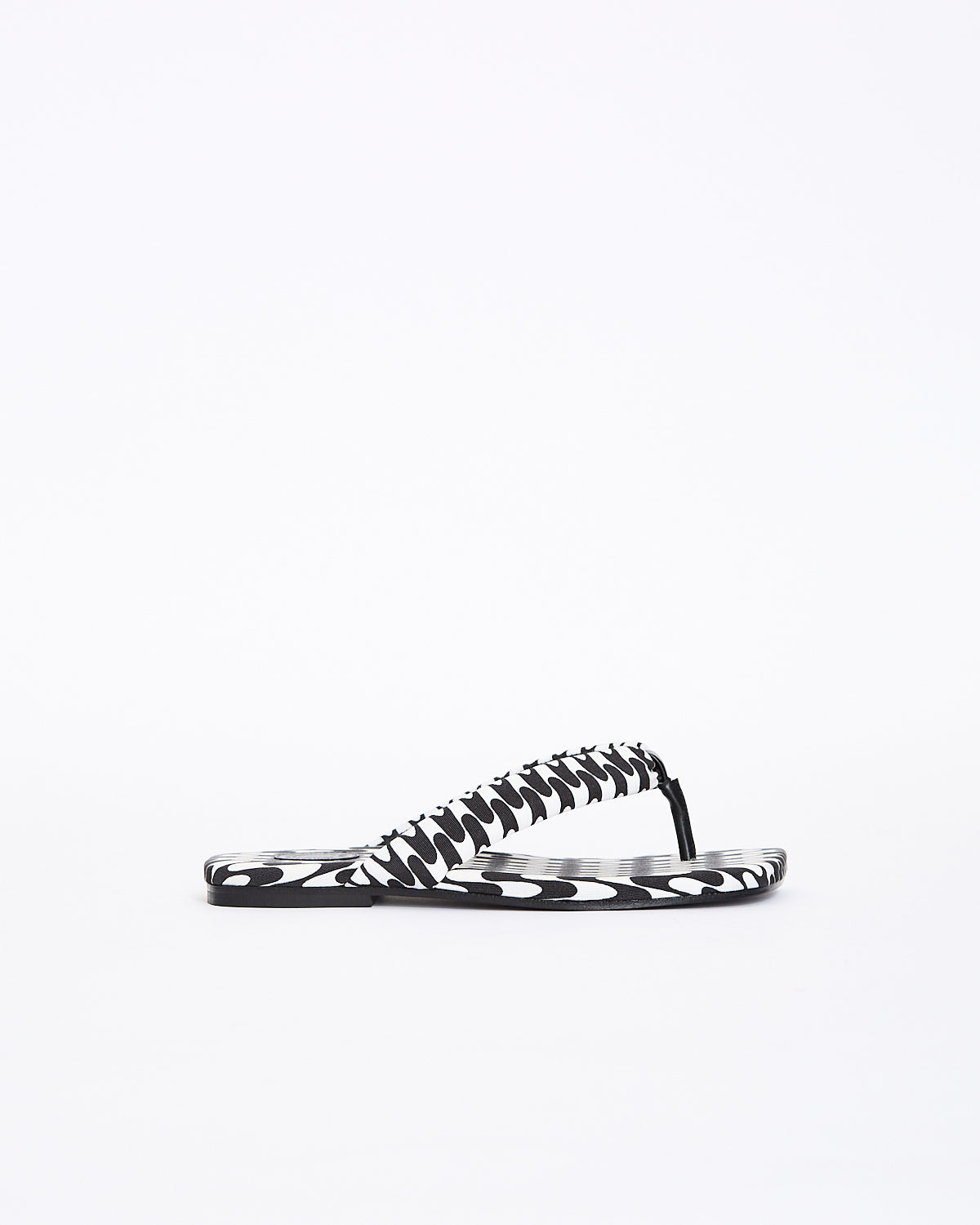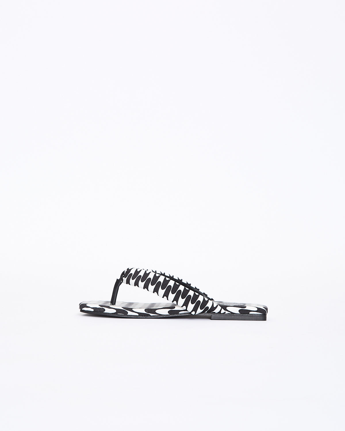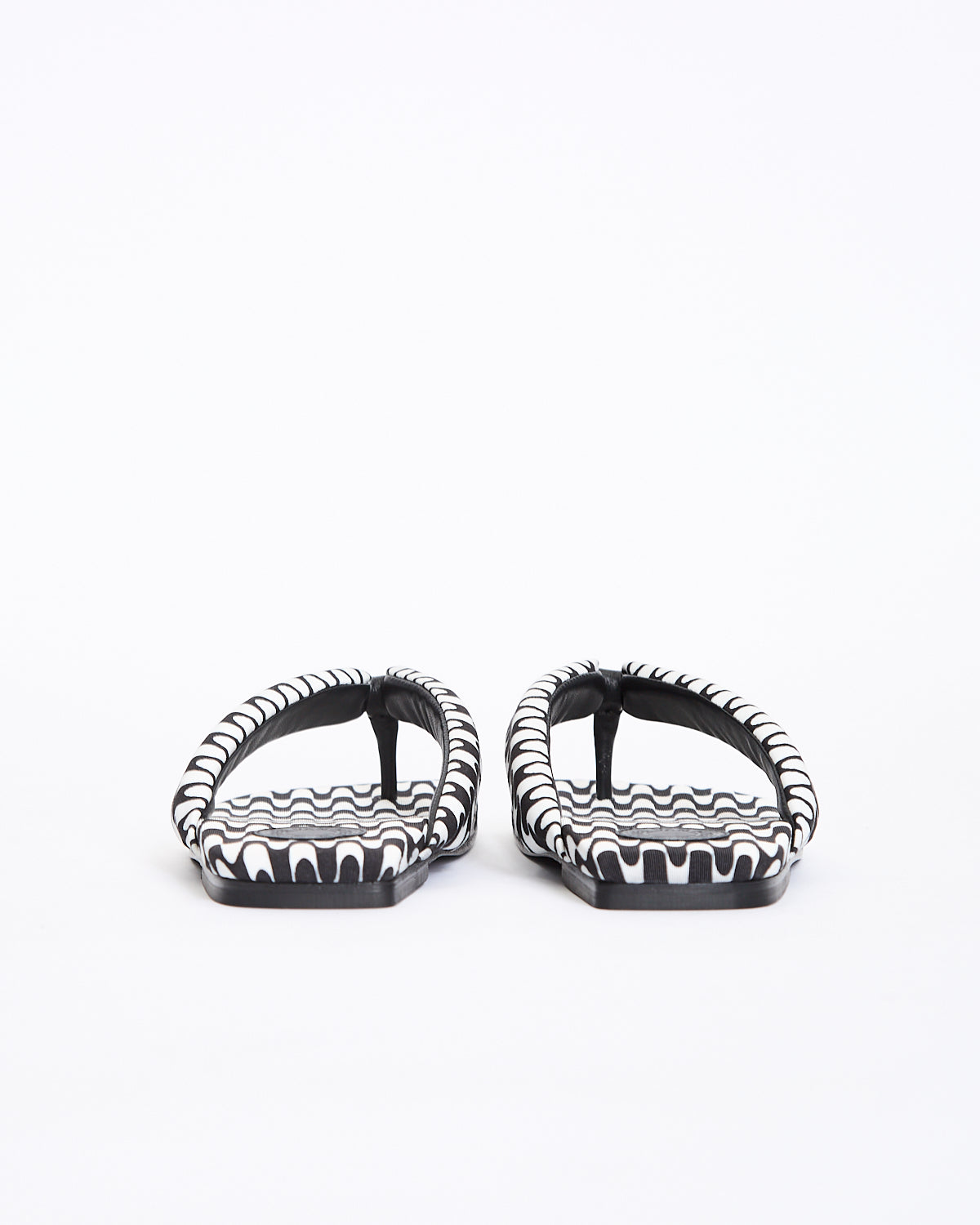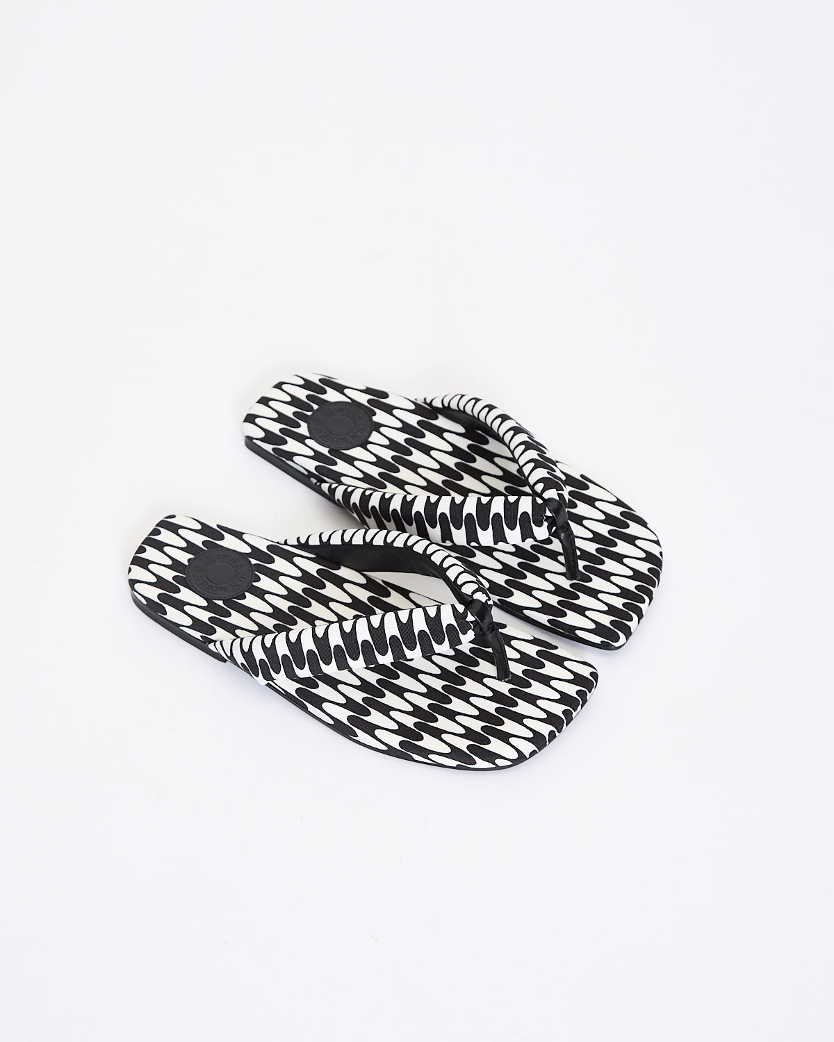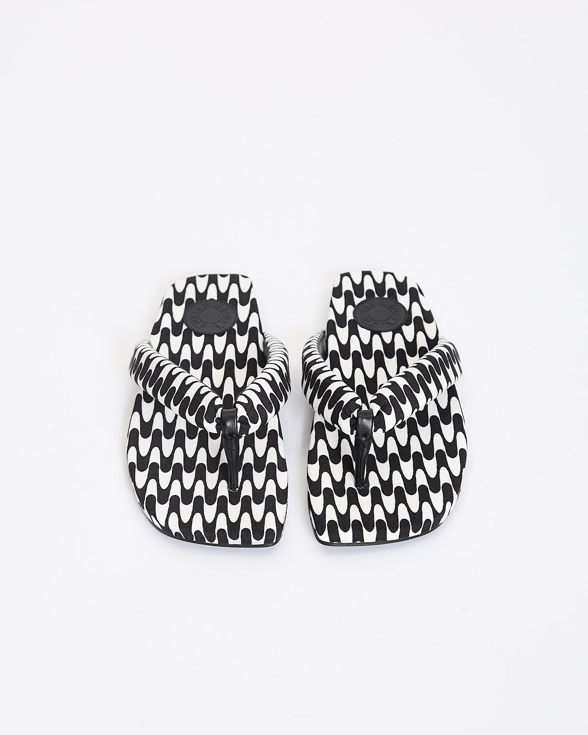 Dries Van Noten Thong Sandal in black features a flat heel geometric sole, padded thong strap, wavy black and white pattern.