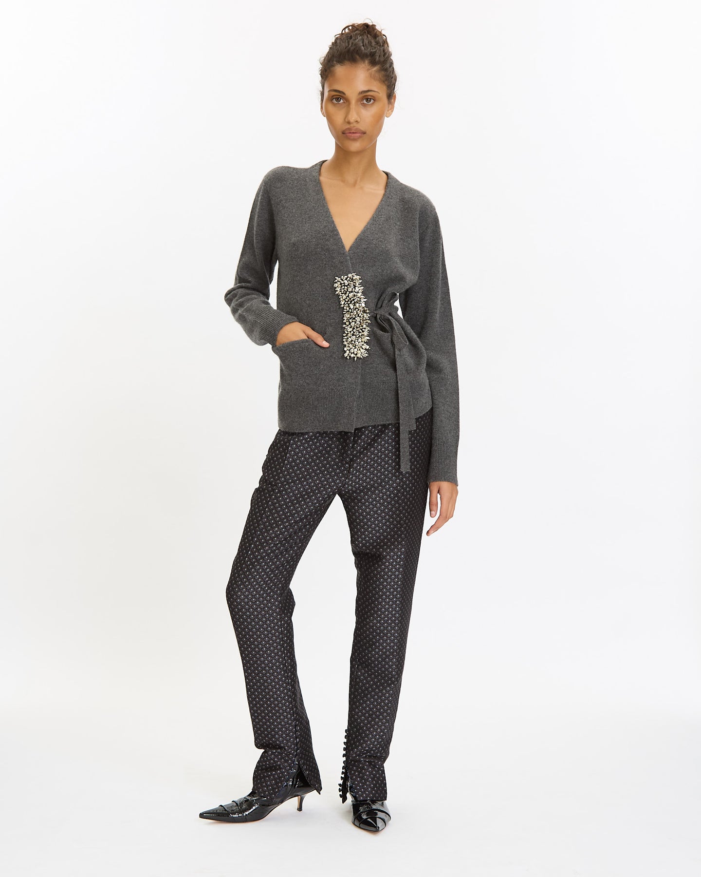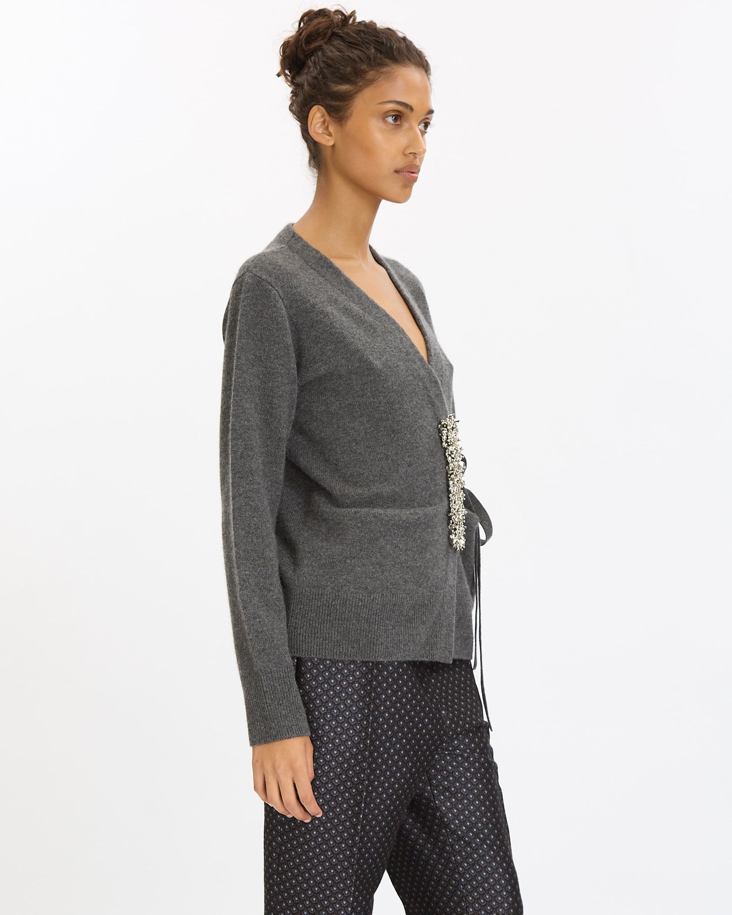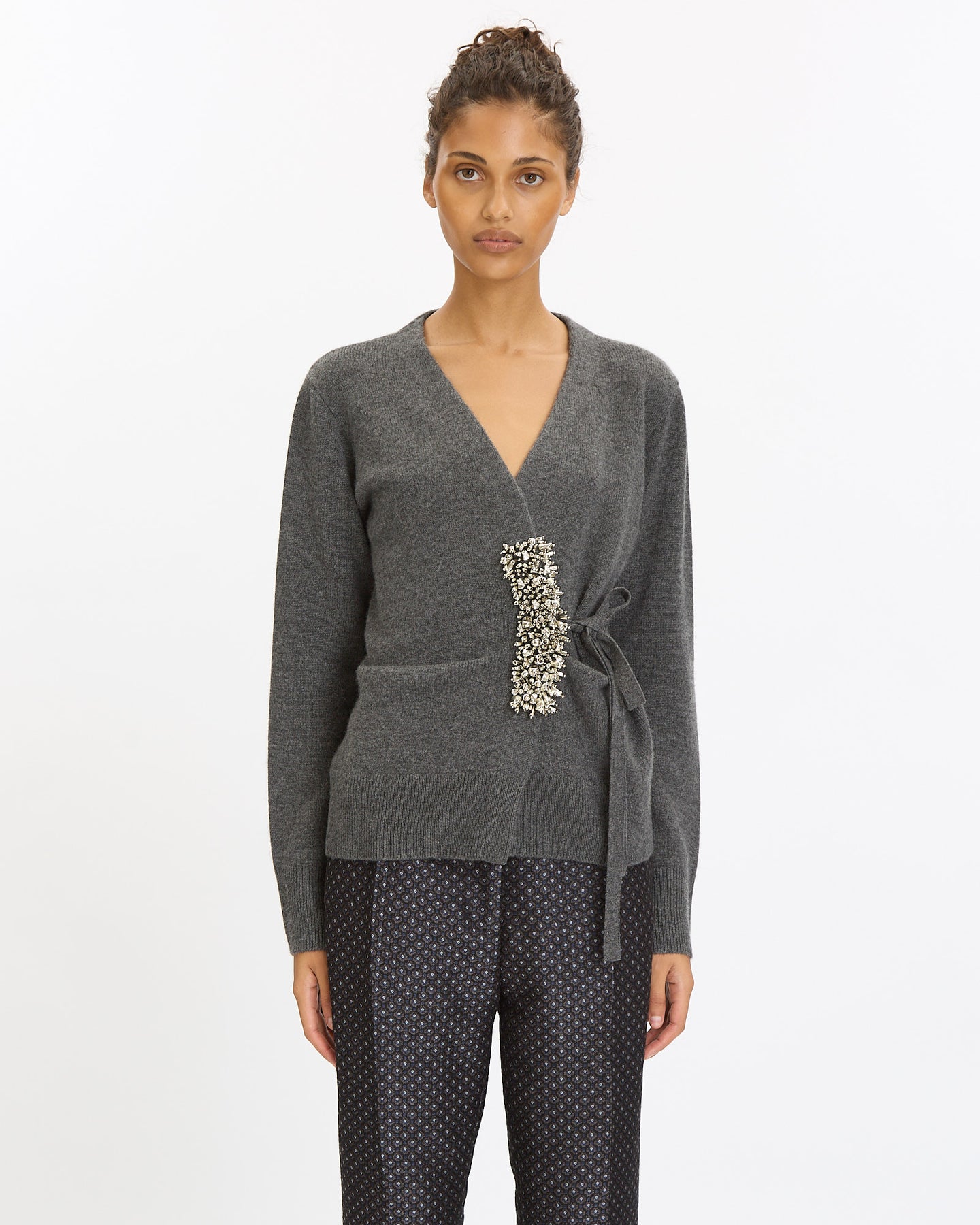 Dries Van Noten Tiah Cardigan in dark grey features a classic cardigan silhouette in a cashmere fabrication. Details include self tie at side waist and crystal jewel embellishment.