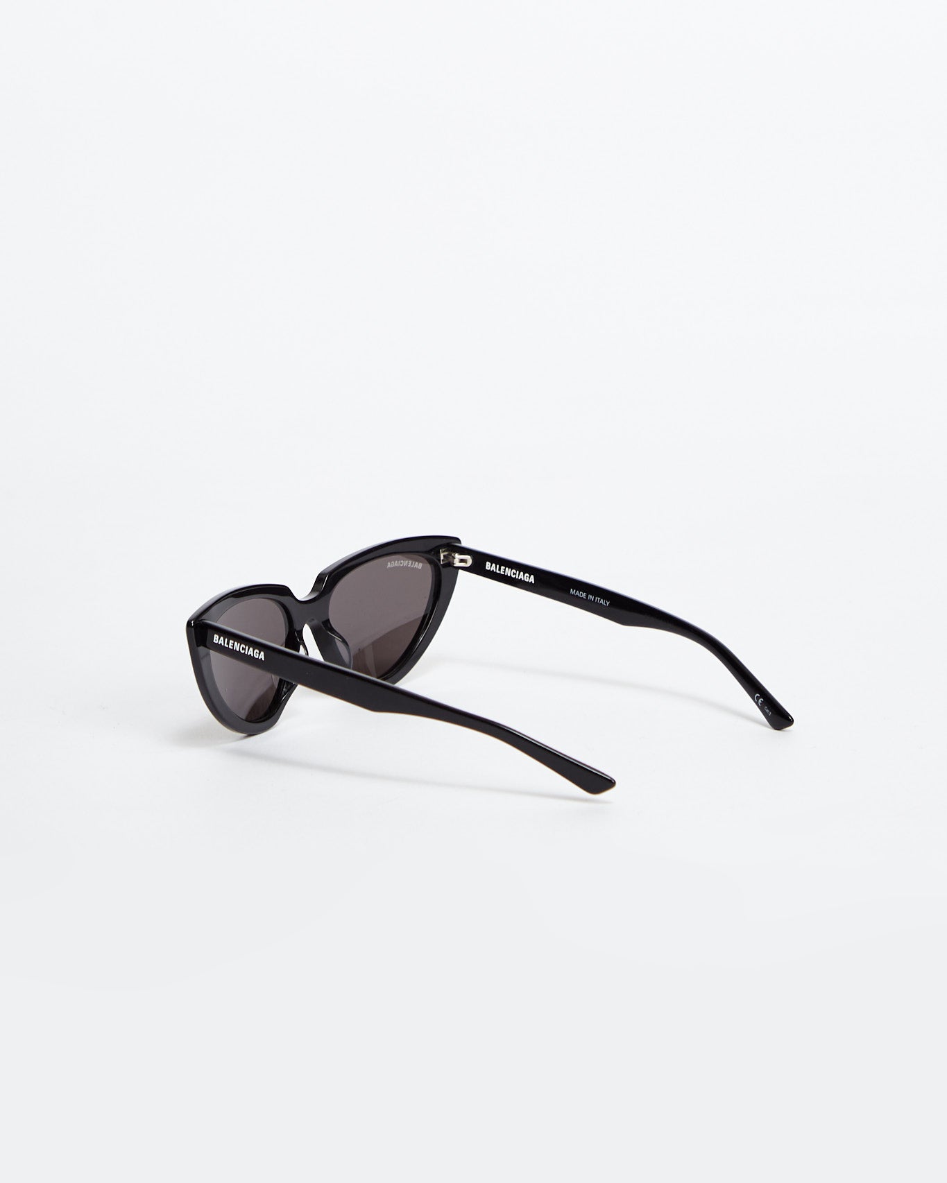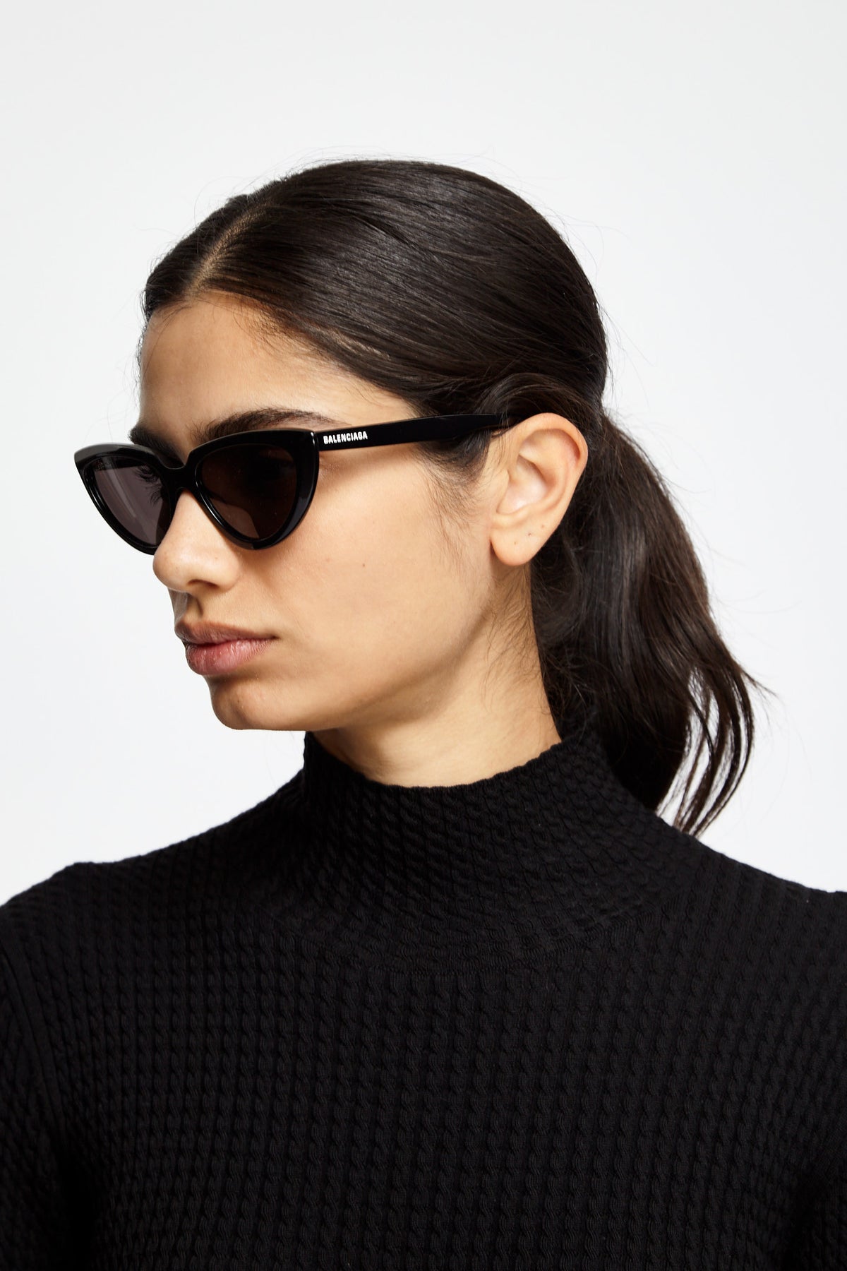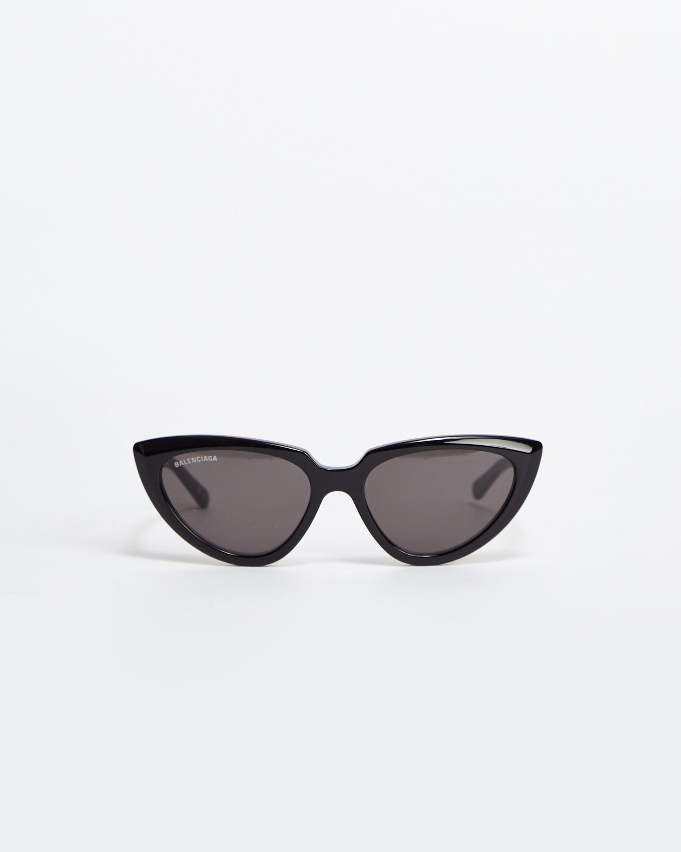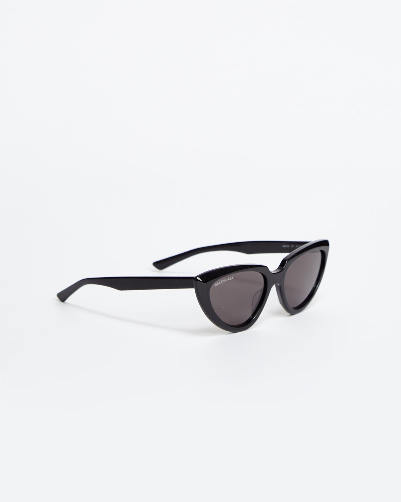 Balenciaga Tip Cat 2.0 in black features a cat eye shape with logo tinted lenses and semi circle cut out at nose bridge.