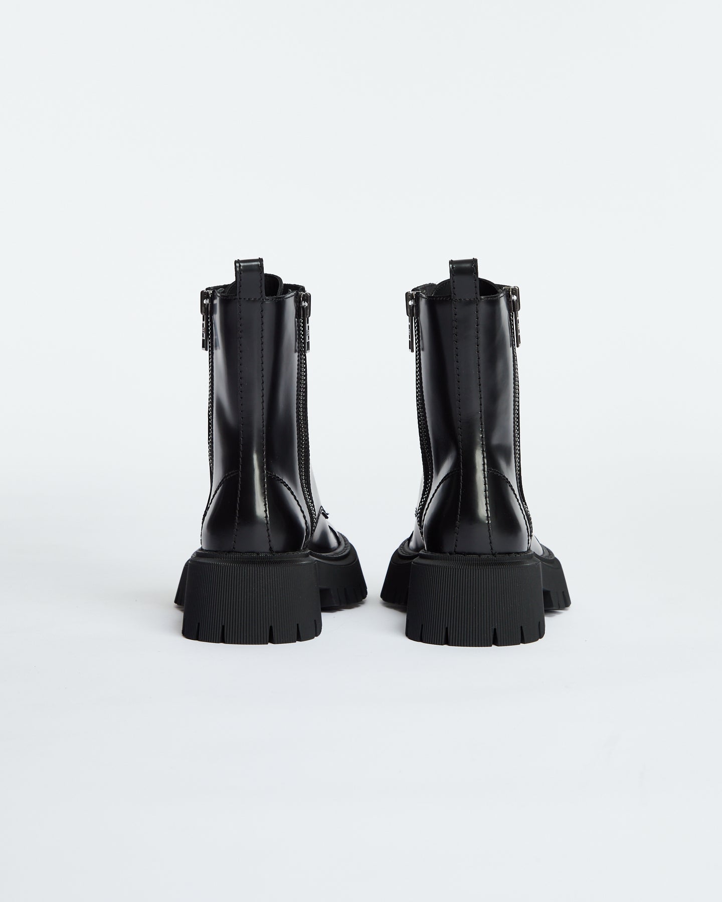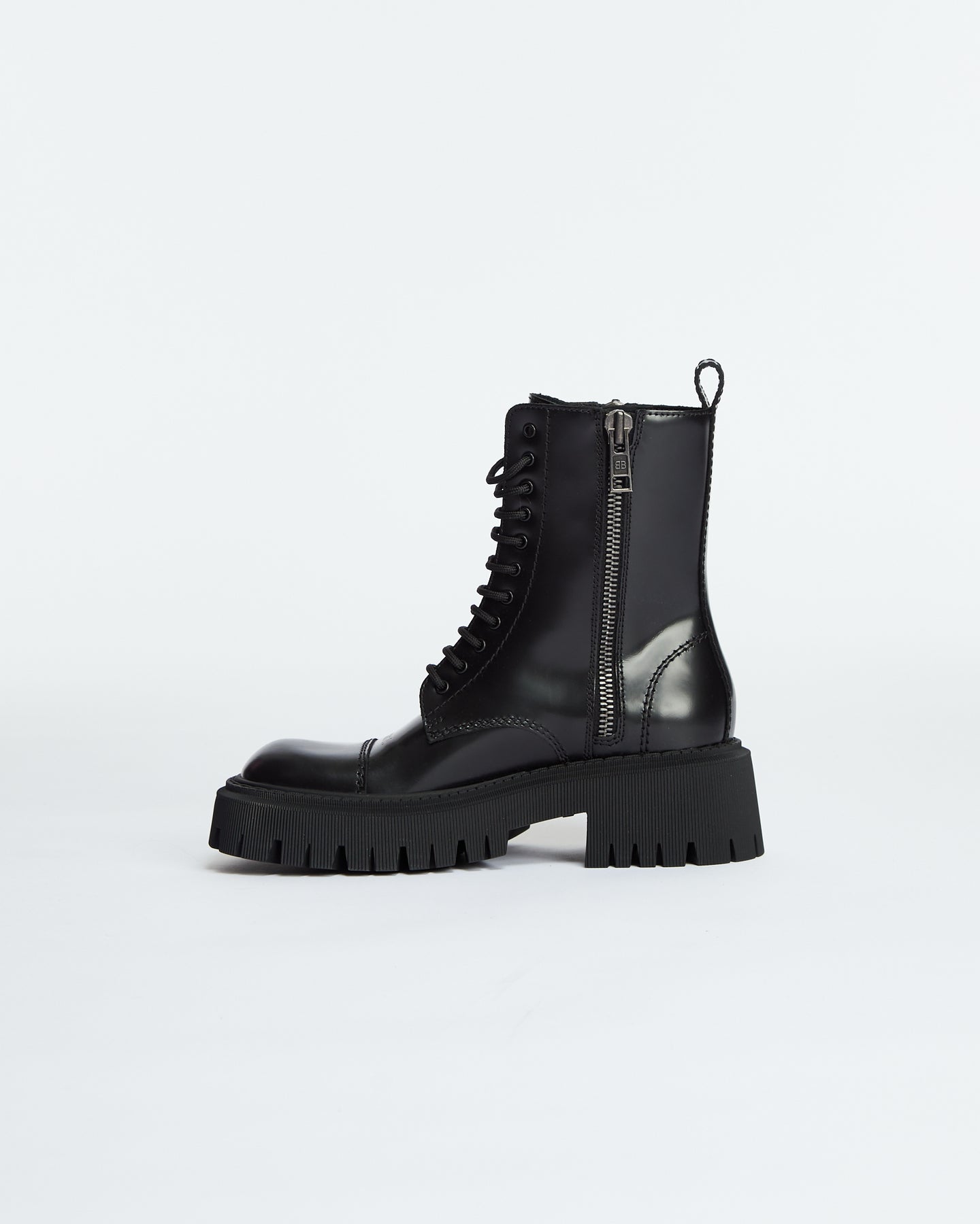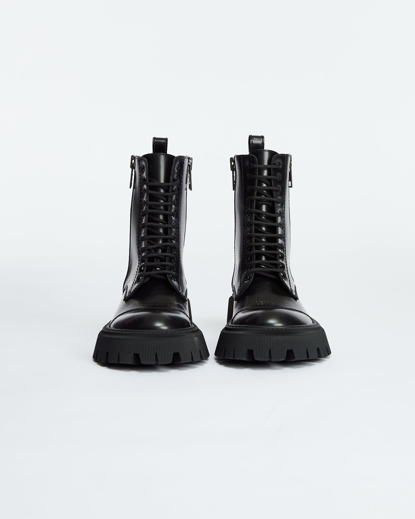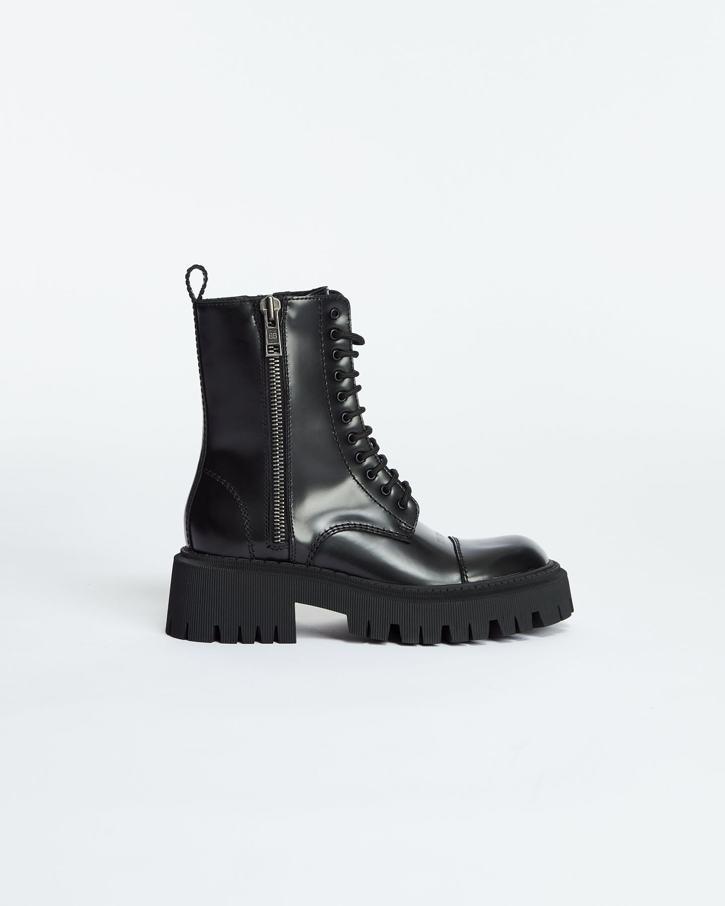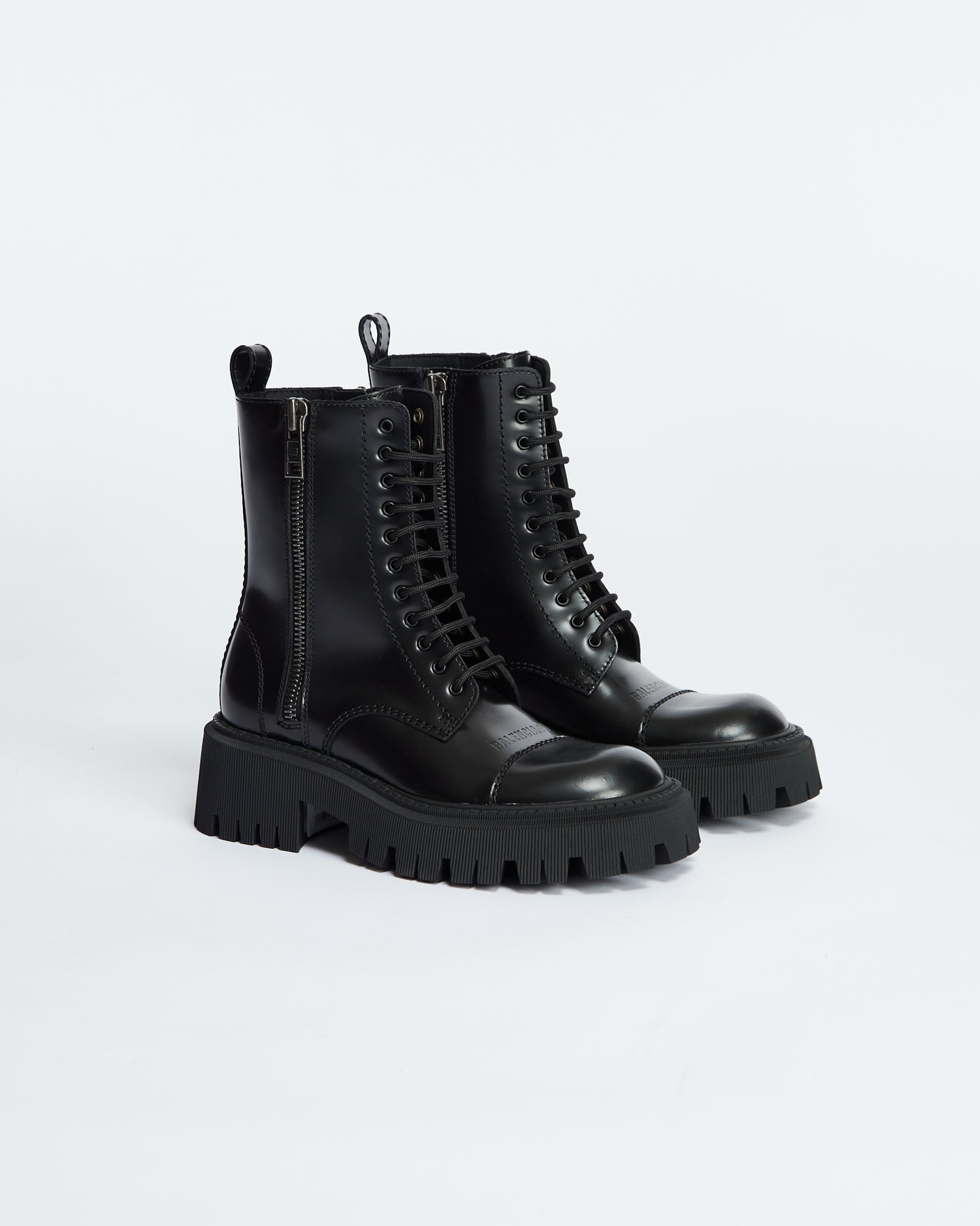 Balenciaga Tractor Lace Up in black features chunky military boot design, extra round toe, double side zippers, visible tone-on-tone top-stitching, 20mm arch, leather loop at back, thick toothed rubber outsole and logo embossed on the upper