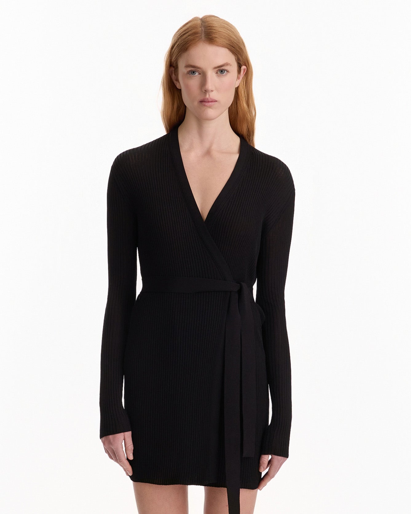 Balenciaga Wrap Cardigan in black features a v-neckline cardigan in a sheer ribbed fabrication. Details include wide wrap belt, long sleeves and clean finishing throughout.