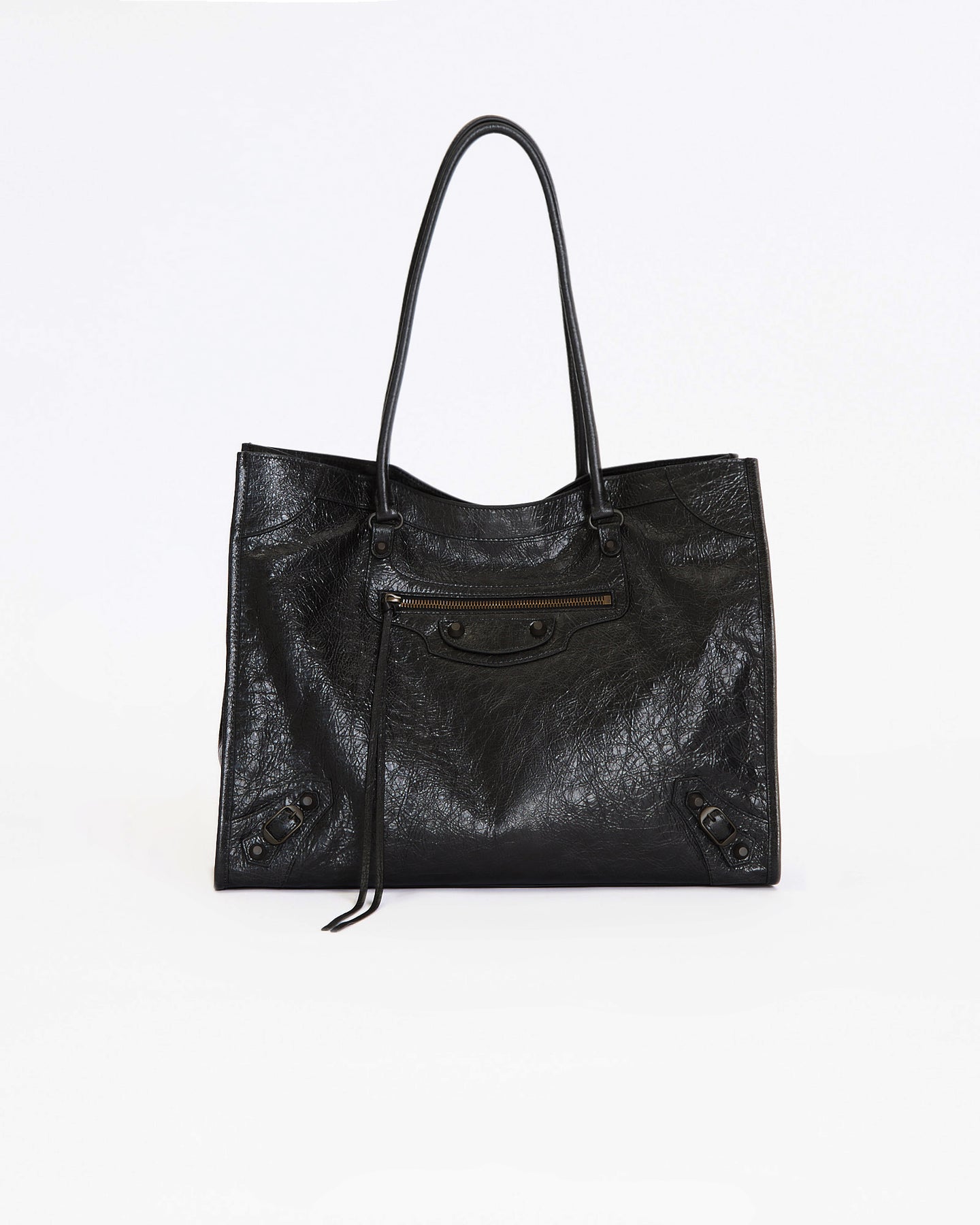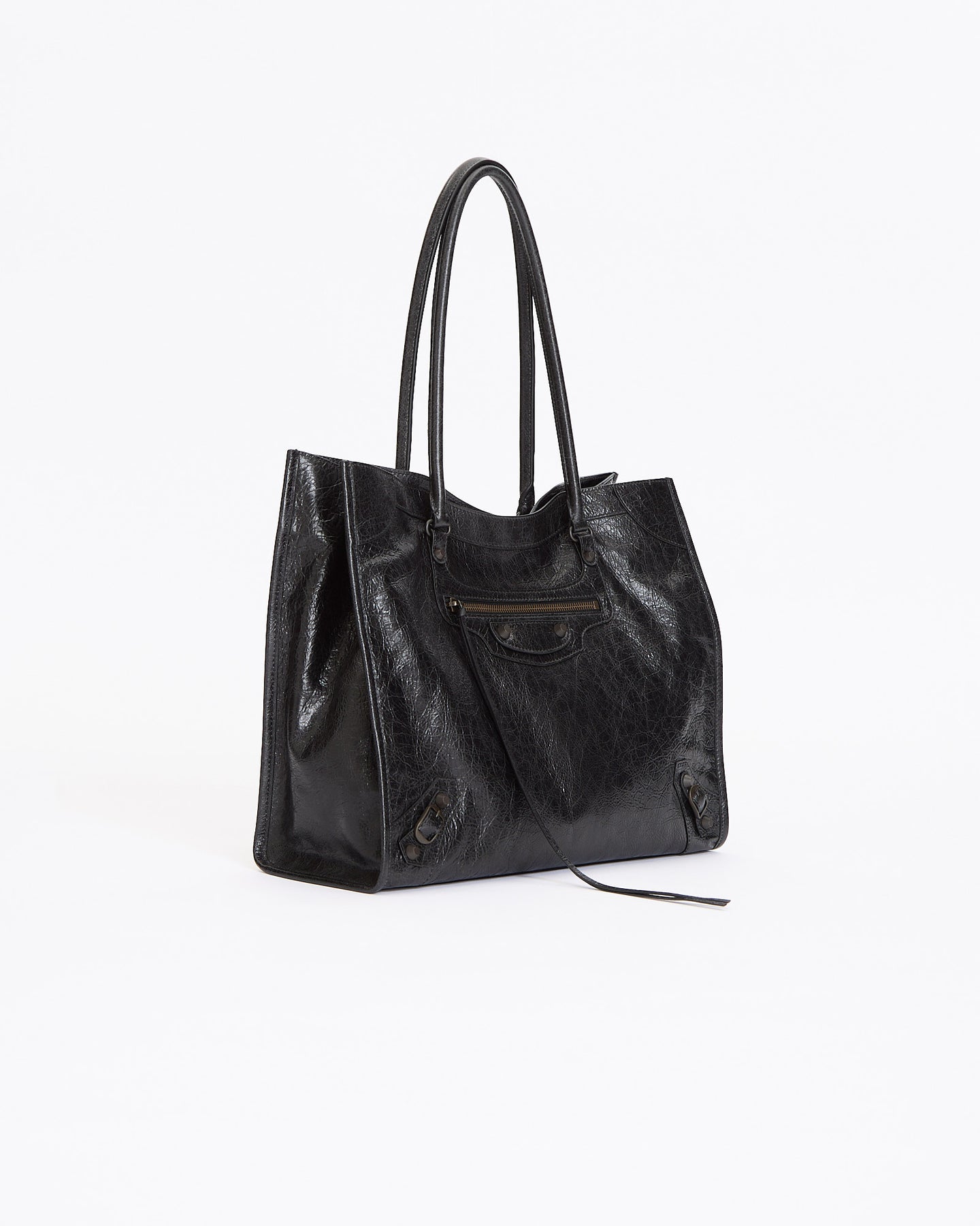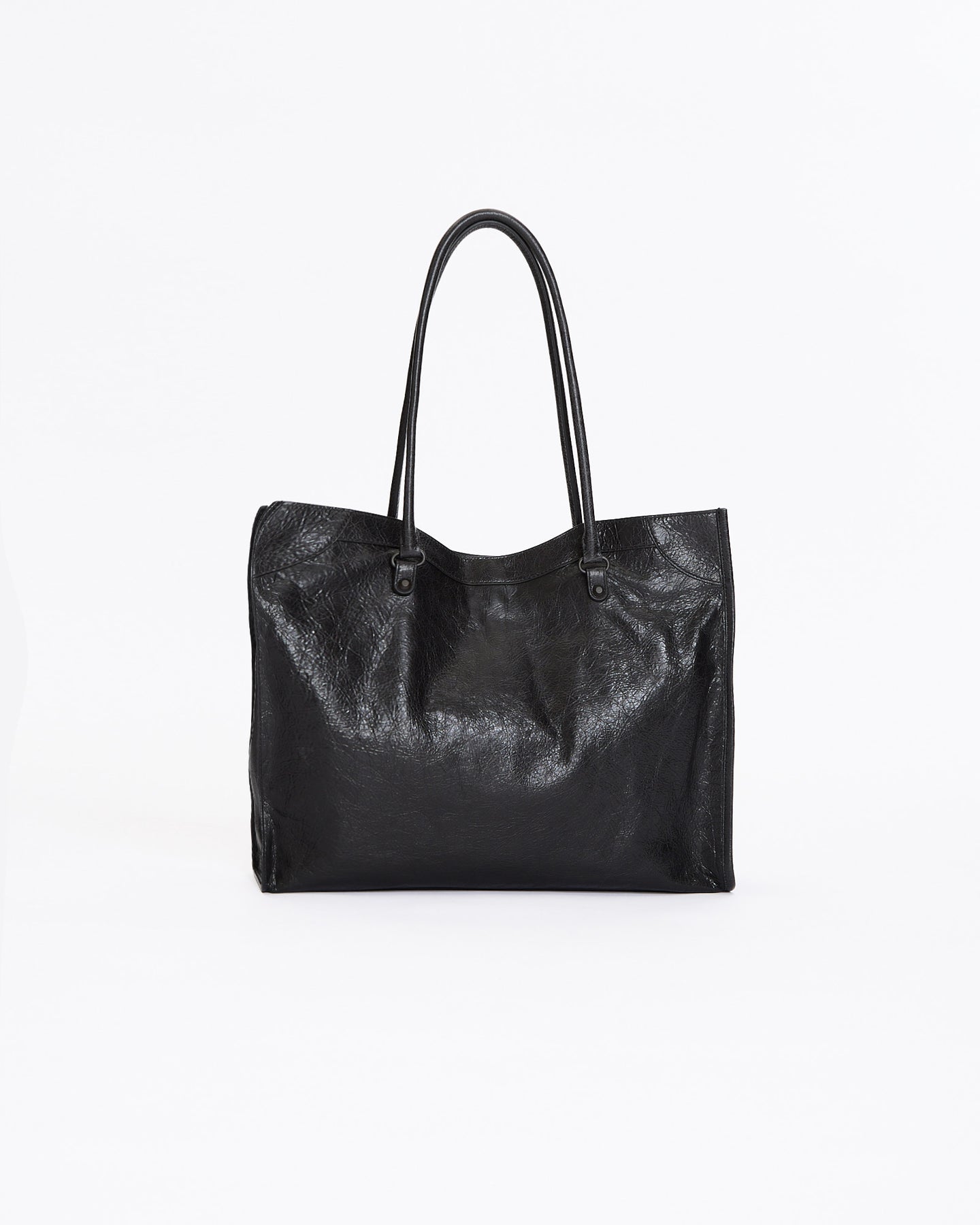 Balenciaga Le City Tote Medium features a classic tote bag style in an arena storico lambskin leather fabrication. Details include to shoulder straps, front zipped pocket with knotted leather puller, brass hardware, magnetic closure and cotton canvas lining.