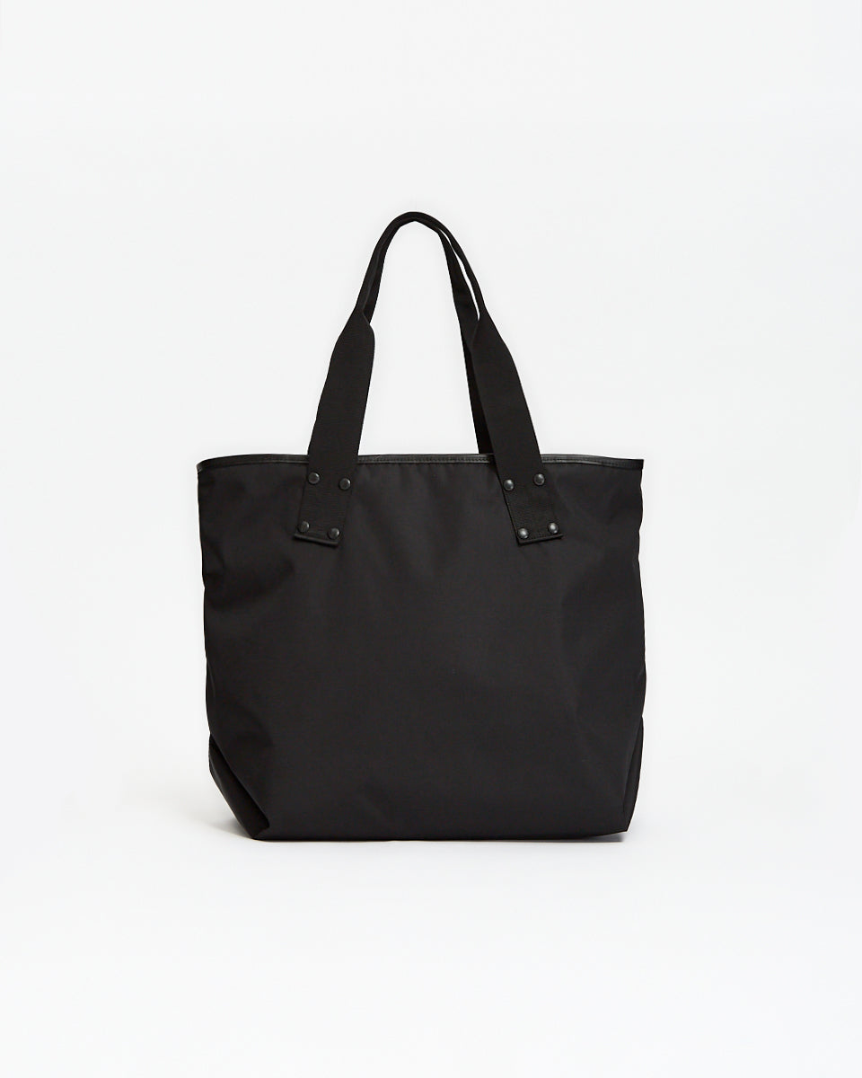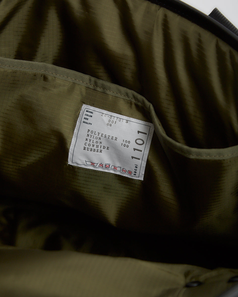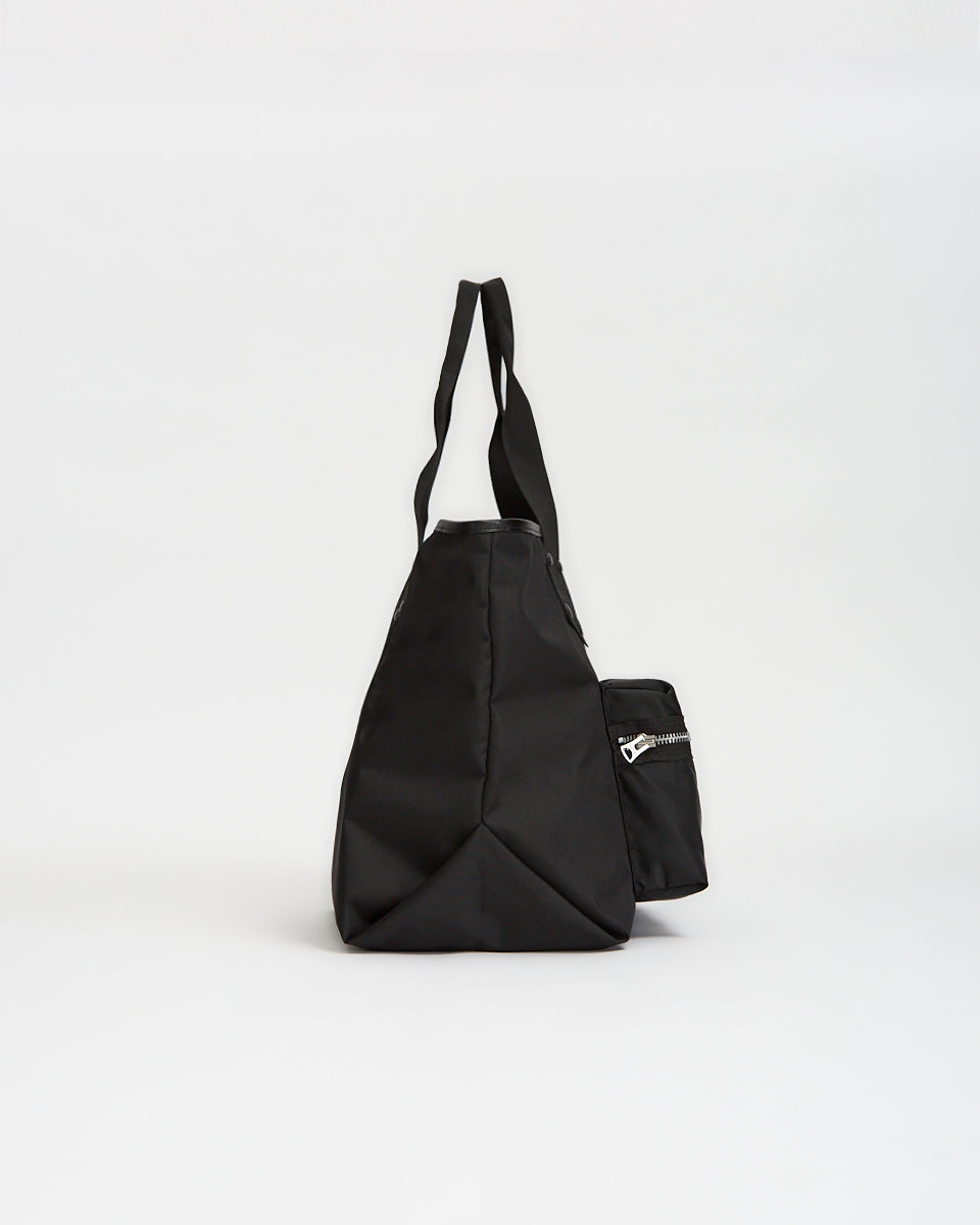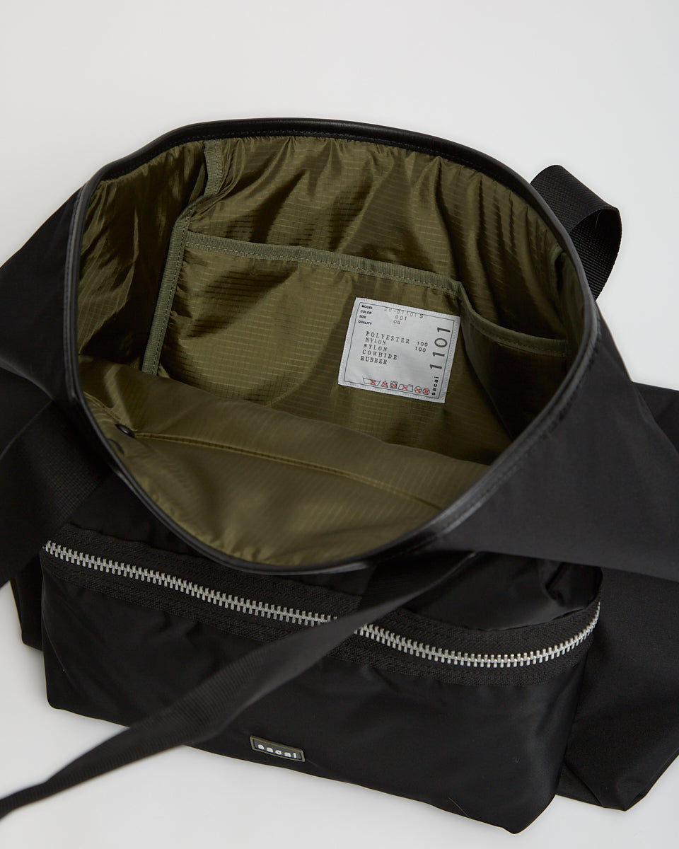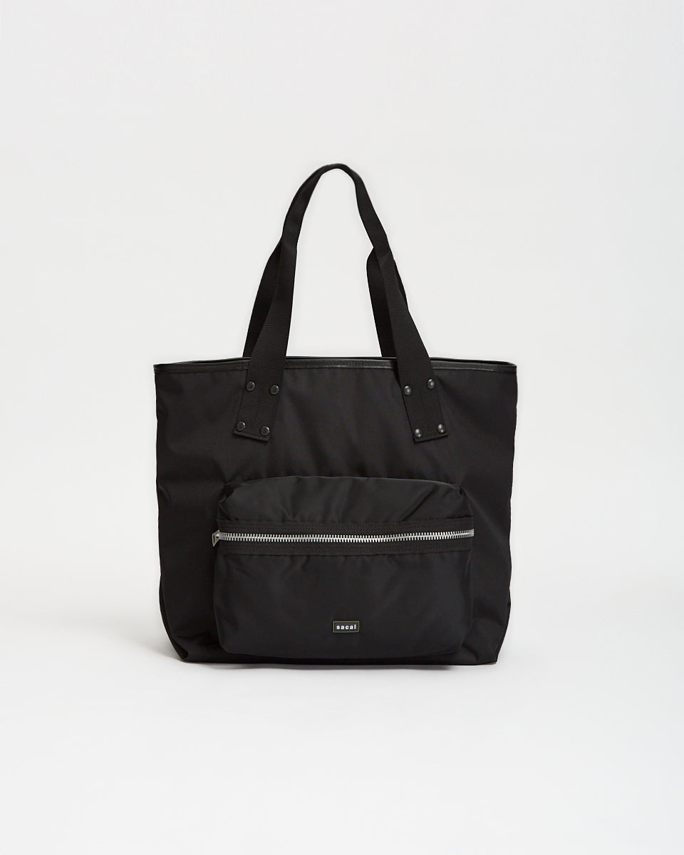 Sacai Pocket Tote Bag Large in black features a classic tote bag silhouette in a nylon fabrication. Details include twin carry handles, front zip pocket, sacai rubber logo and nylon ripstop lining.
