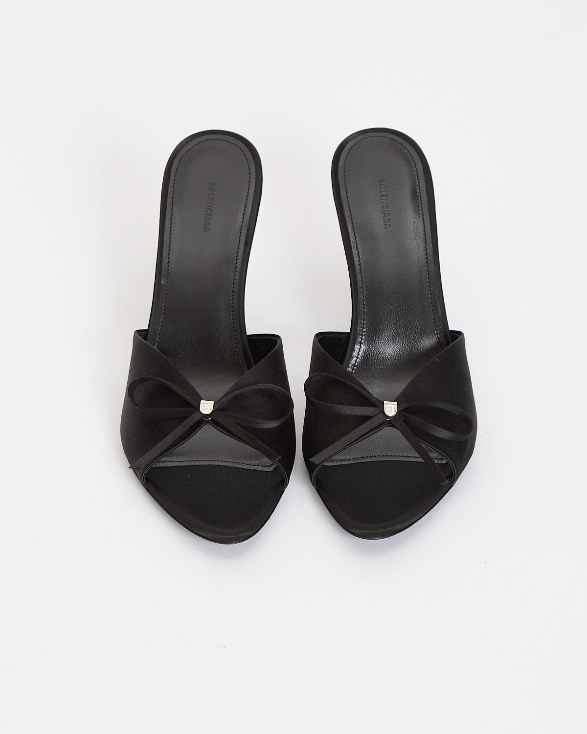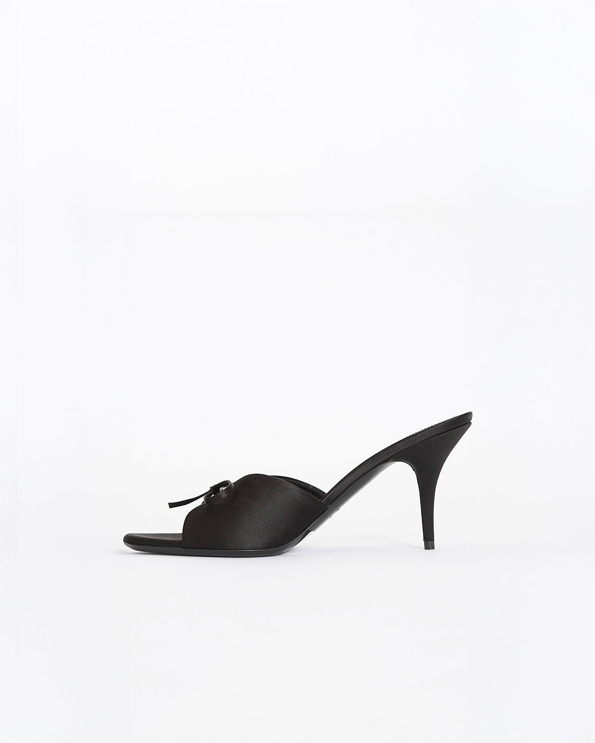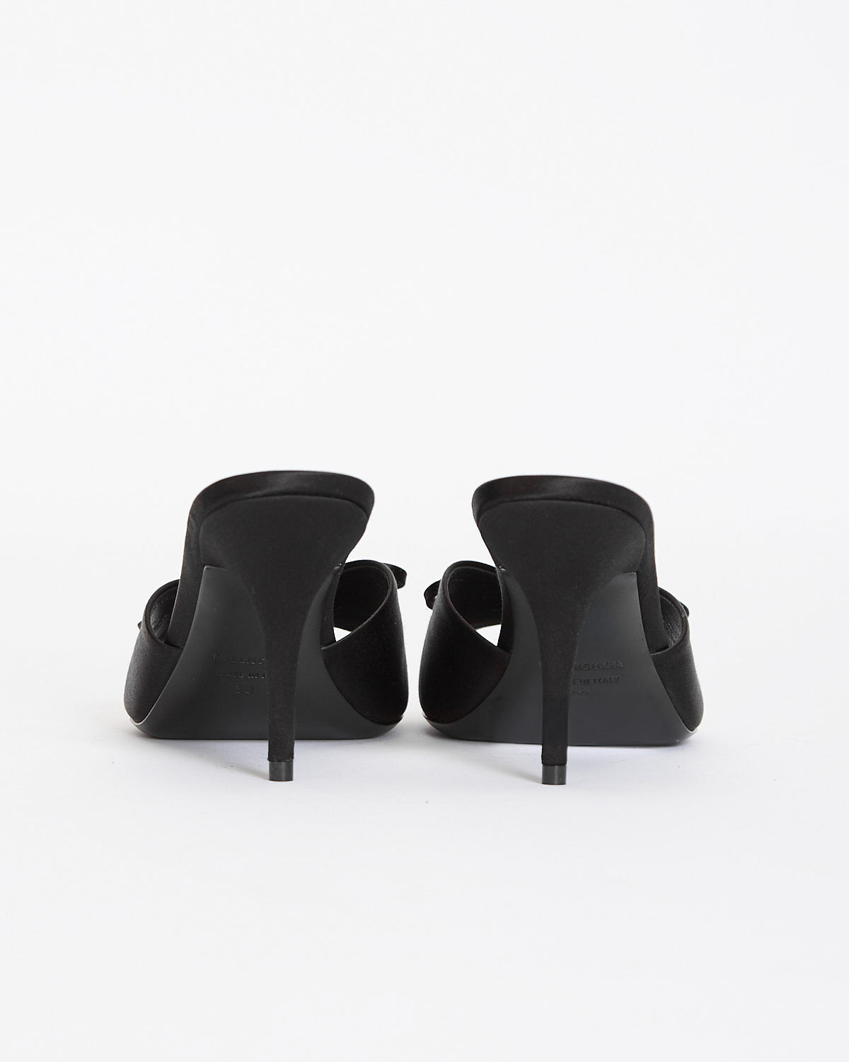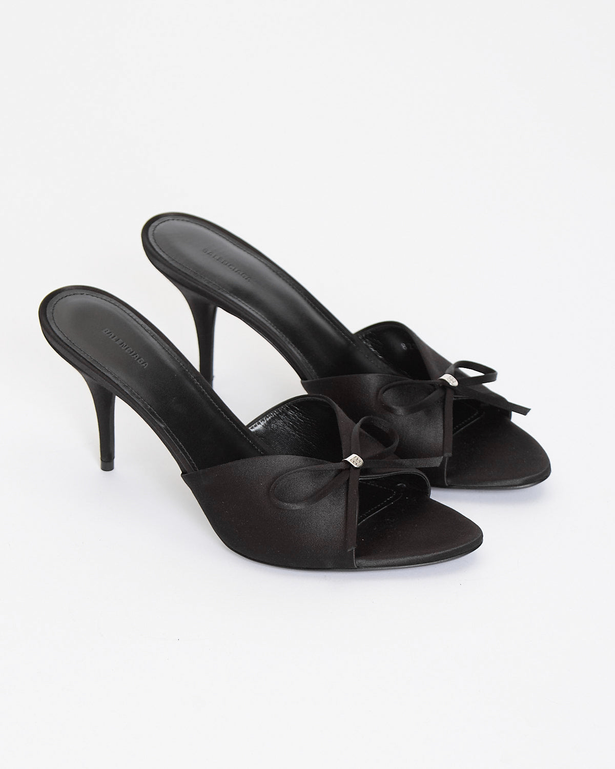 Balenciaga Knife Bow Sandal in black features an almond open toe strap with bow. Details include rounded toe and silver hardware.