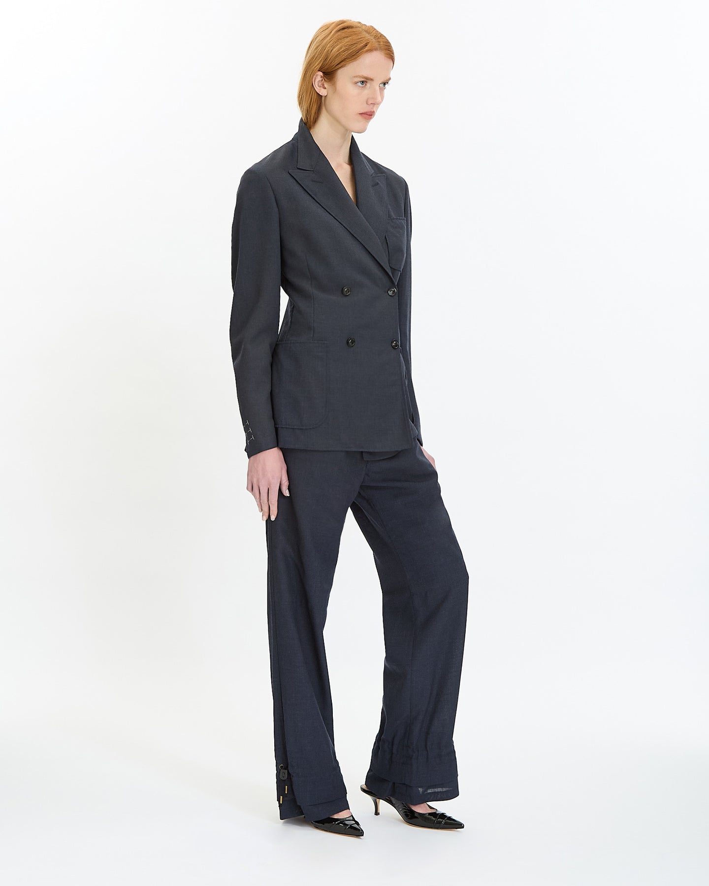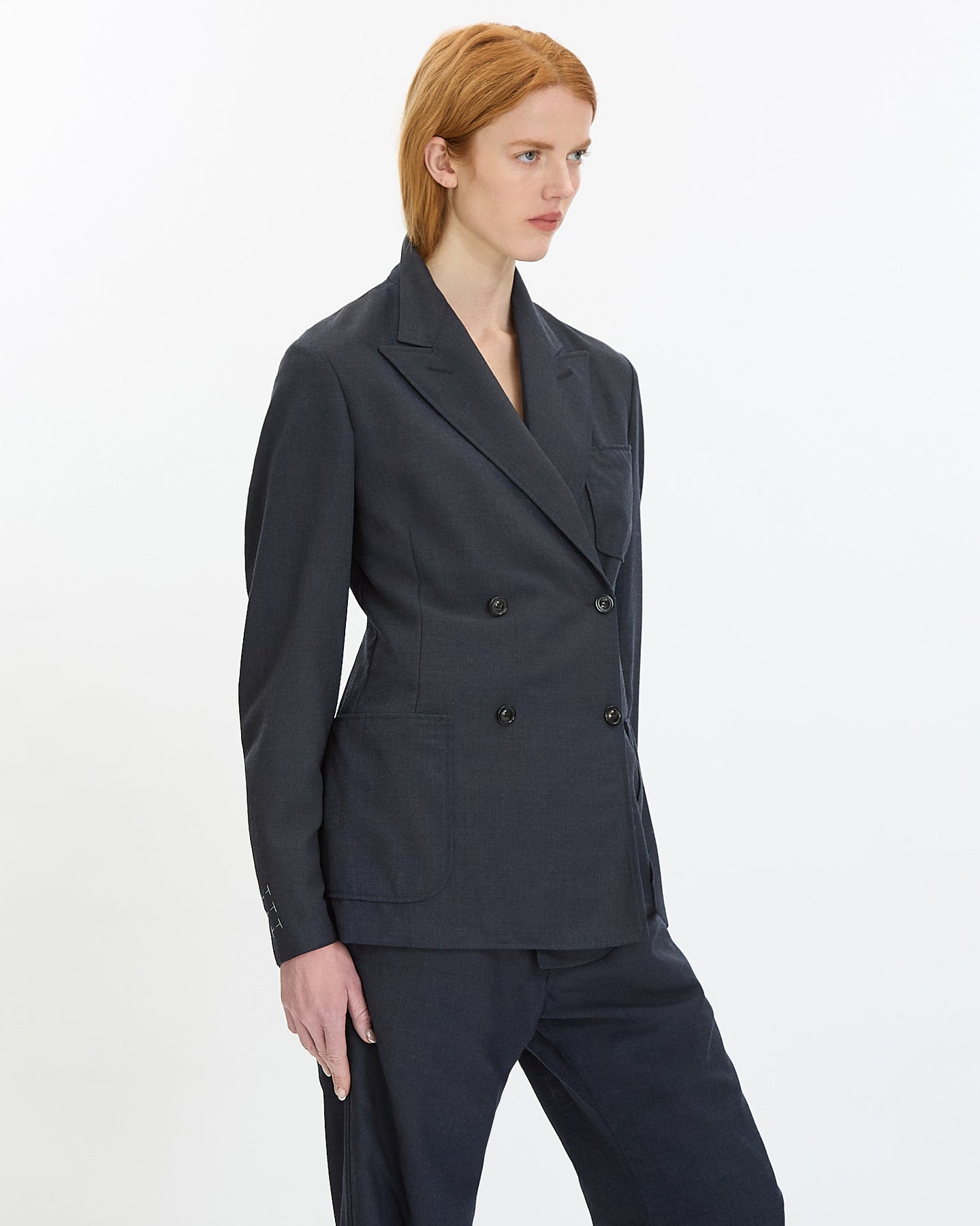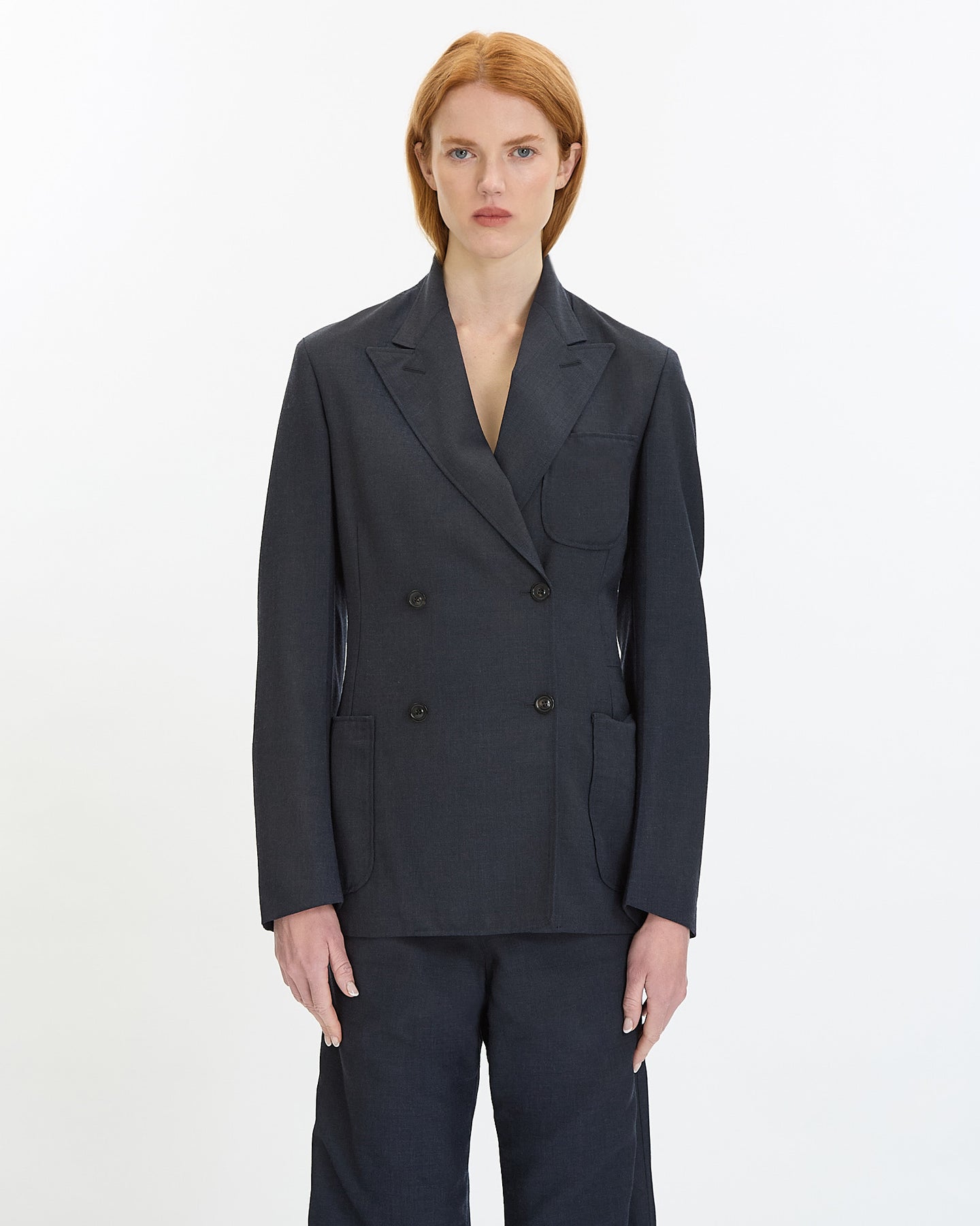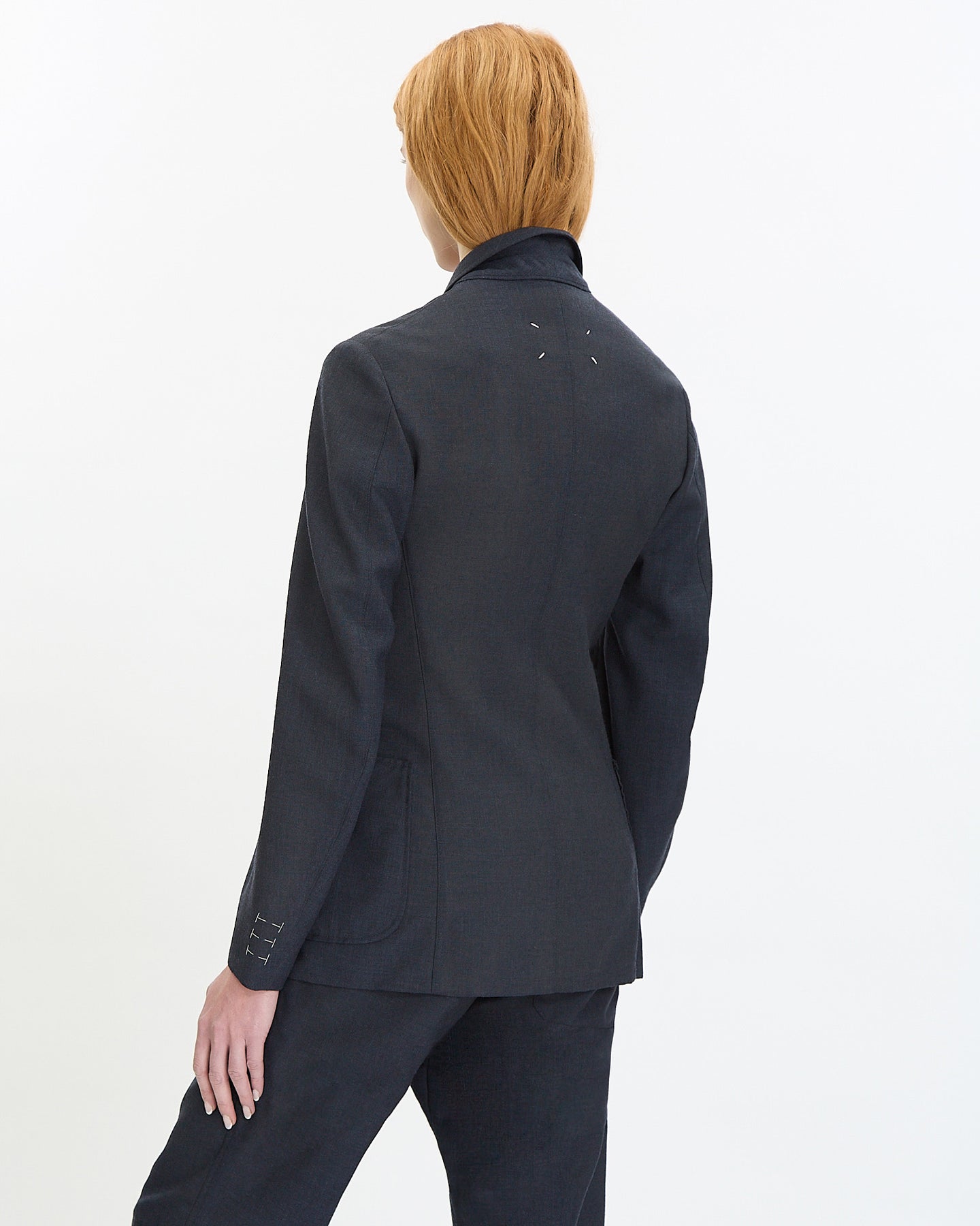 Maison Margiela Wool Blazer in dark navy features a double breasted design in a lightweight wool fabrication. Details include notched lapel, front chest pocket, front welt pockets and classic four stitches at back.