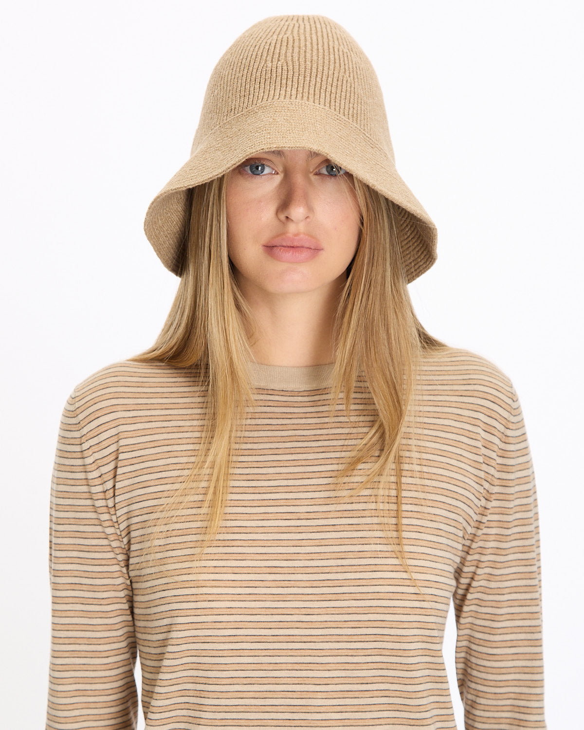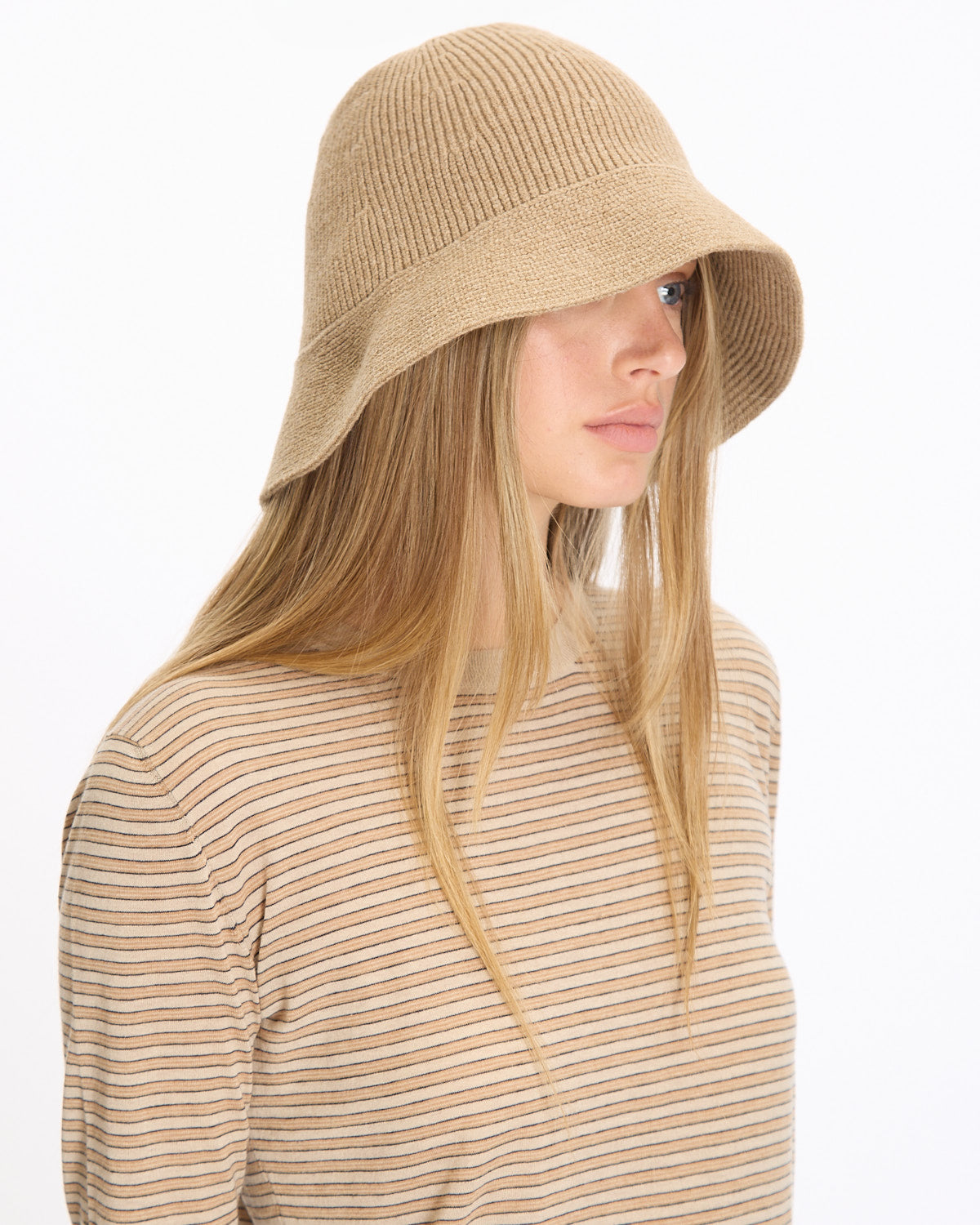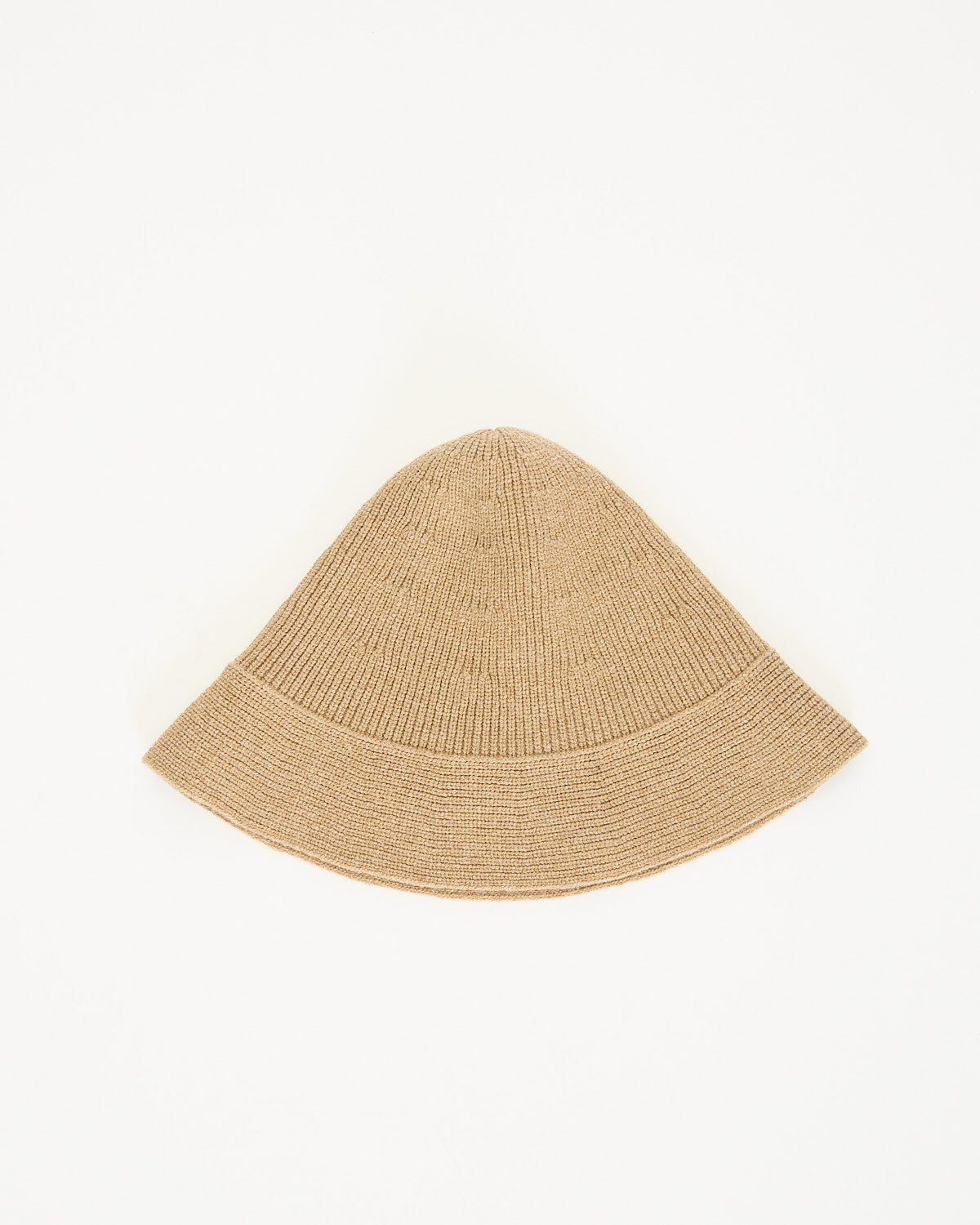 The Row Falken Hat in beige features a structured beanie silhouette. Details include a small brim in a tightly knit virgin wool blend fabrication.