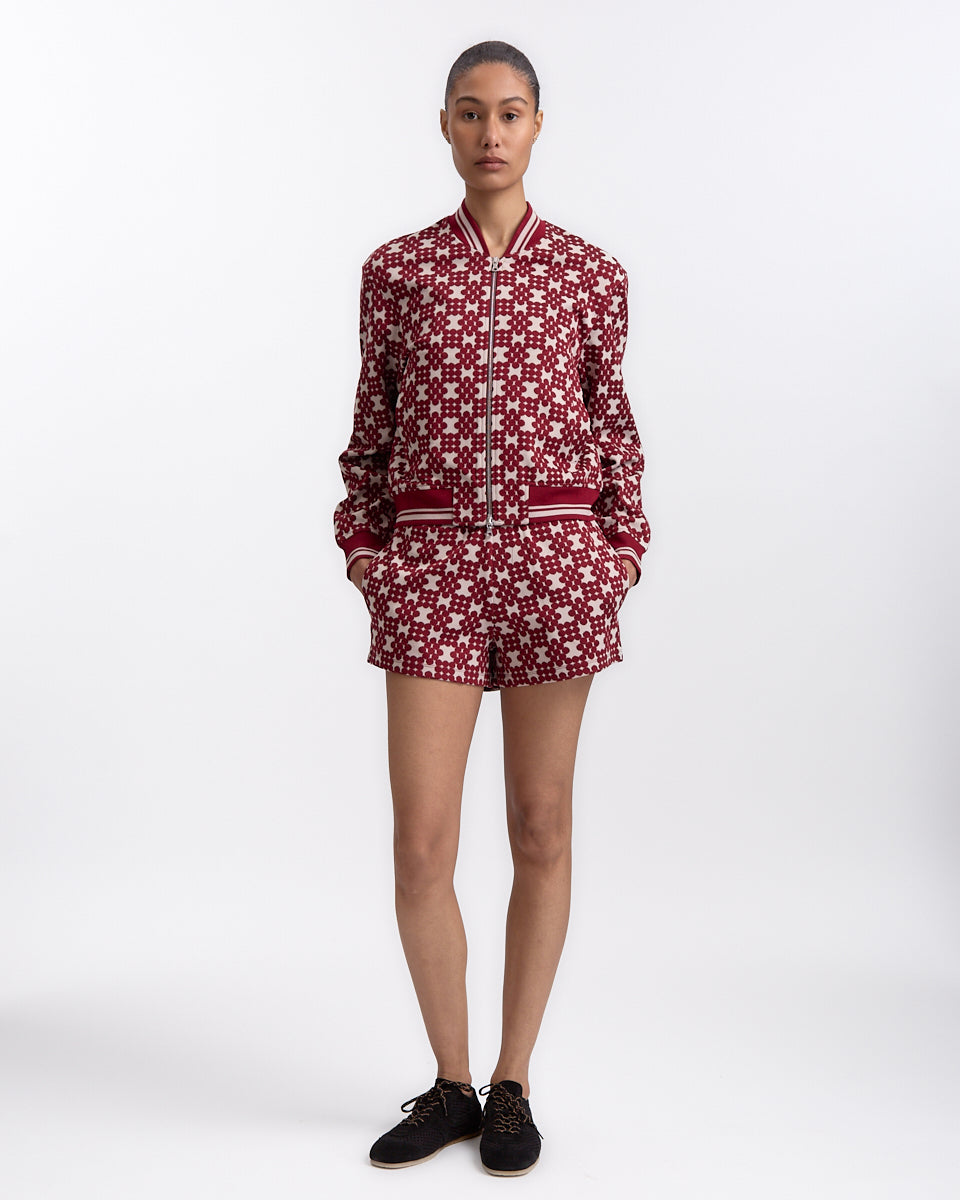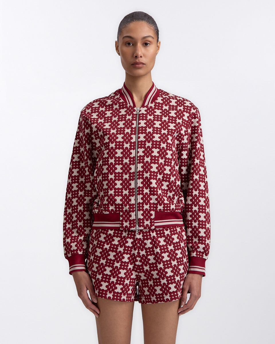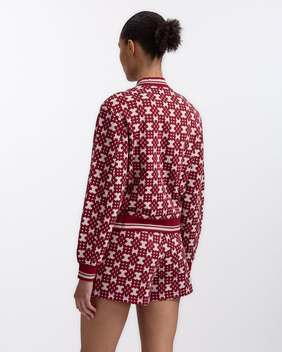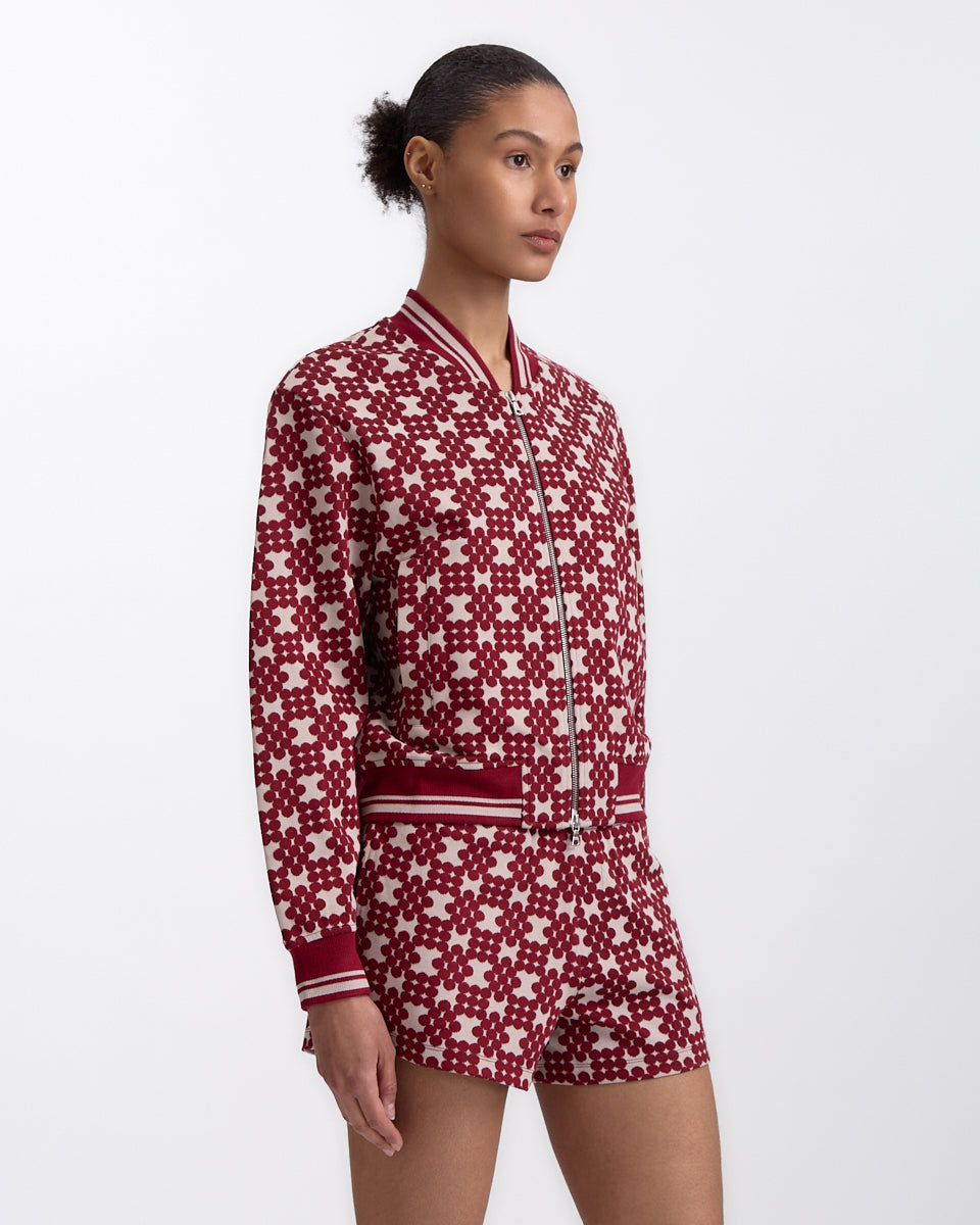 Dries Van Noten Helan Jacket in burgundy features a cropped bomber jacket in a jacquard fabrication. Details include front zip closure, geometric pattern and varsity ribbed collar, sleeve cuffs and hem.