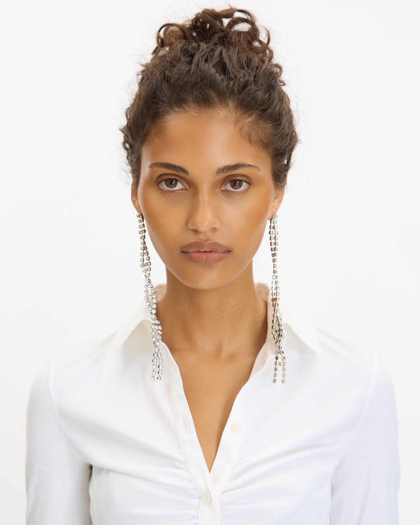 Balenciaga Riveria Earrings in shiny crystal/silver features a silver brass pendant earrings in a supple chain silhouette with inlaid crystal rhinestones.