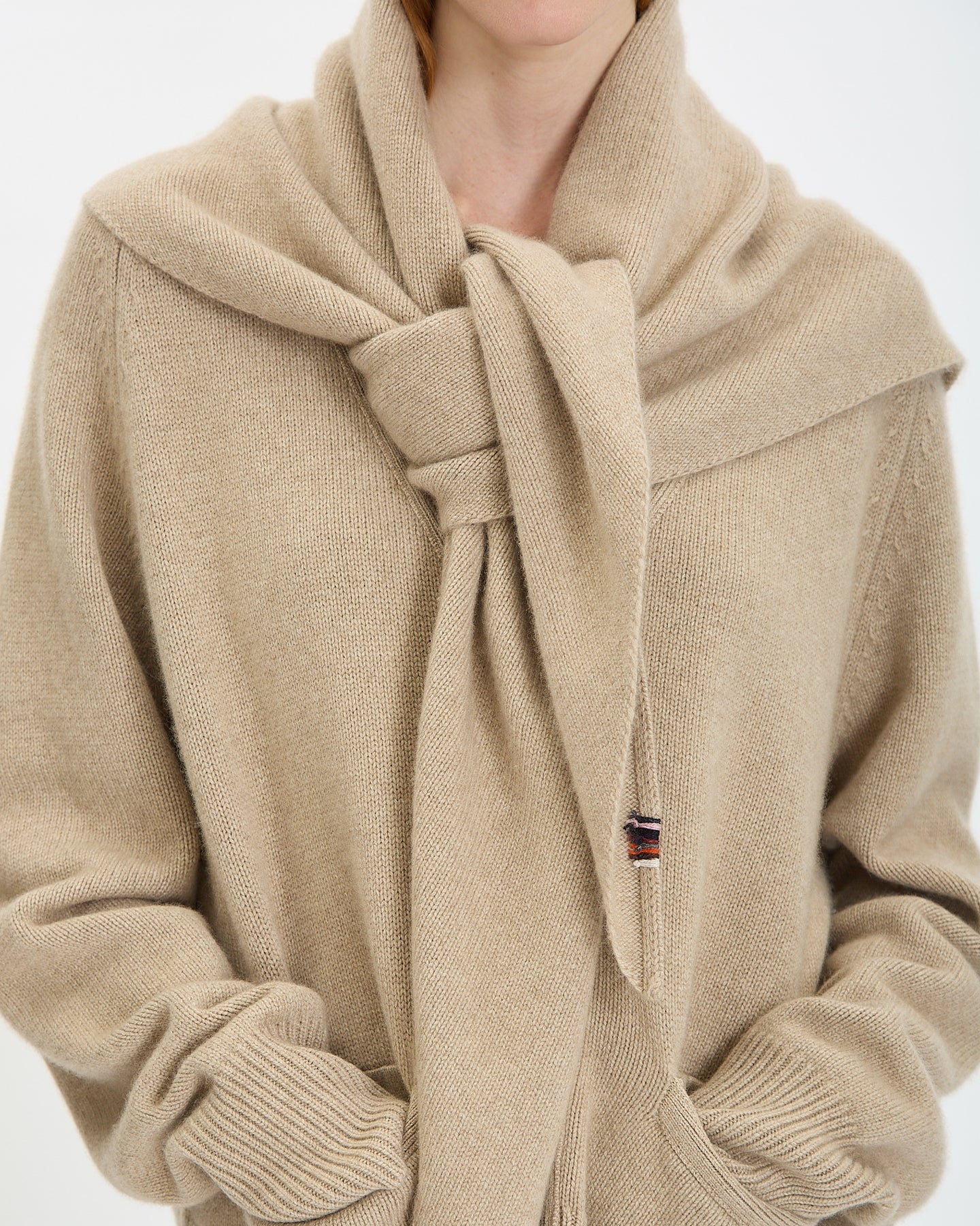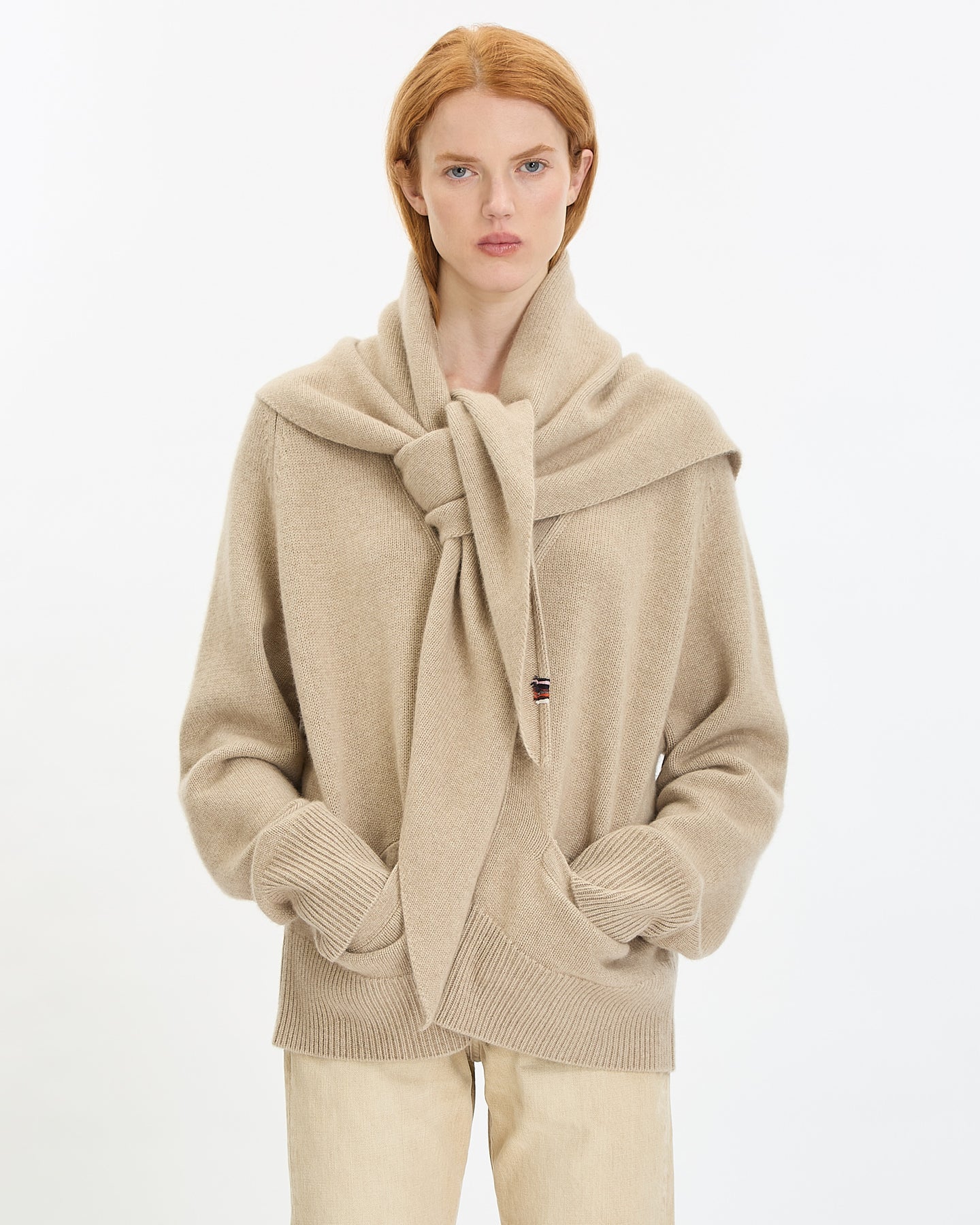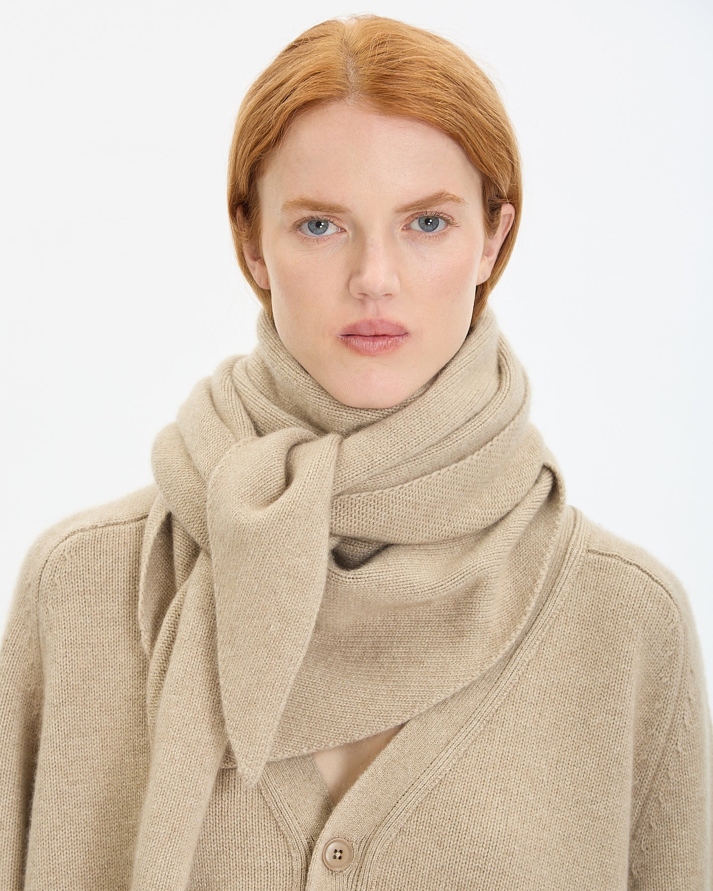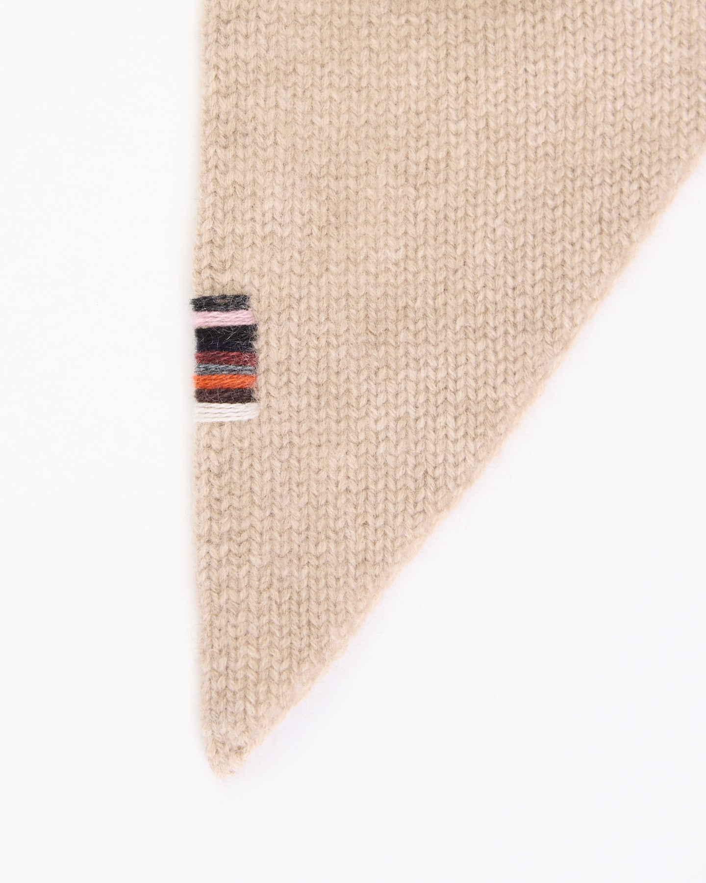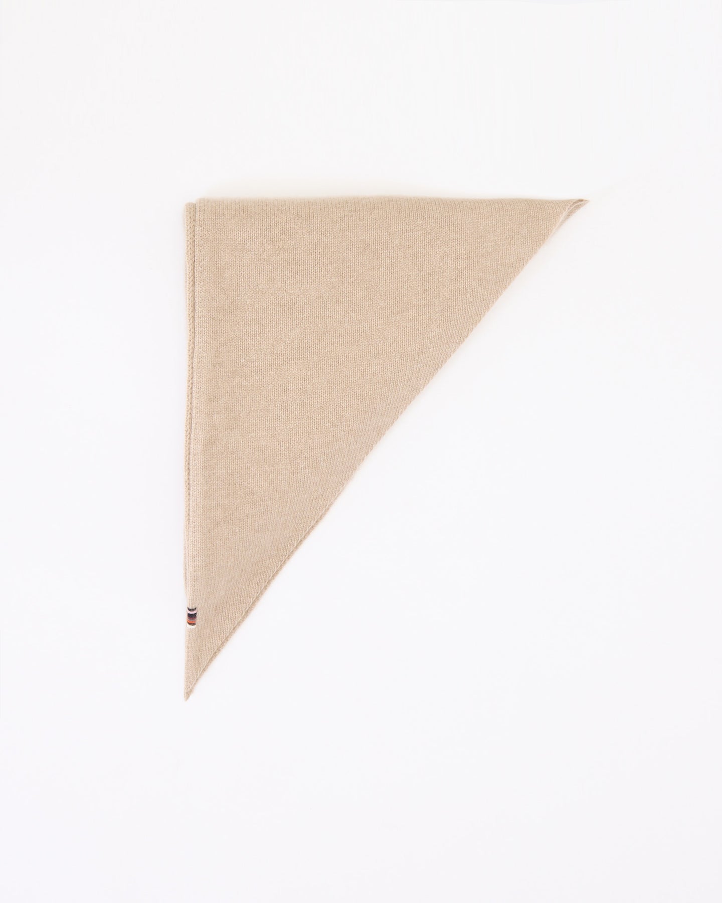 Extreme Cashmere N°201 Witch 2 in oat features a triangle shape scarf with rolled edges and wearable versatility in a heavy weight cashmere fabrication.