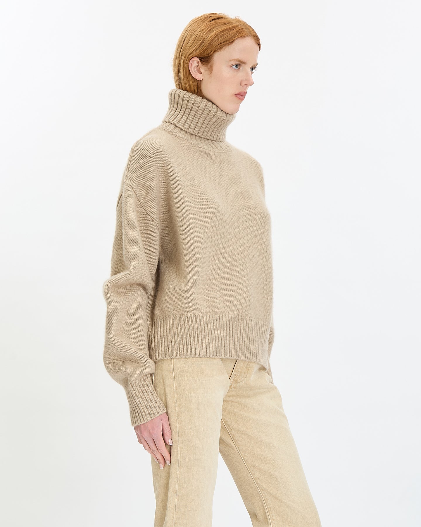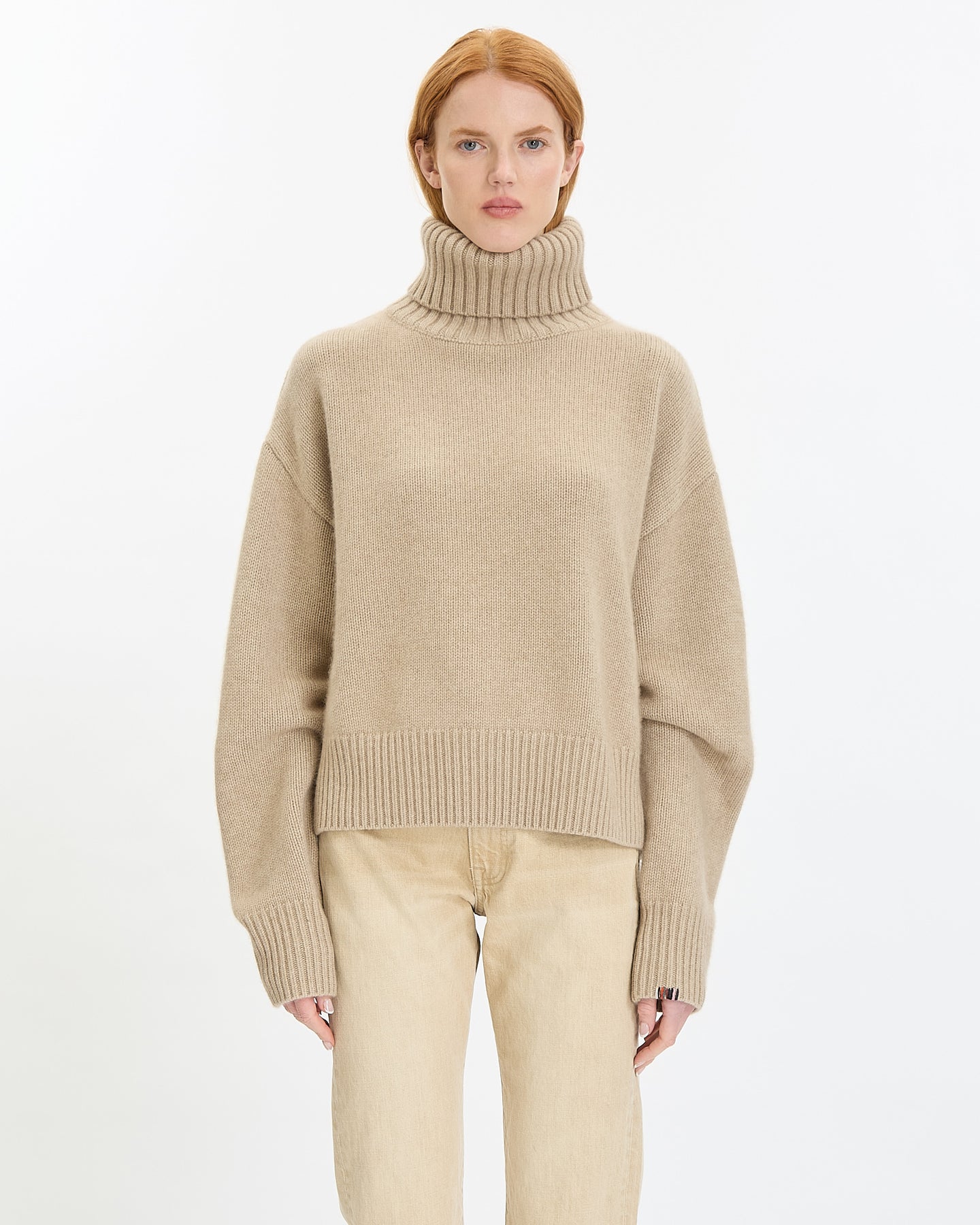 Extreme Cashmere N°434 Crop Xtra Sweater in oat features a comfortable fit in a heavy weight cashmere fabrication. Details include dropped shoulders, thick ribbed turtleneck and ribbed finishing at hem and sleeve cuffs.
