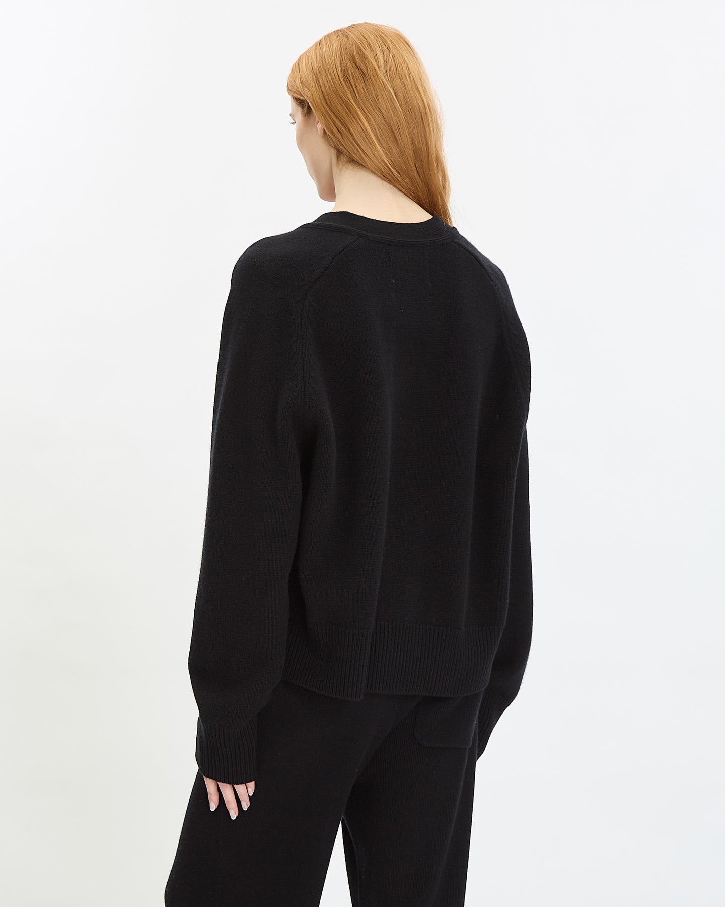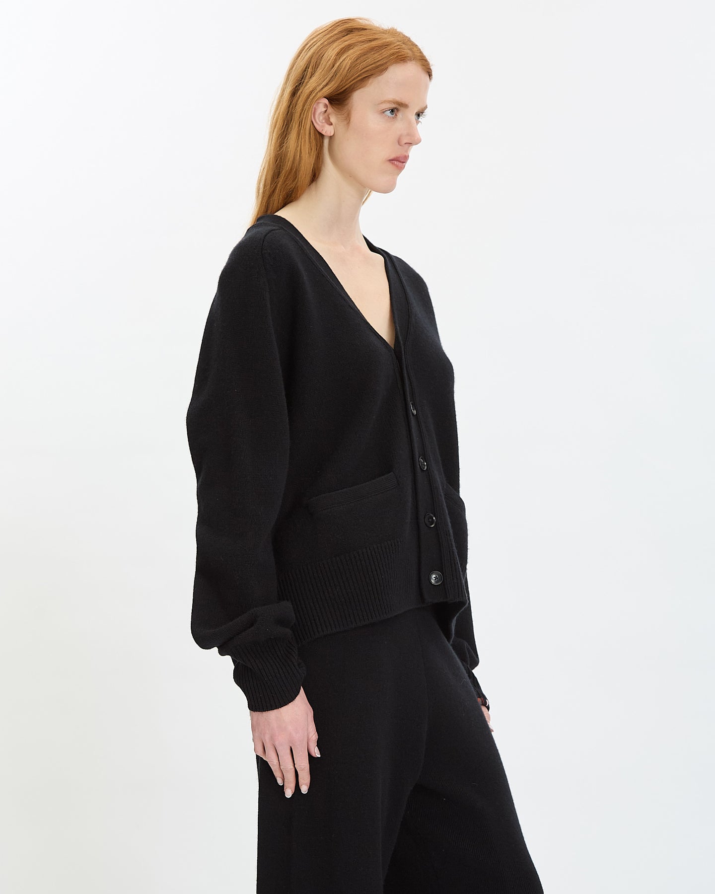 Extreme Cashmere N°437 Papilli Short Cardigan in raven features a comfortable fit in a heavy weight cashmere fabrication. Details include button closures, v-neckline, front patch pockets and ribbed finishing at neckline, hem and sleeve cuffs.