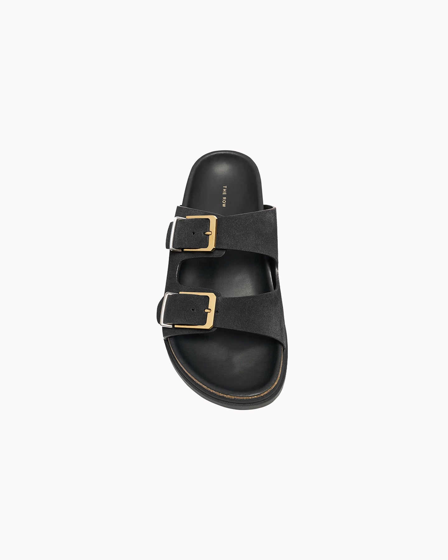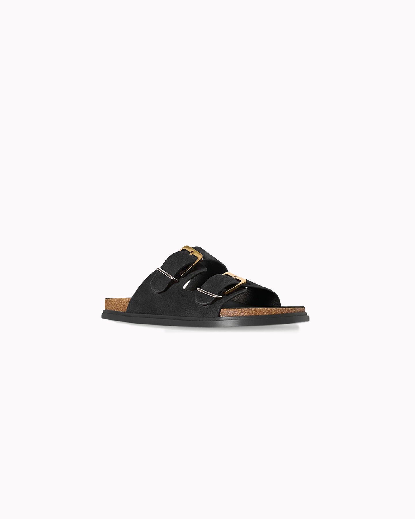 The Row Buckle Slide in black features a double strap sandal in a calfskin suede fabrication. Details include adjustable sandal straps, two tone metal buckles and contoured cork footbed.
