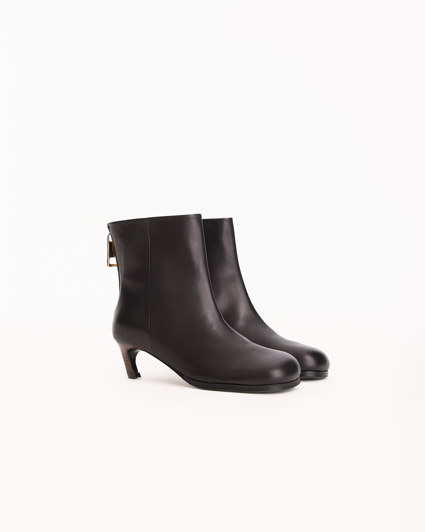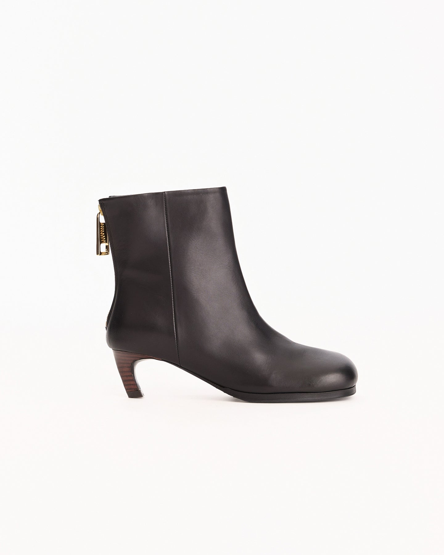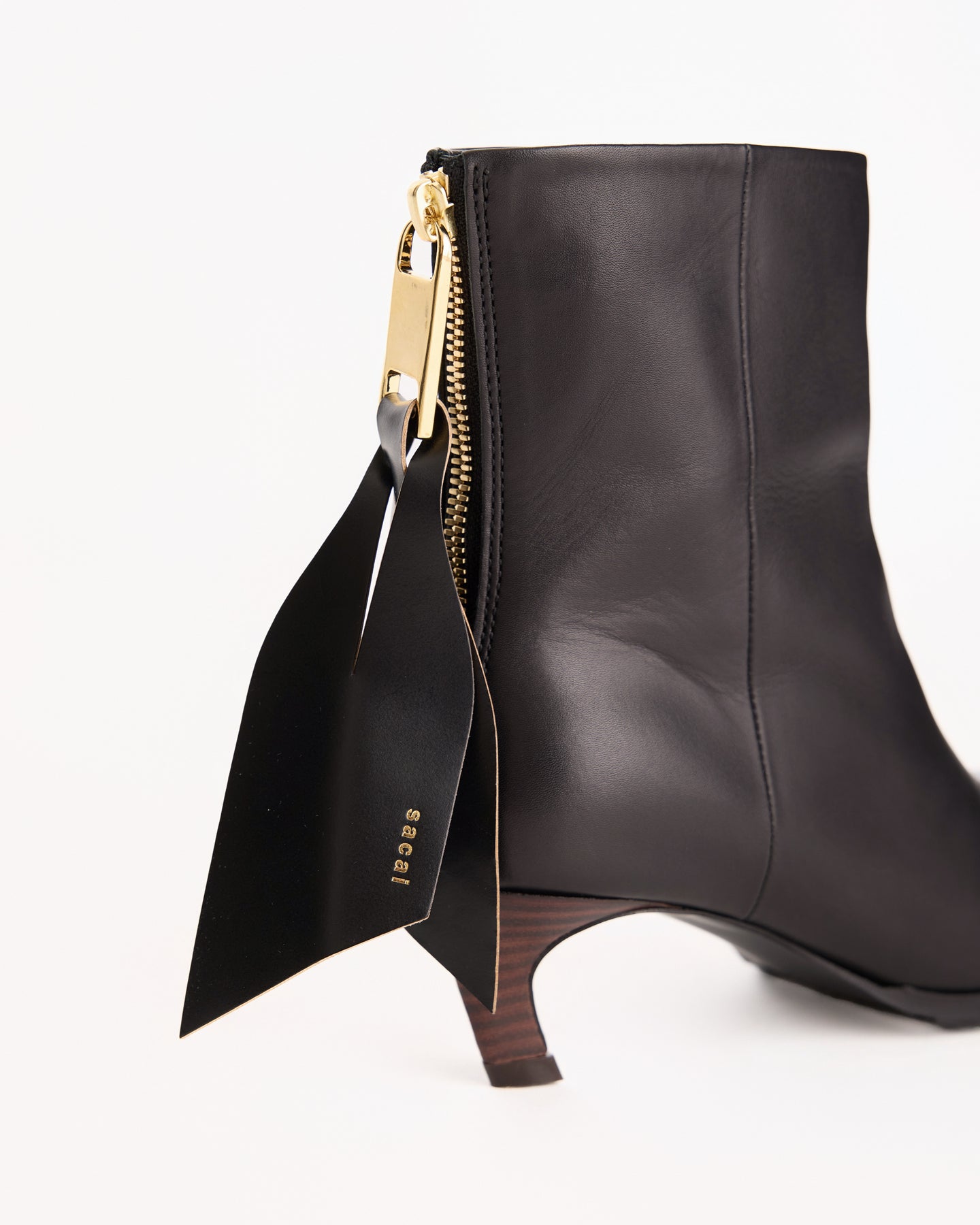 Sacai Puller Short Boots in black features an ankle boot in a smooth leather fabrication. Details include square toe, low dark wood heel and back gold hardware zipper with leather pull.