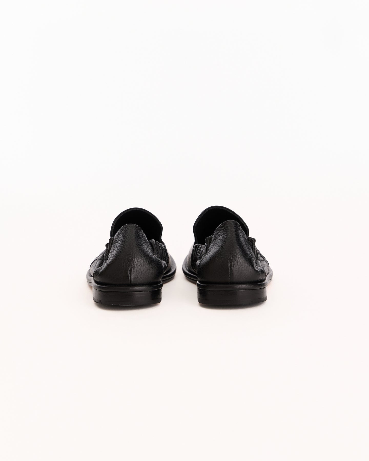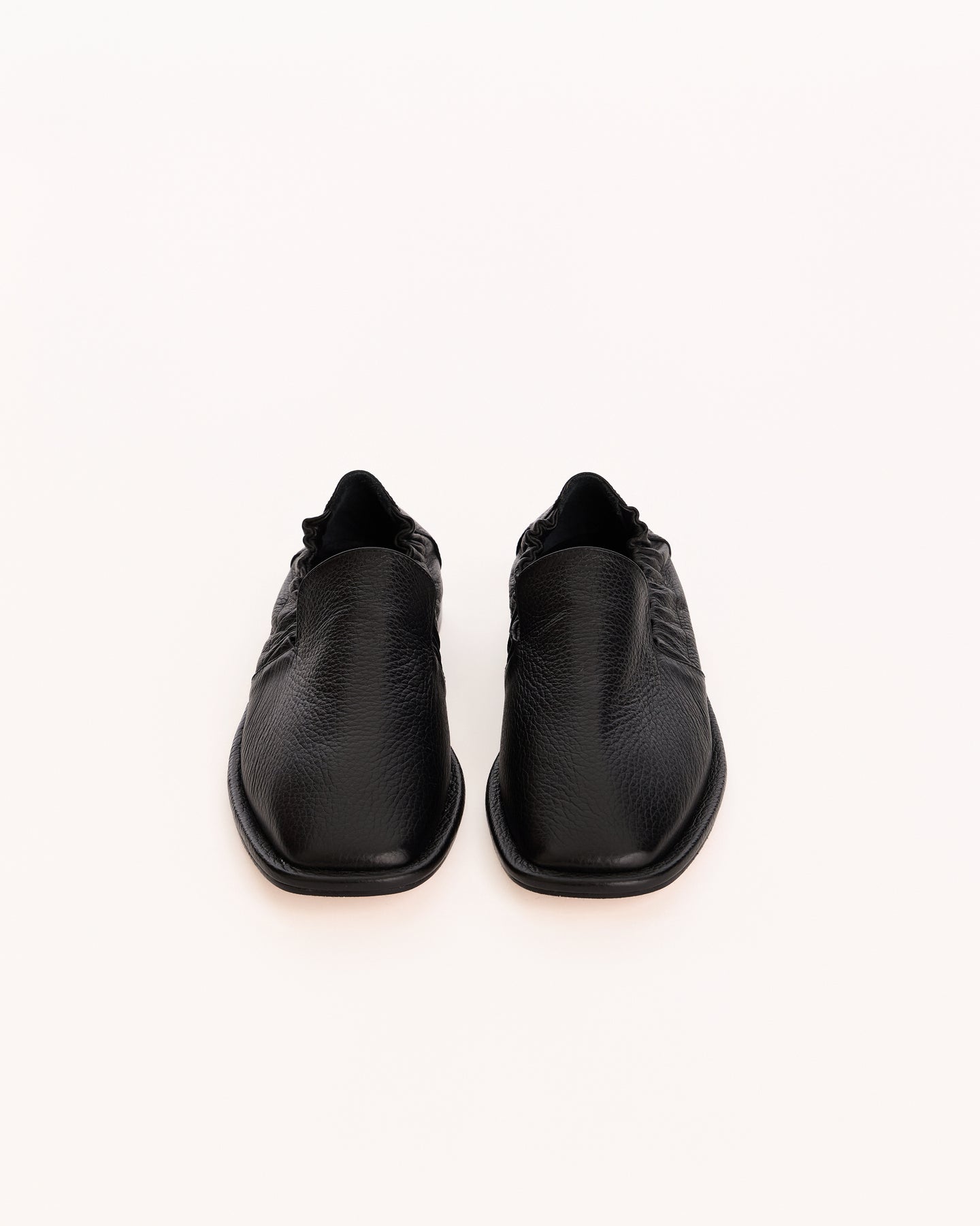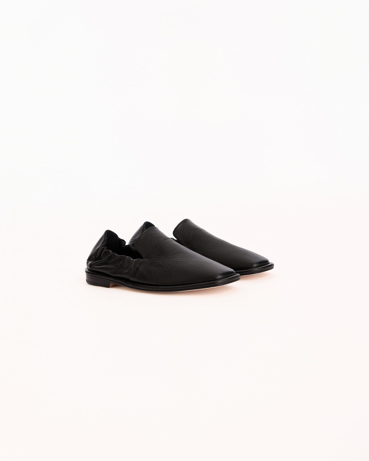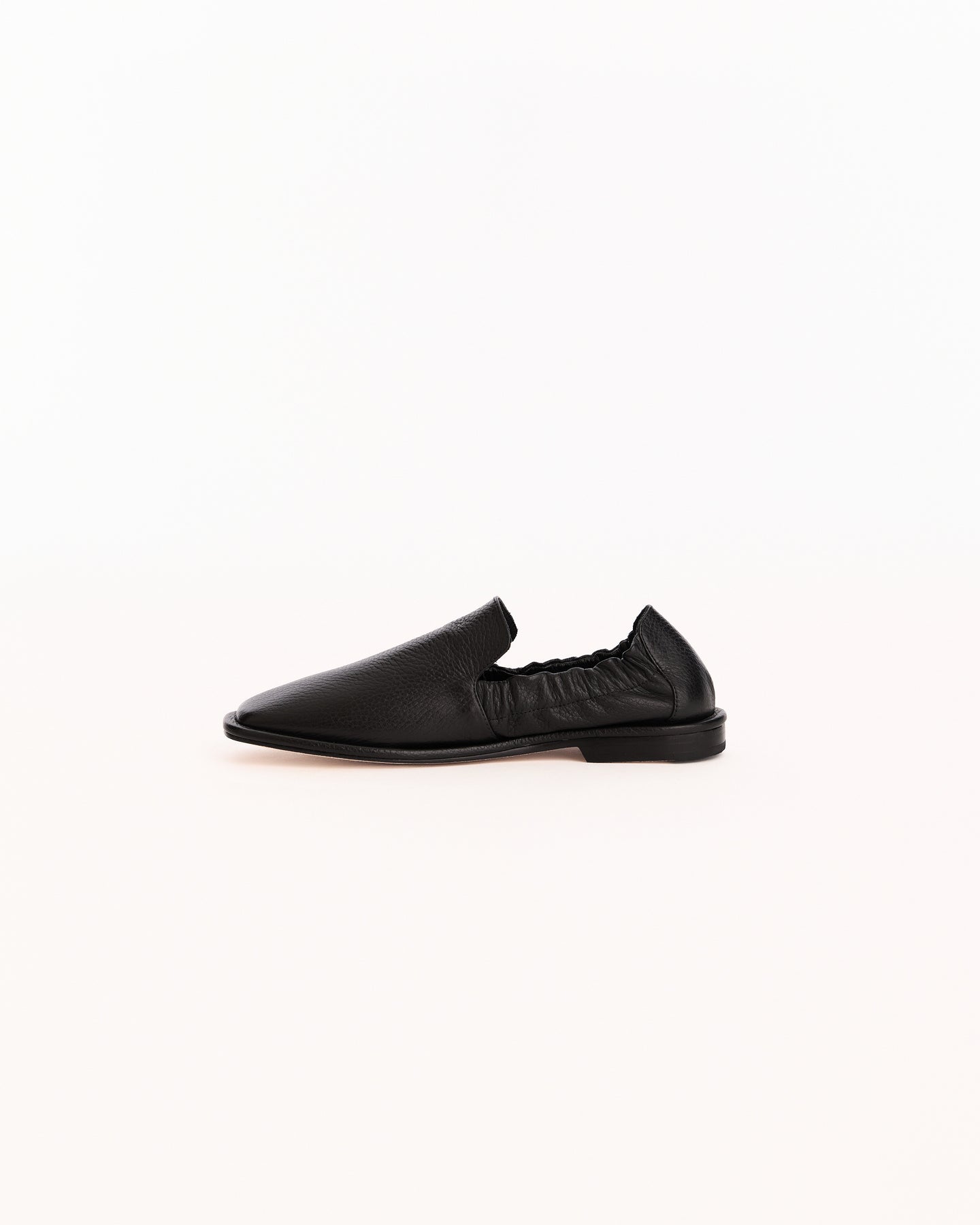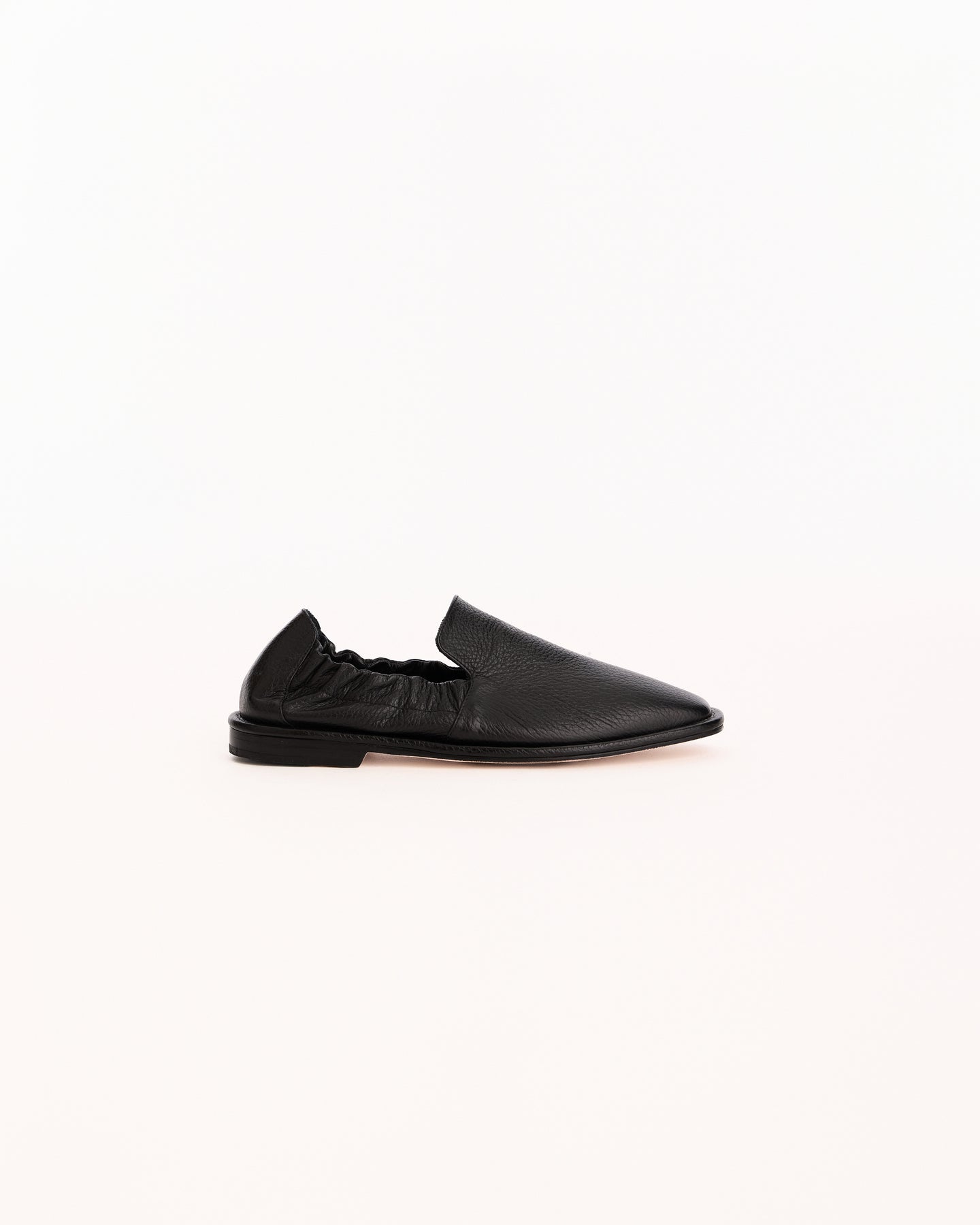 Lauren Manoogian Soft Banded Loafer in black features a square toe in a soft nappa leather fabrication. Details include covered elastic back and elevated heel slip.