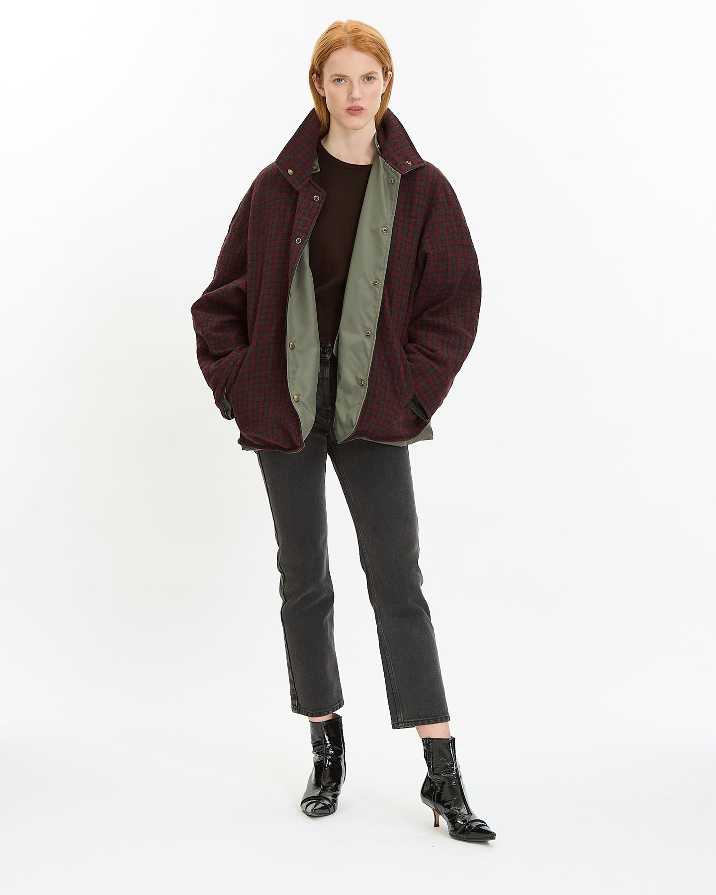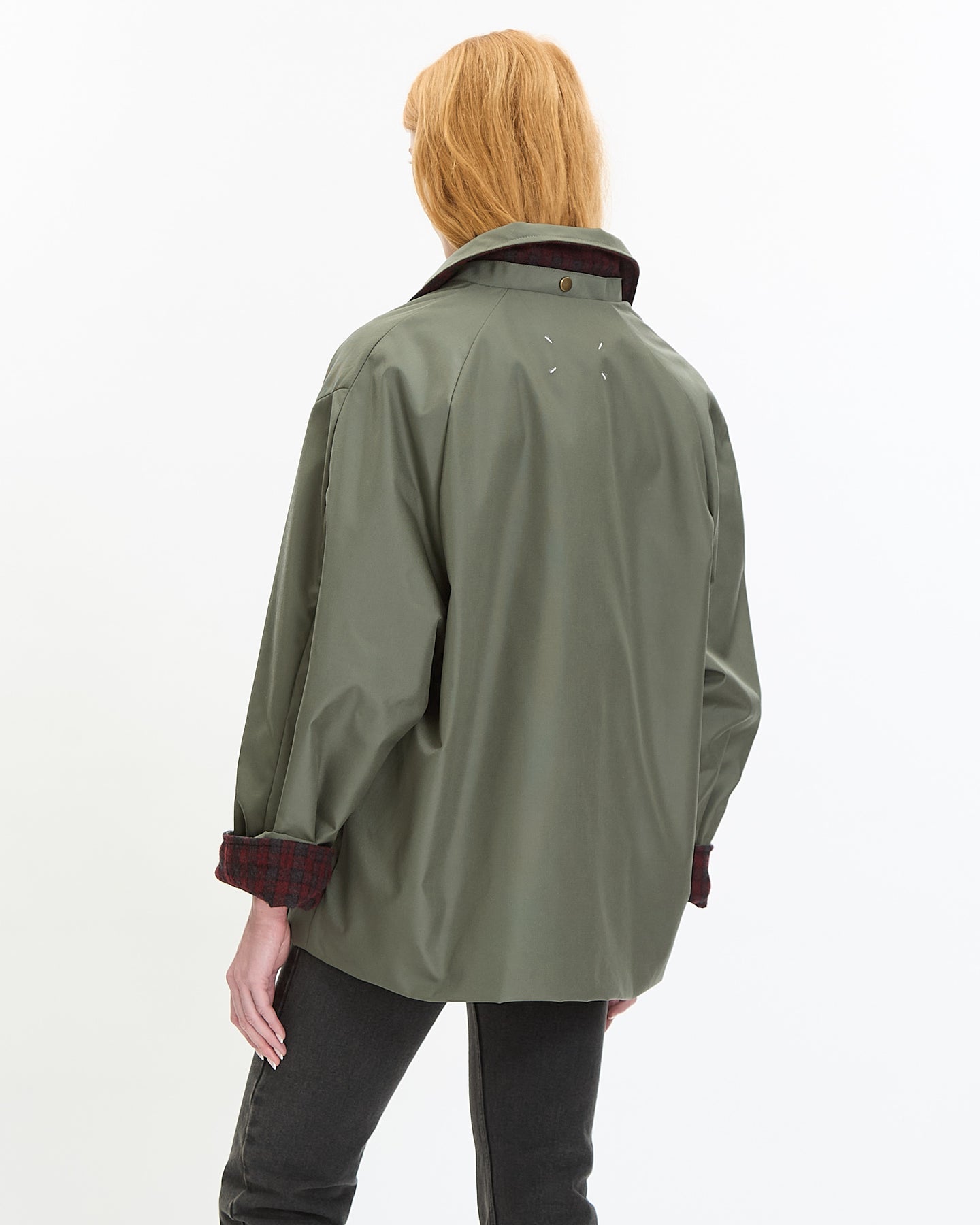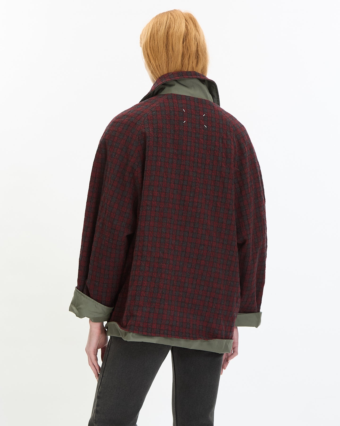 Maison Margiela Reversible Jacket in red plaid/camo features a oversized silhouette in a reversible tartan and nylon tech fabrication. Details include front cargo pockets, snap closures and classic four stitches at back.
