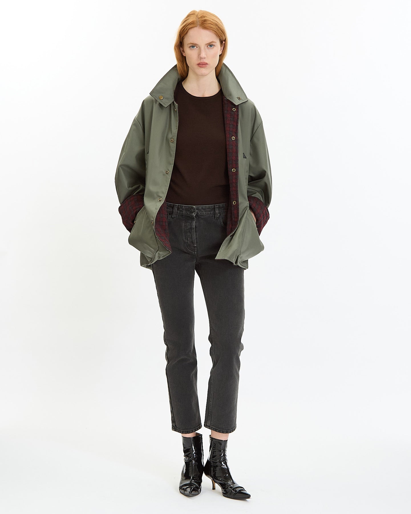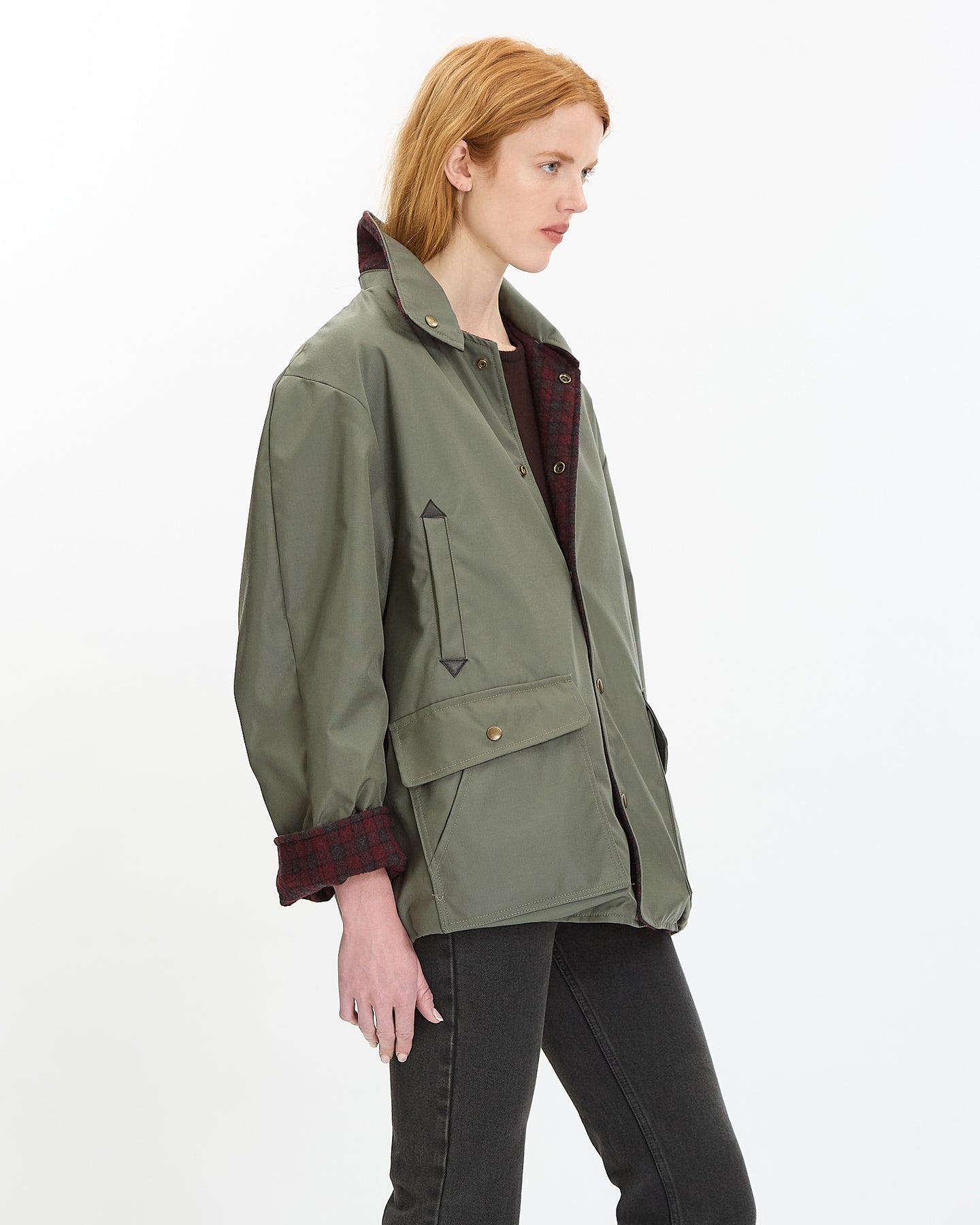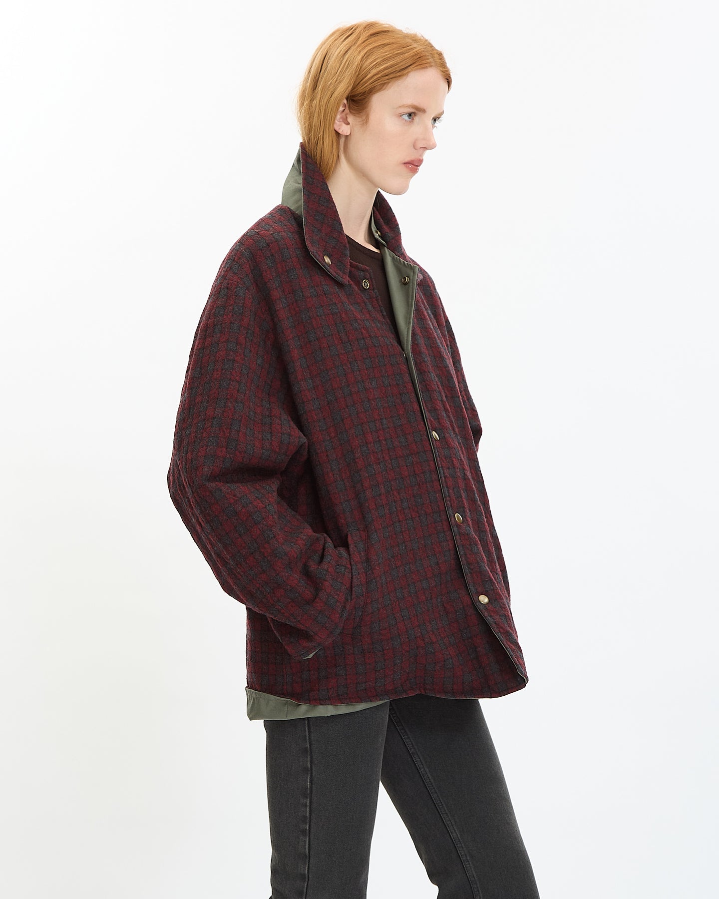 Maison Margiela Reversible Jacket in red plaid/camo features a oversized silhouette in a reversible tartan and nylon tech fabrication. Details include front cargo pockets, snap closures and classic four stitches at back.