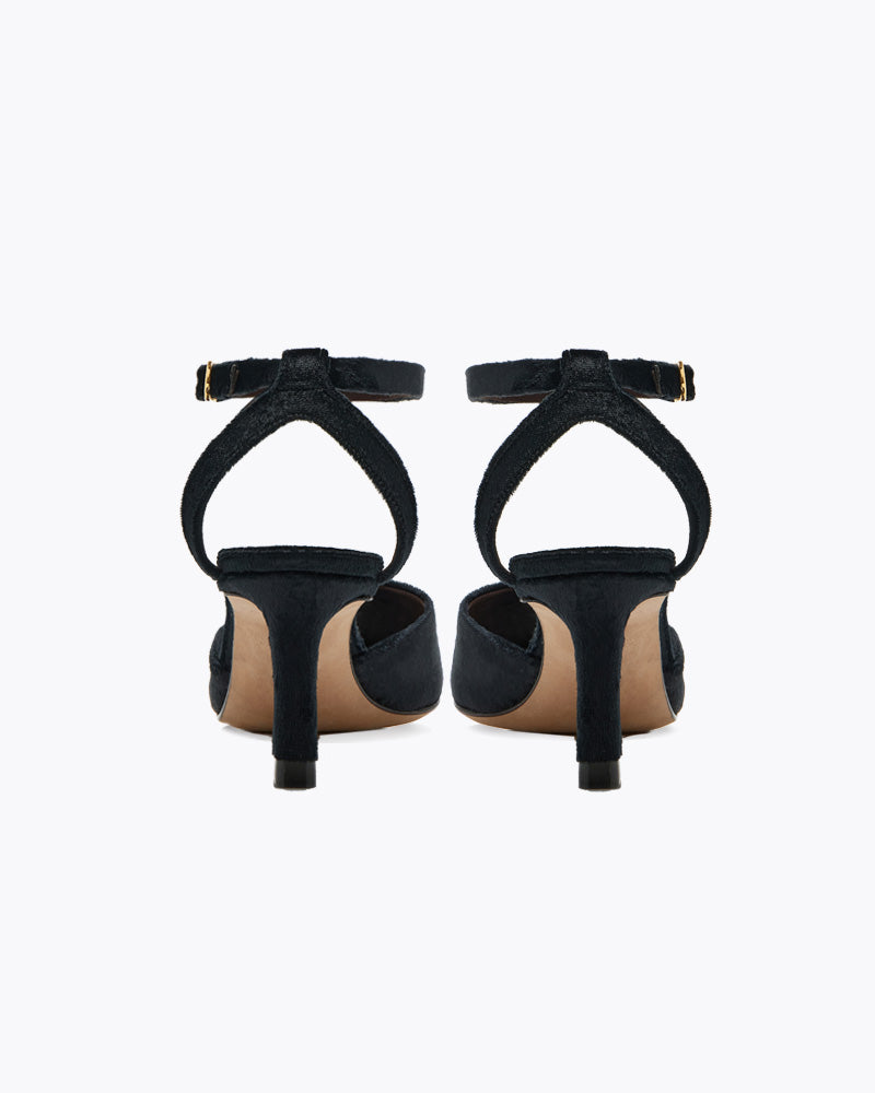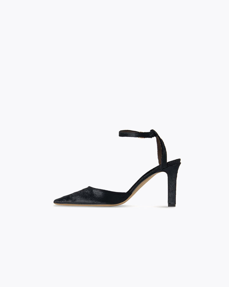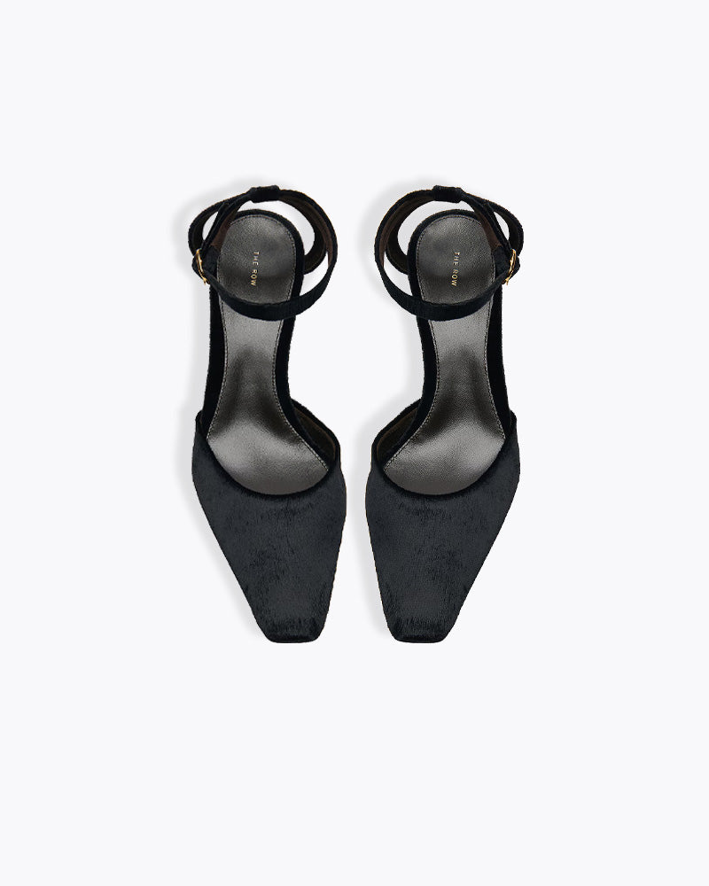 The Row Carla Ankle Strap 80 in black features a classic stiletto in a pony hair fabrication. Details include adjustable buckle ankle strap and pointed closed toe.