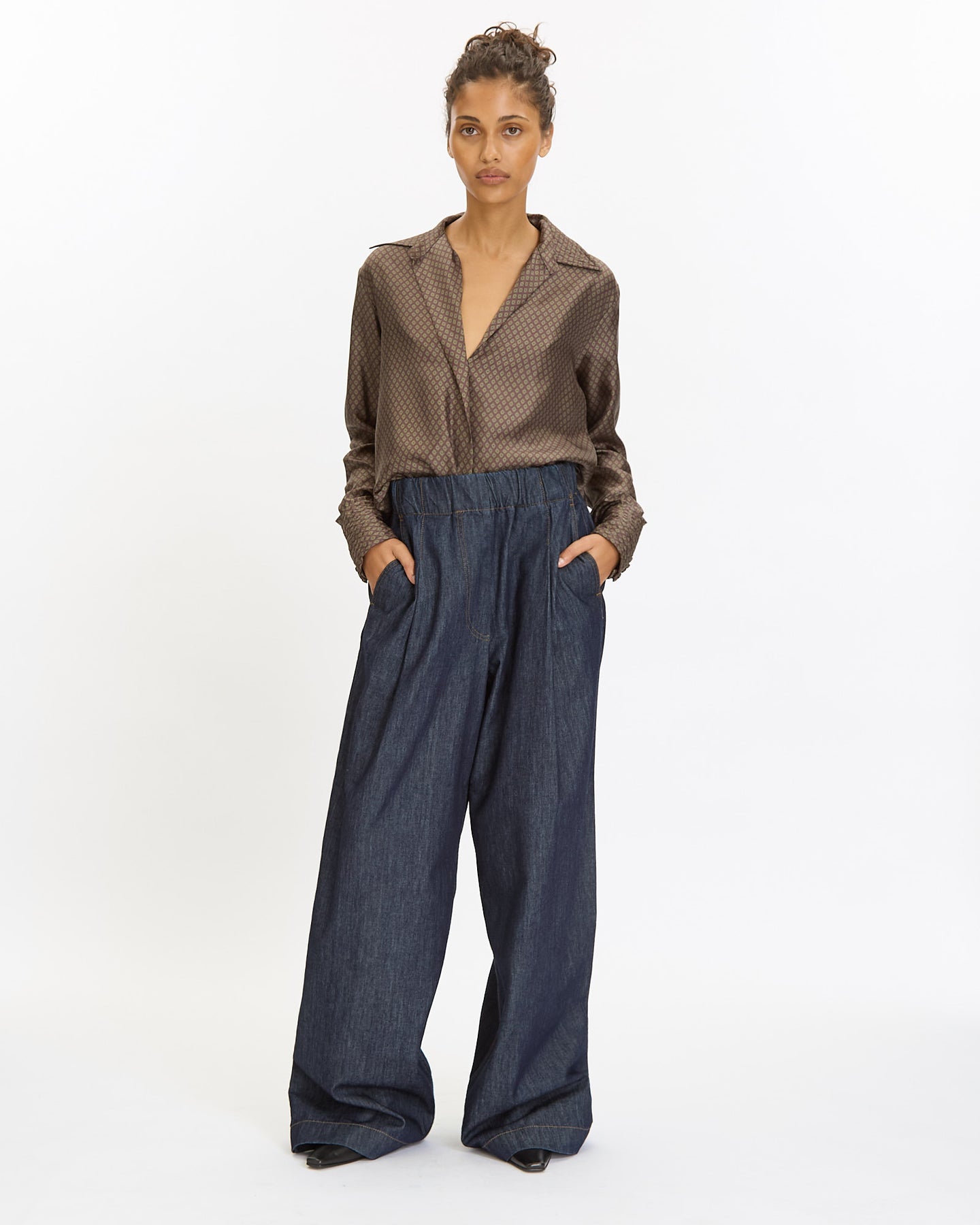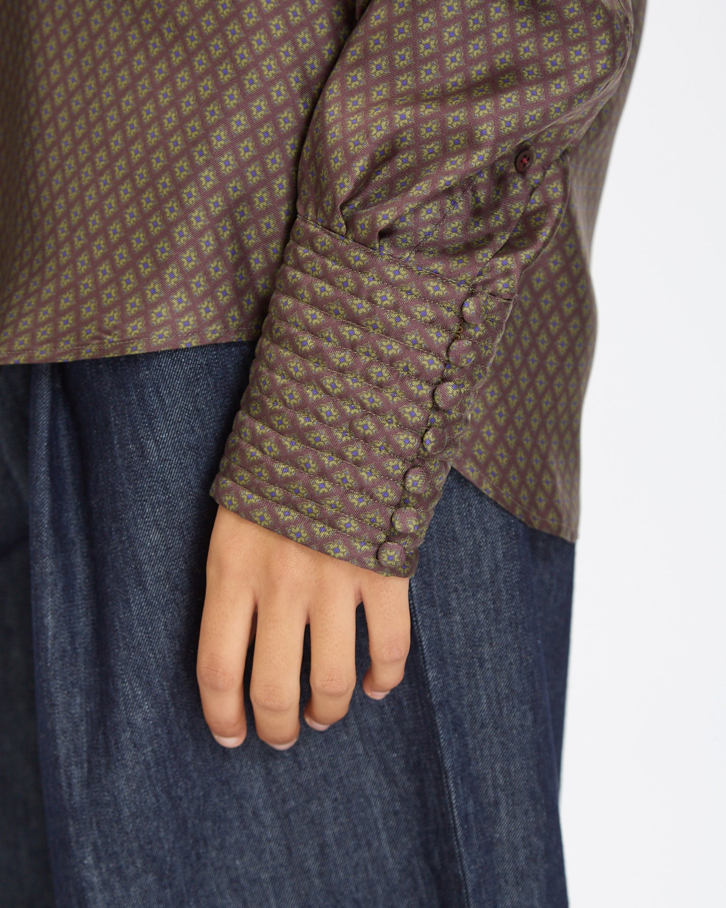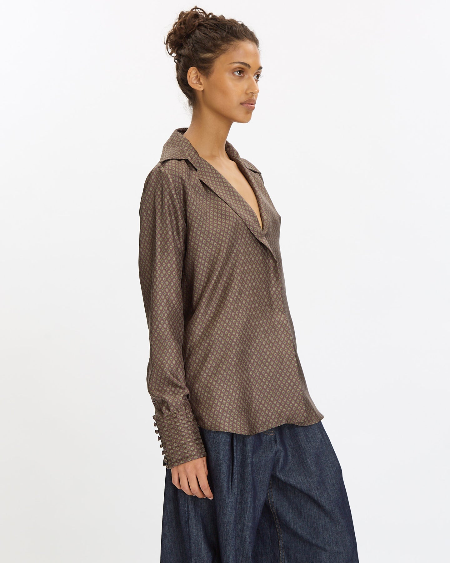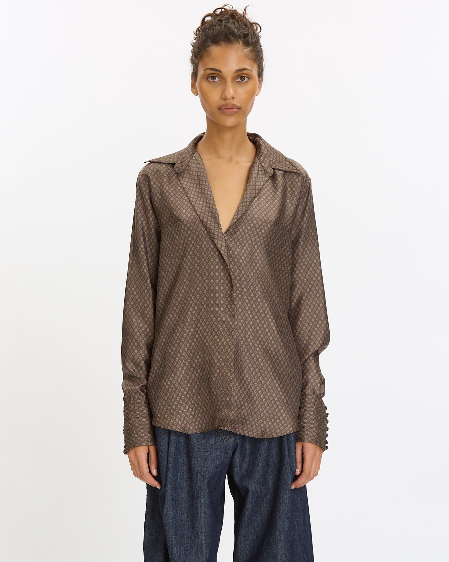 Dries Van Noten Celinta Shirt in brown features a flowy silhouette in a silk fabrication. Details include long sleeves with button cuffs, spread collar, and closed placket front.