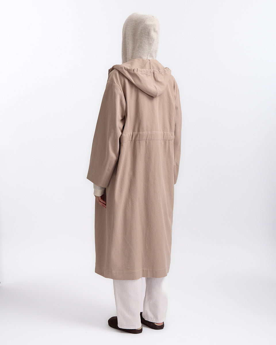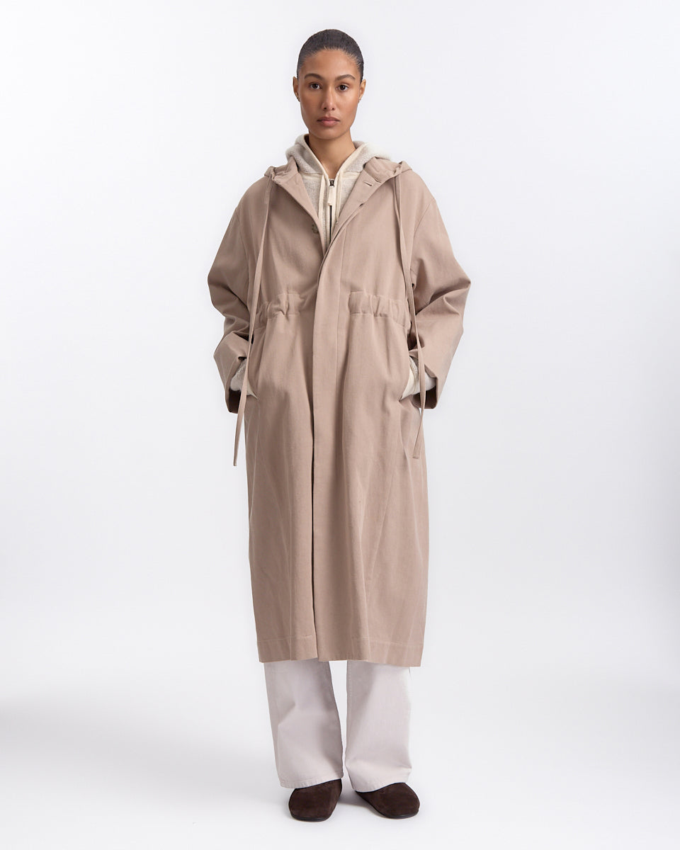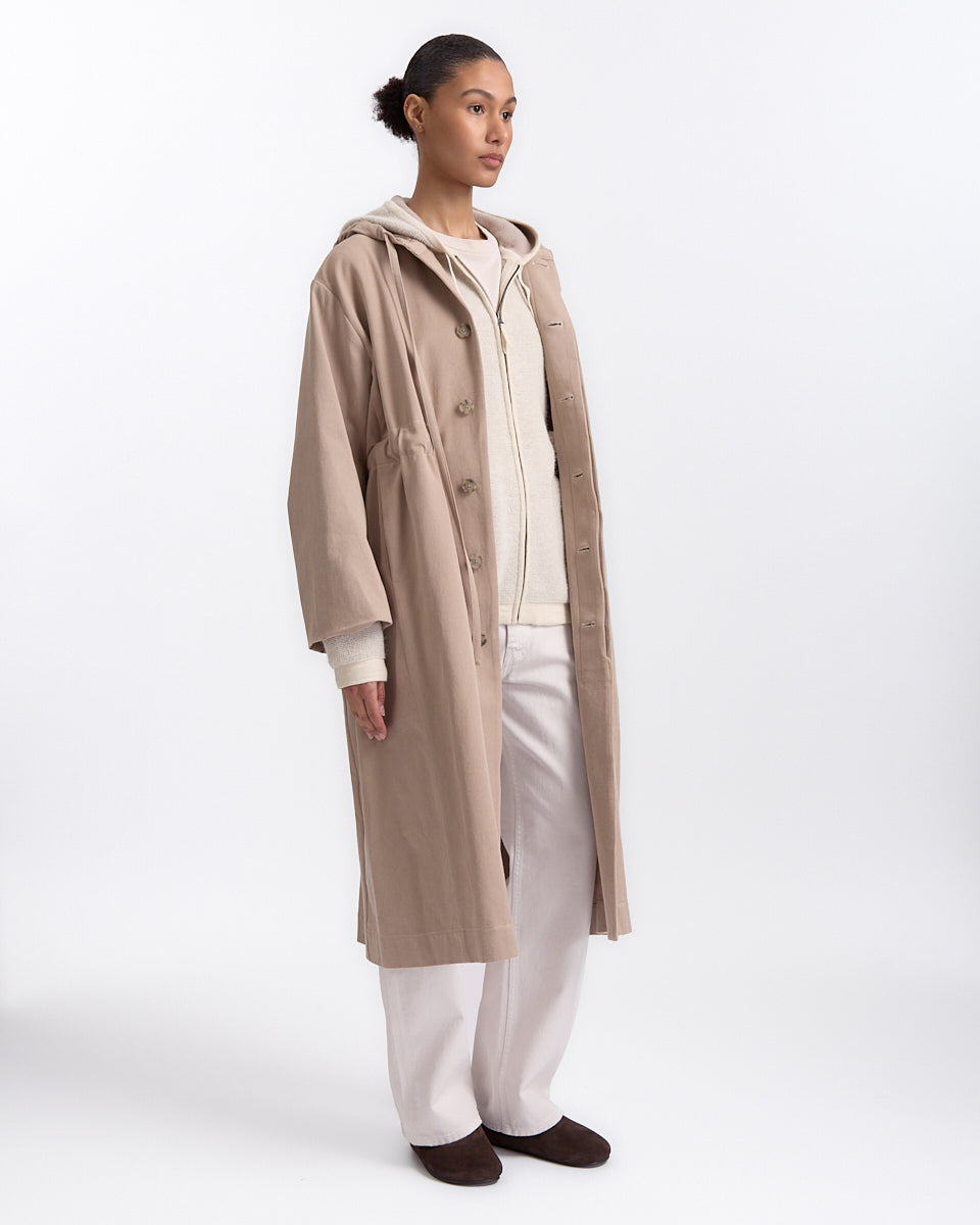 Lauren Manoogian Hood Trench in washed moth features a classic trench in a heavyweight cotton fabrication. Details include adjustable hood, adjustable drawstring at waist and button closures.