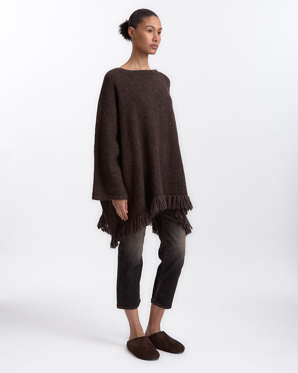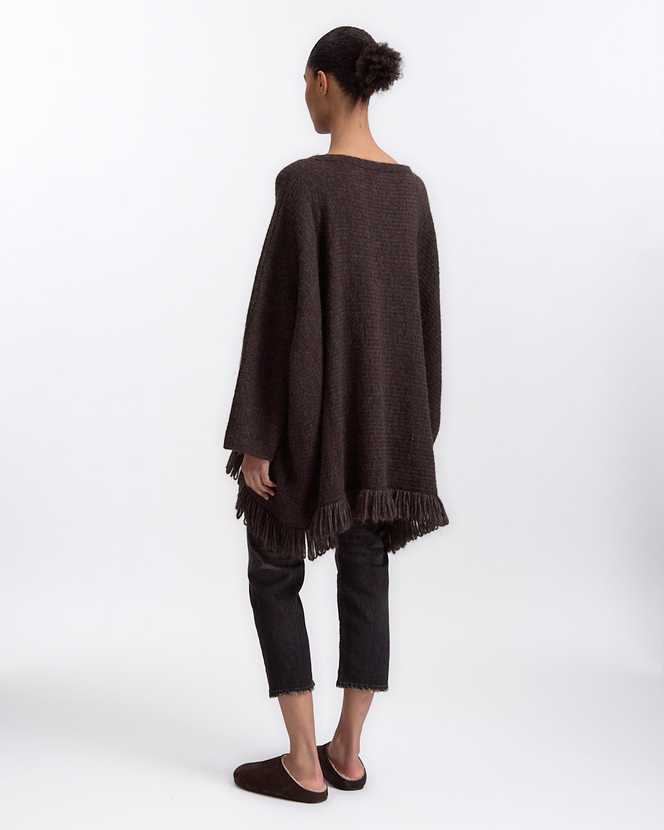 Lauren Manoogian Knitweave Poncho in blackened features a pull over jacket in a knitted alpaca blend fabrication. Details include frayed edges and three quarter sleeves.