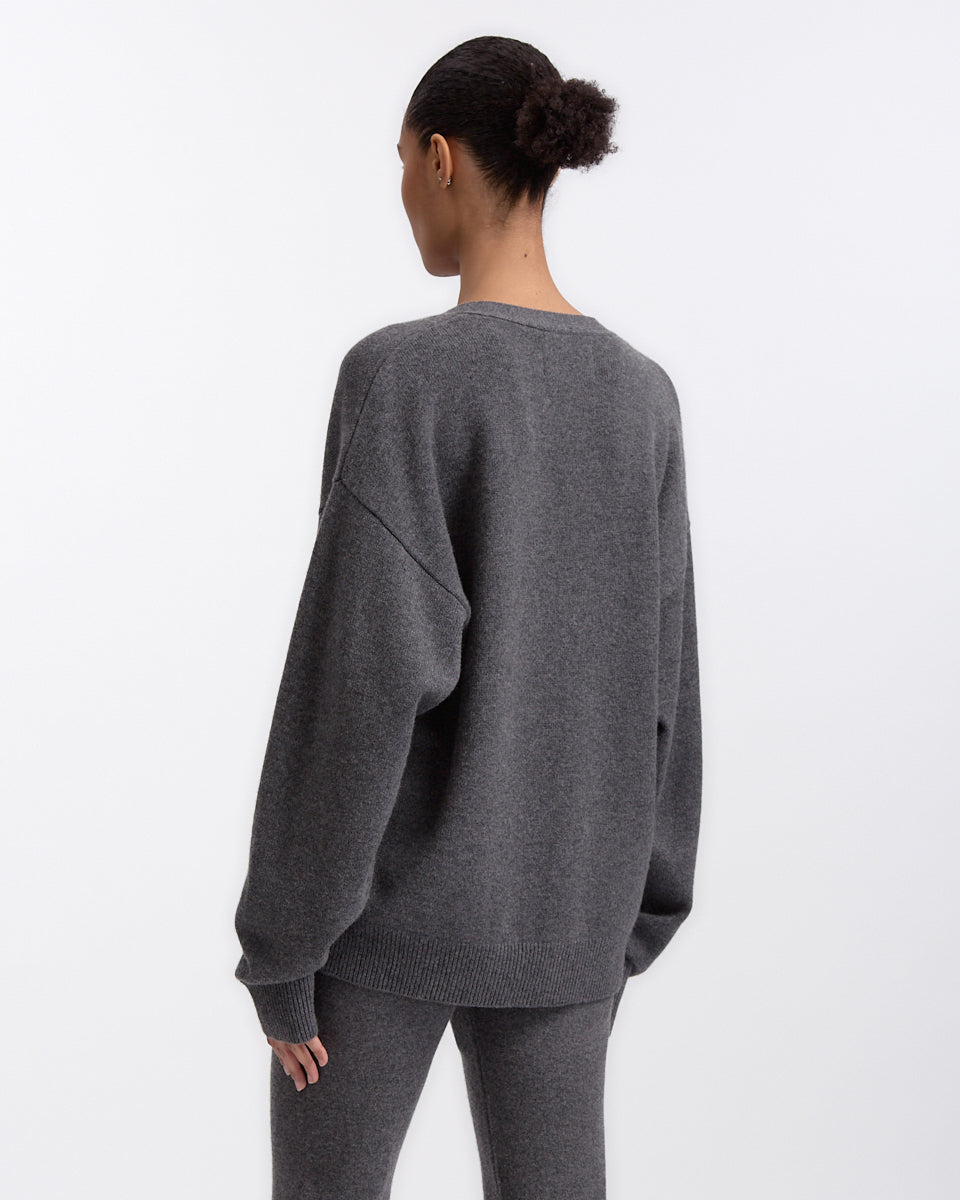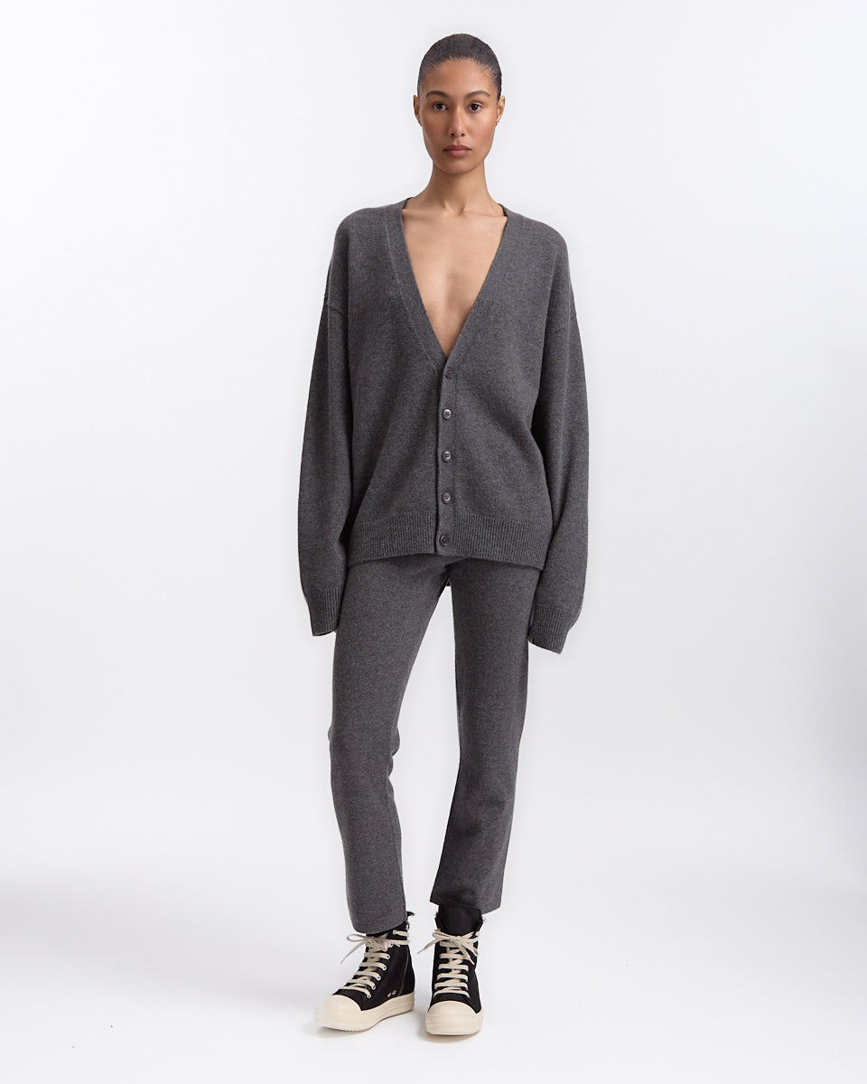 Extreme Cashmere N°459 Jonah Cardigan in felt features a slouchy fit in a cashmere fabrication. Details include deep v-neckline, button closures and ribbed finishing at hem and sleeve cuffs.
