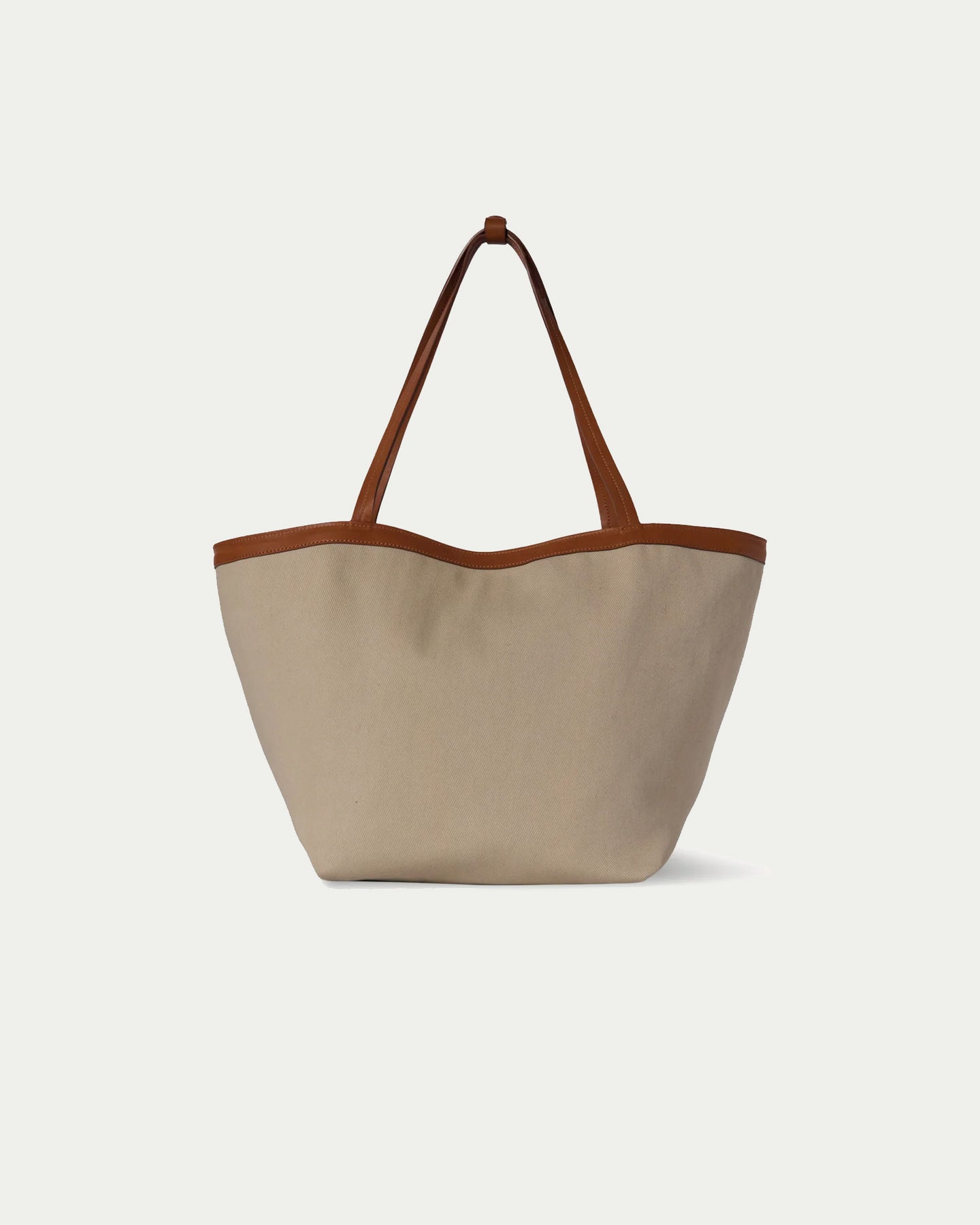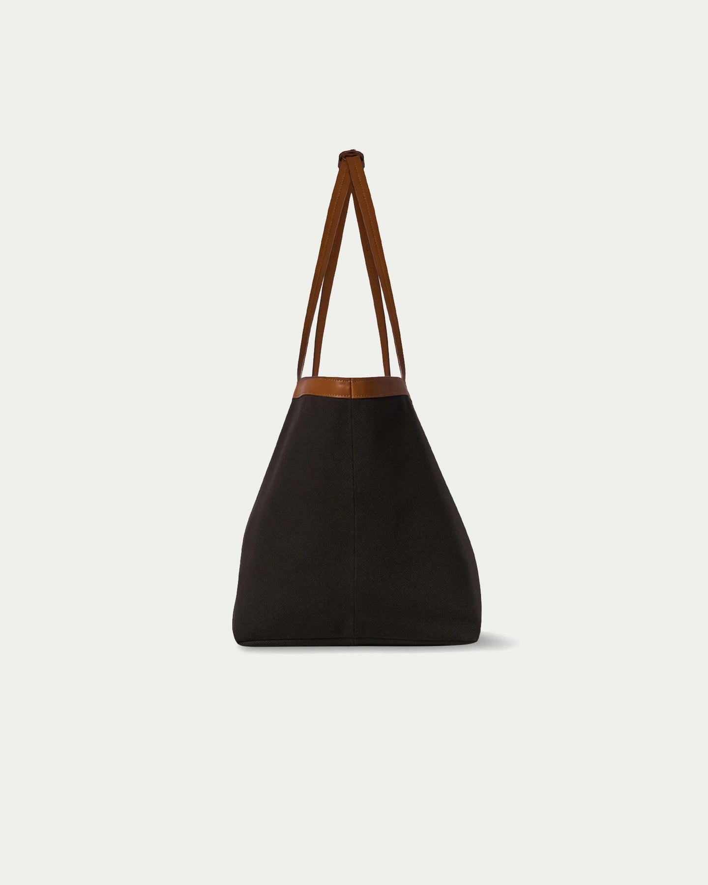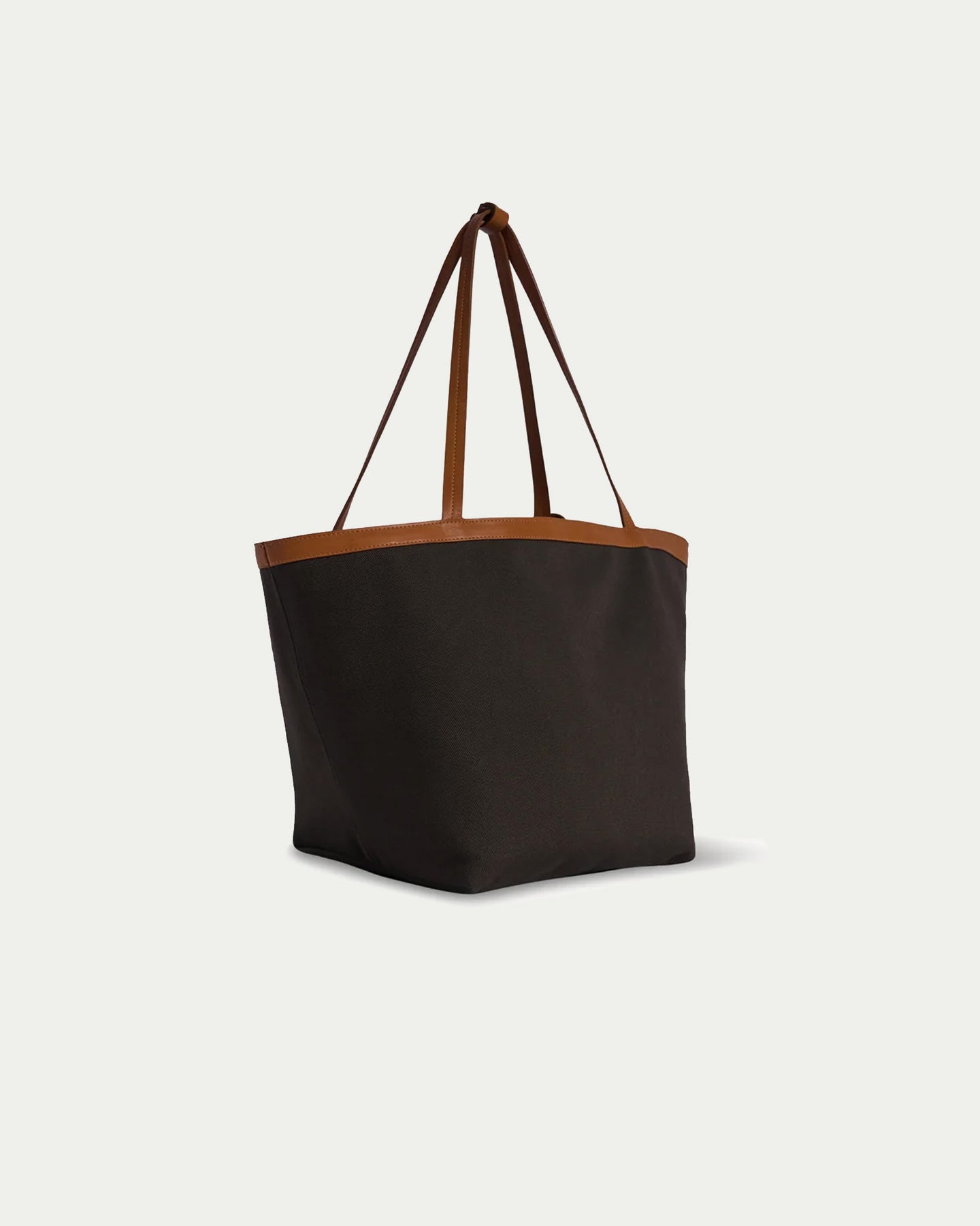 The Row Park Tote Three Canvas in deep brown features a classic tote bag silhouette in a heavyweight canvas fabrication. Details include interior toggle closure and coordinating wristlet with adjustable strap.