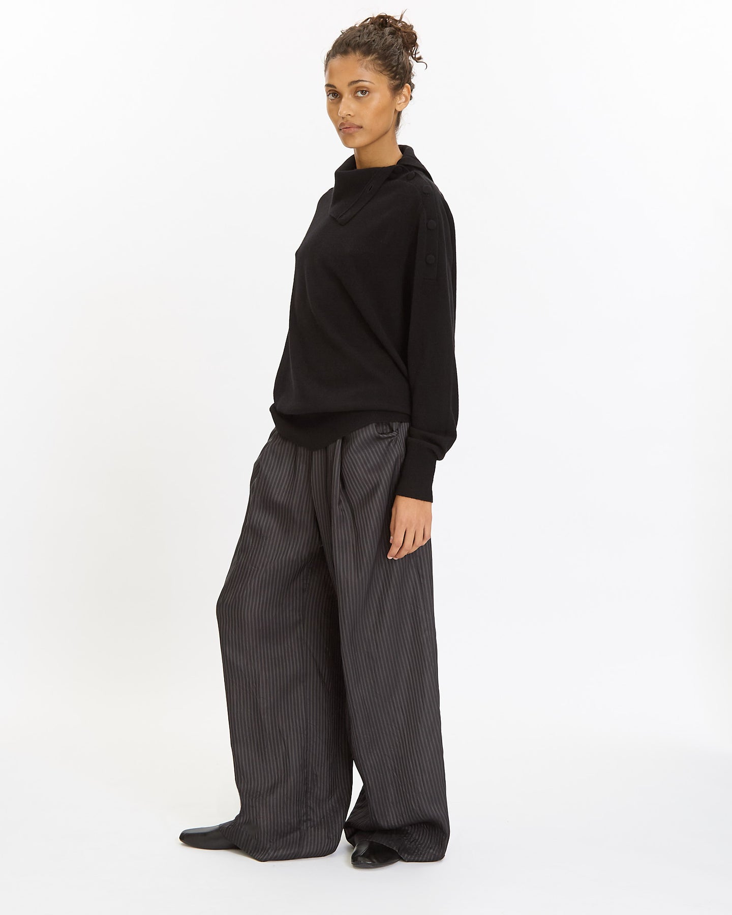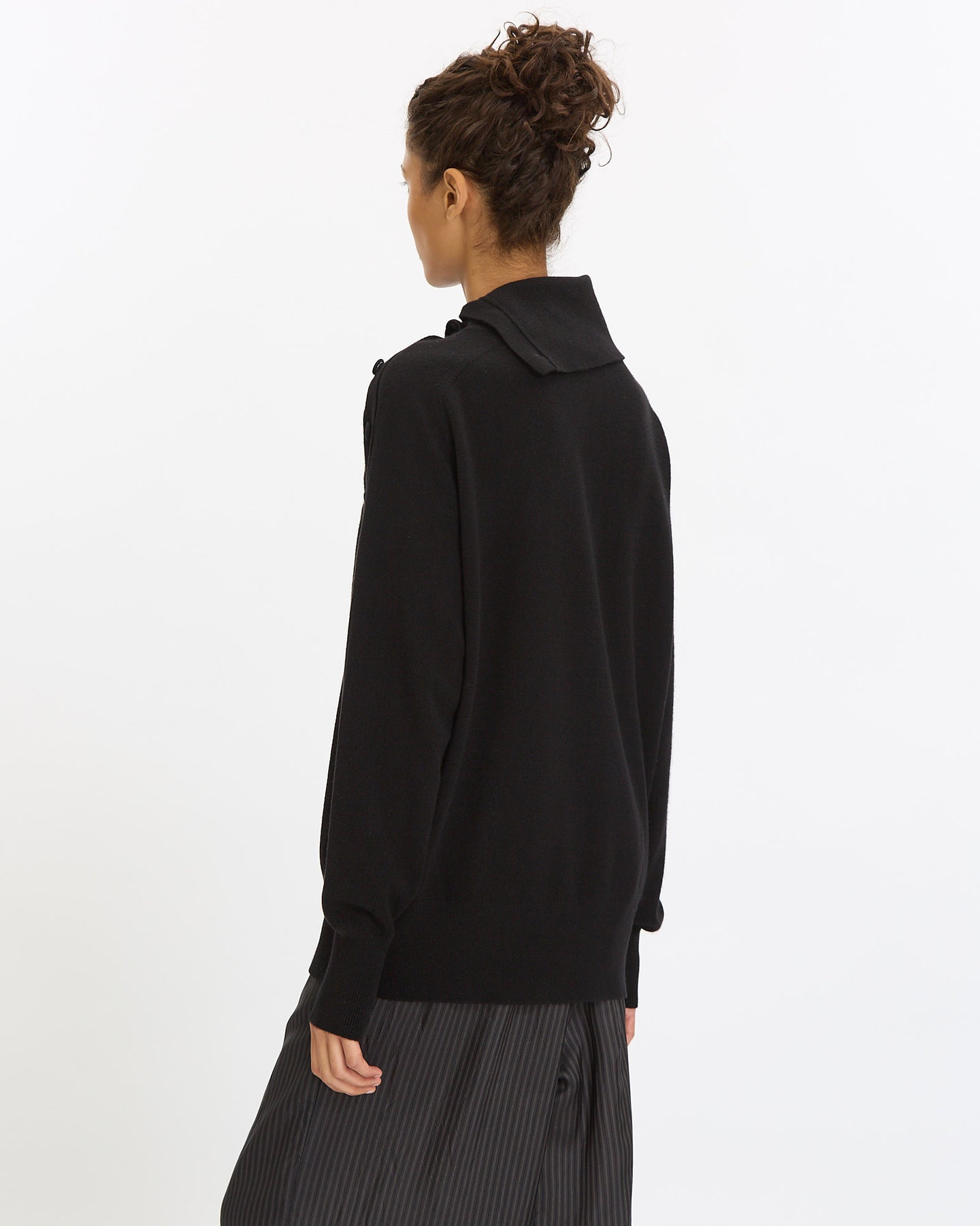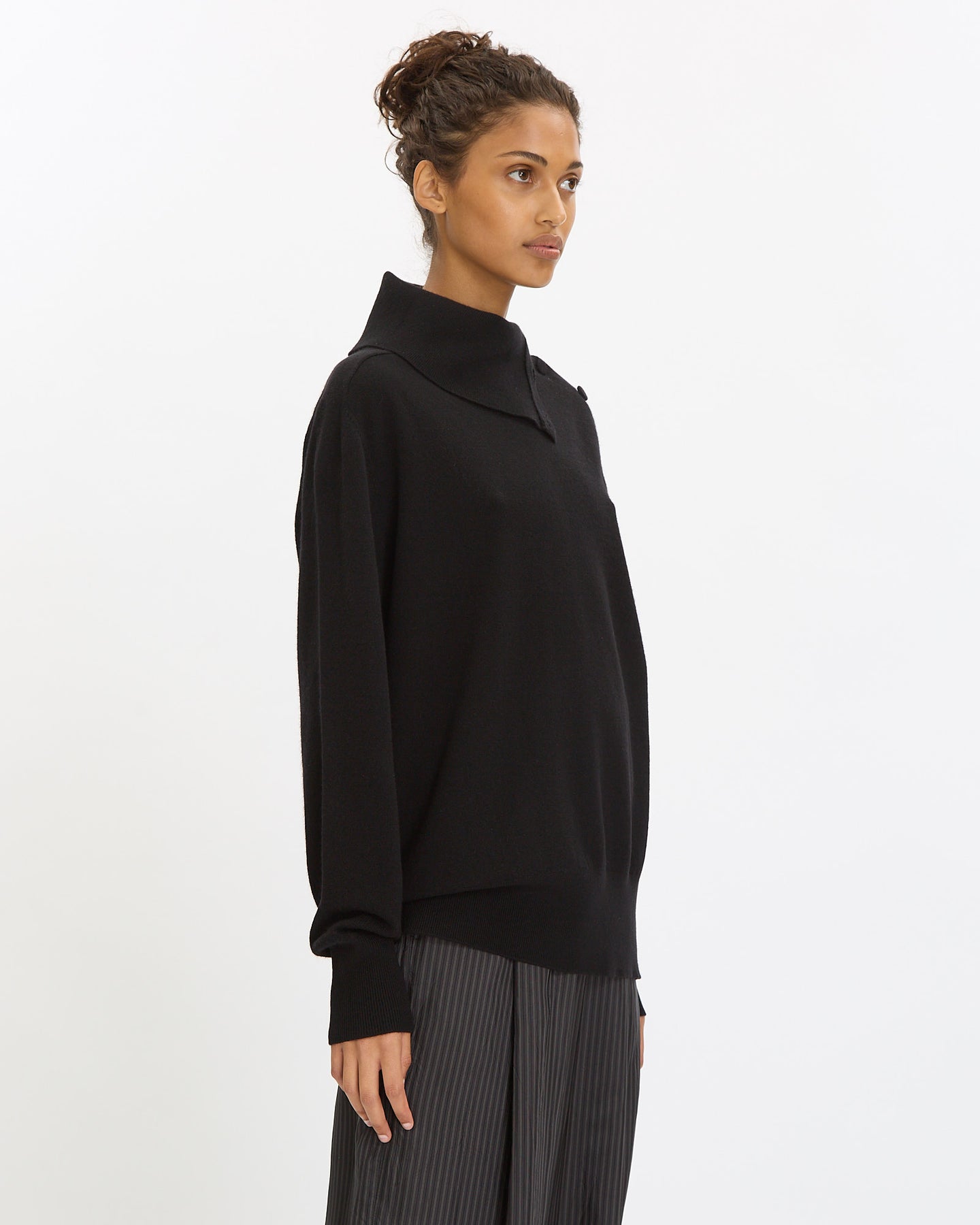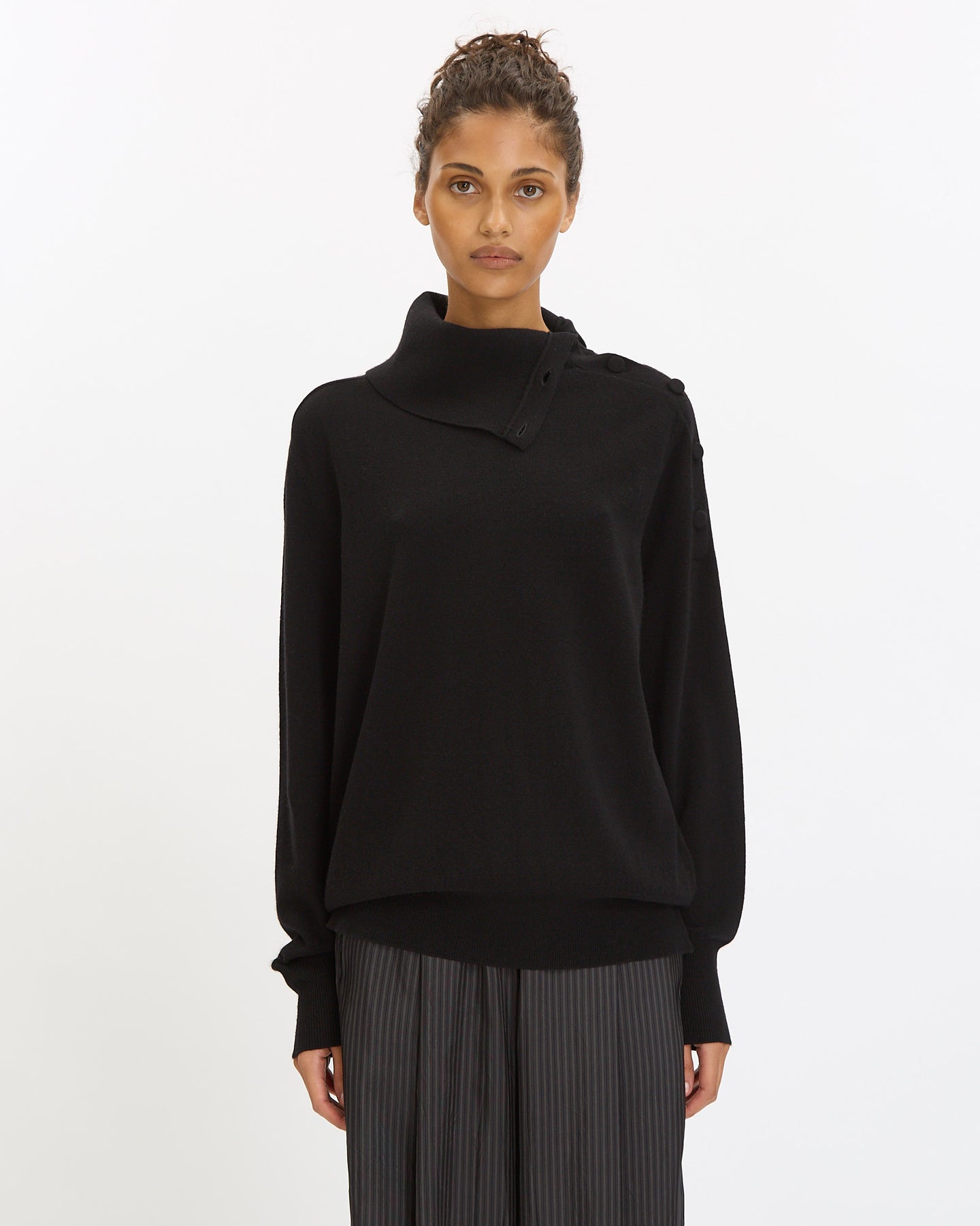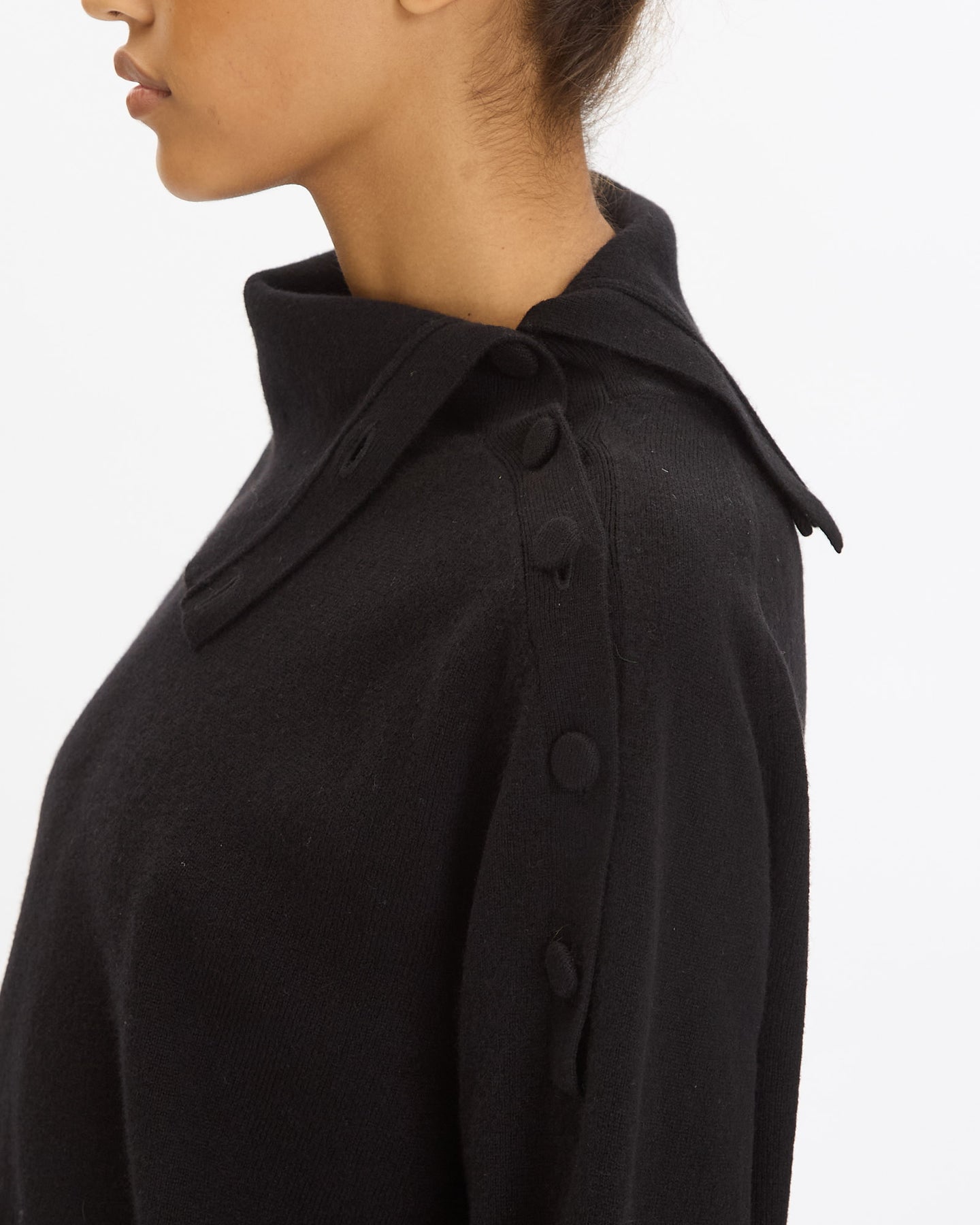 Dries Van Noten Tixla Sweater in black features an oversized fit in a cashmere fabrication. Details include high funnel neck with side button closures, long sleeves and ribbed finishing at neckline, hem and cuffs.