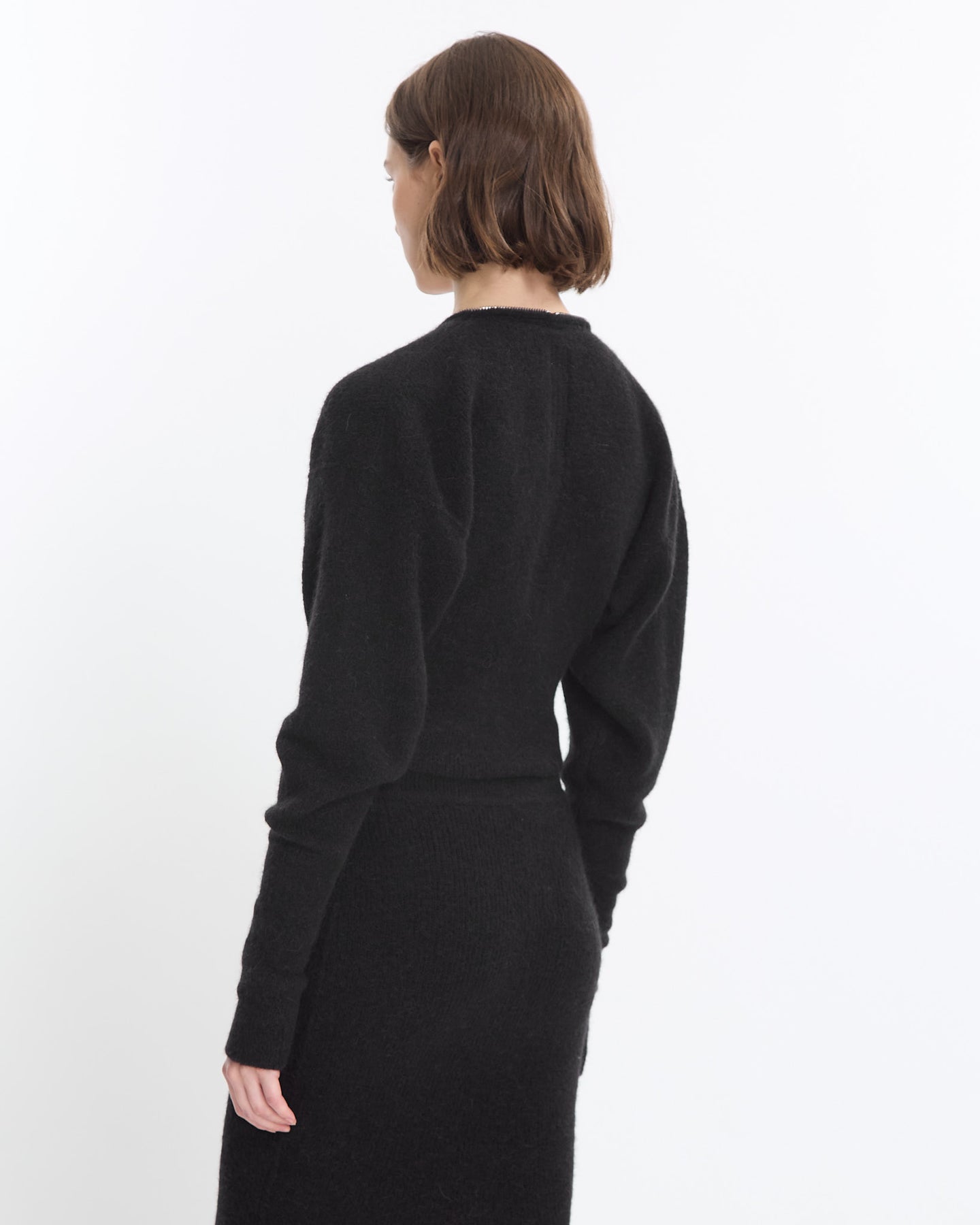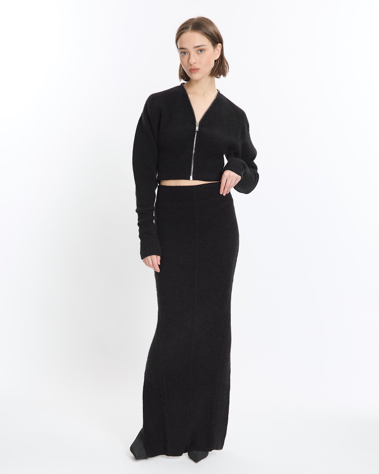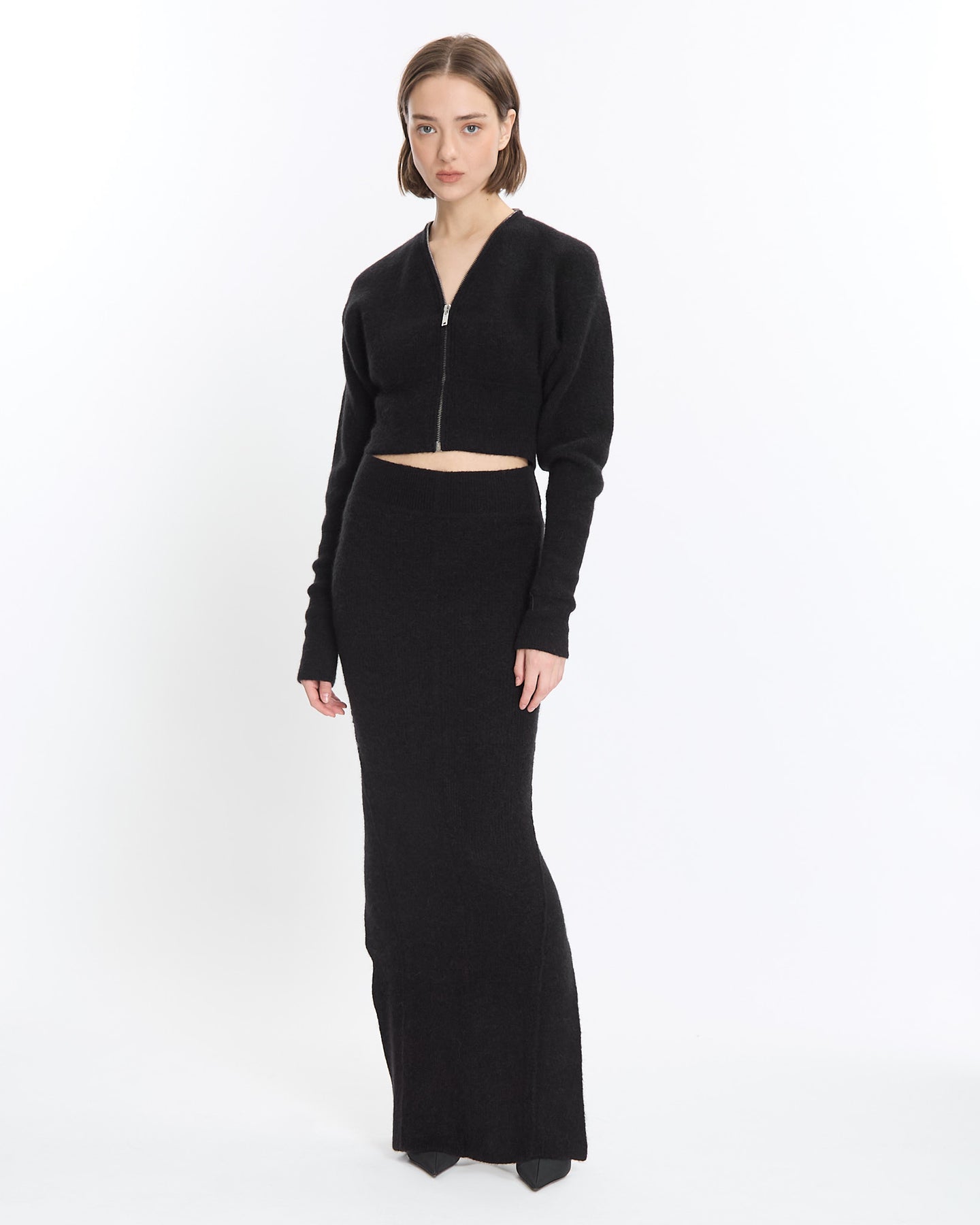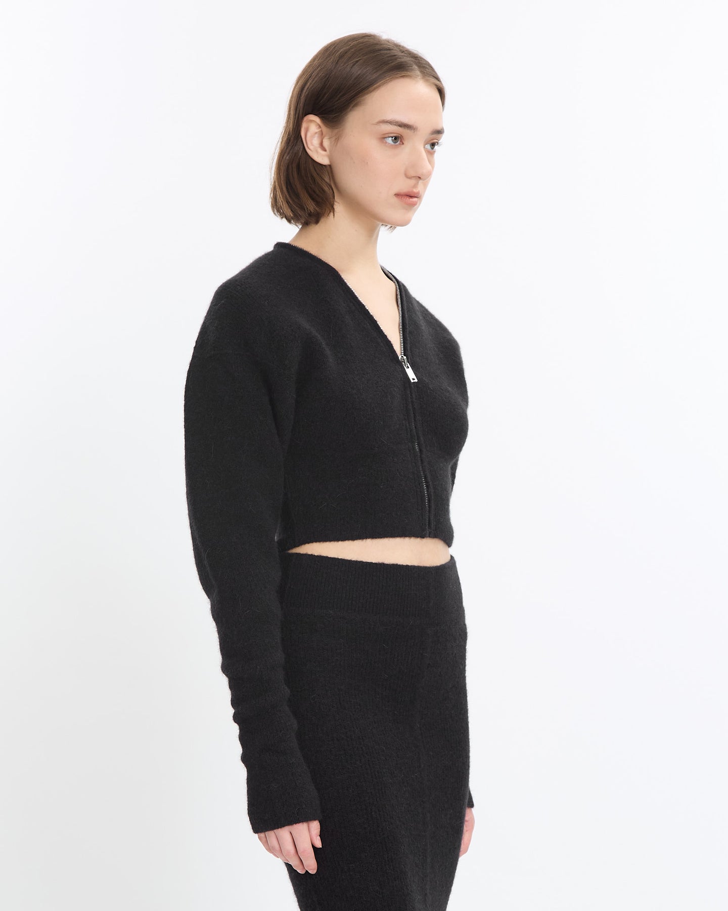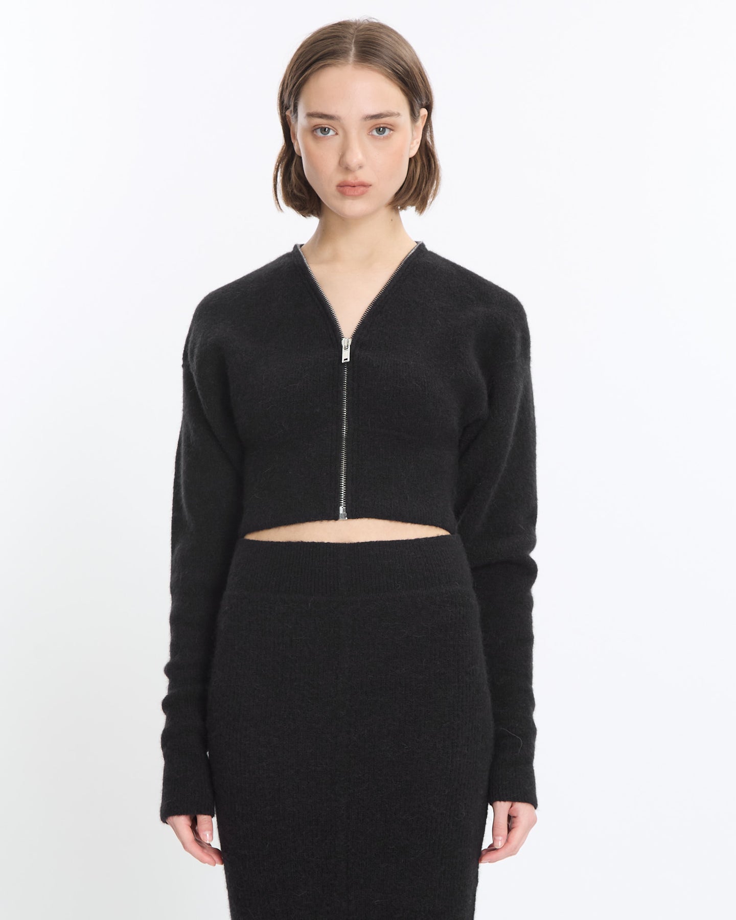 Rick Owens Batwing Jacket in black features a cropped silhouette. Details include batwing sleeves in alpaca knit, zip front closure with all around zip detail and ribbed finishing at hem and cuff.