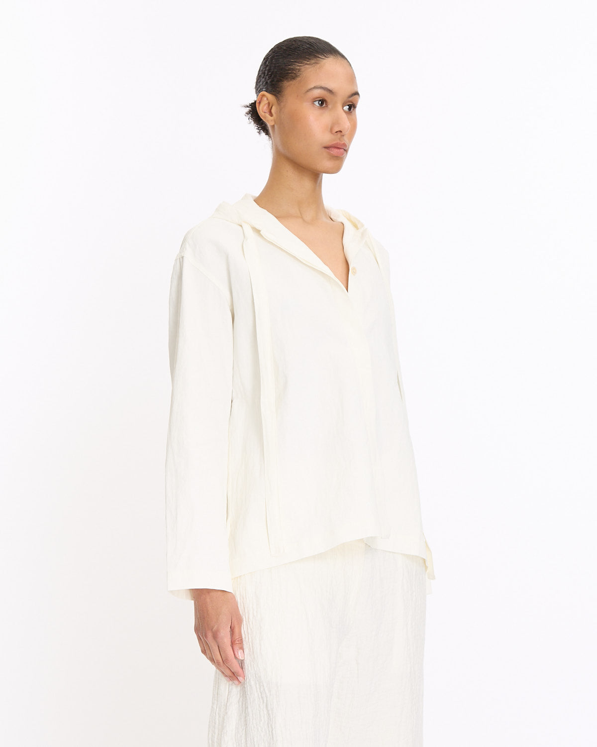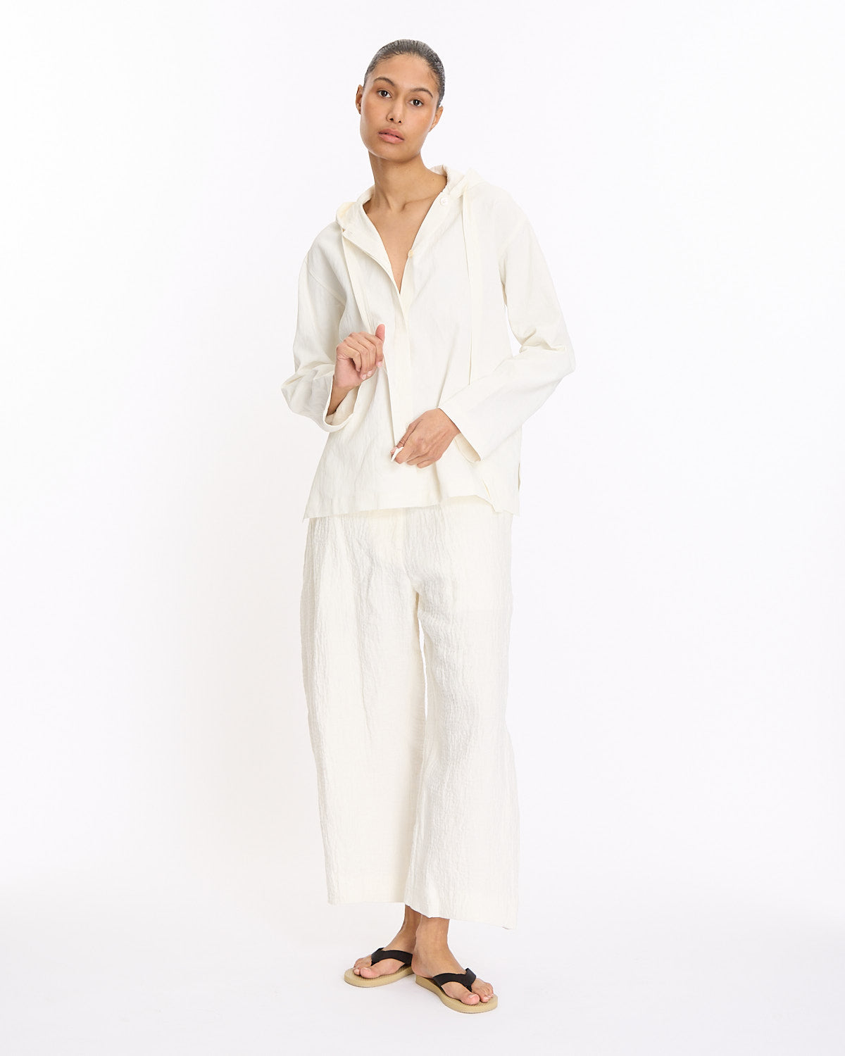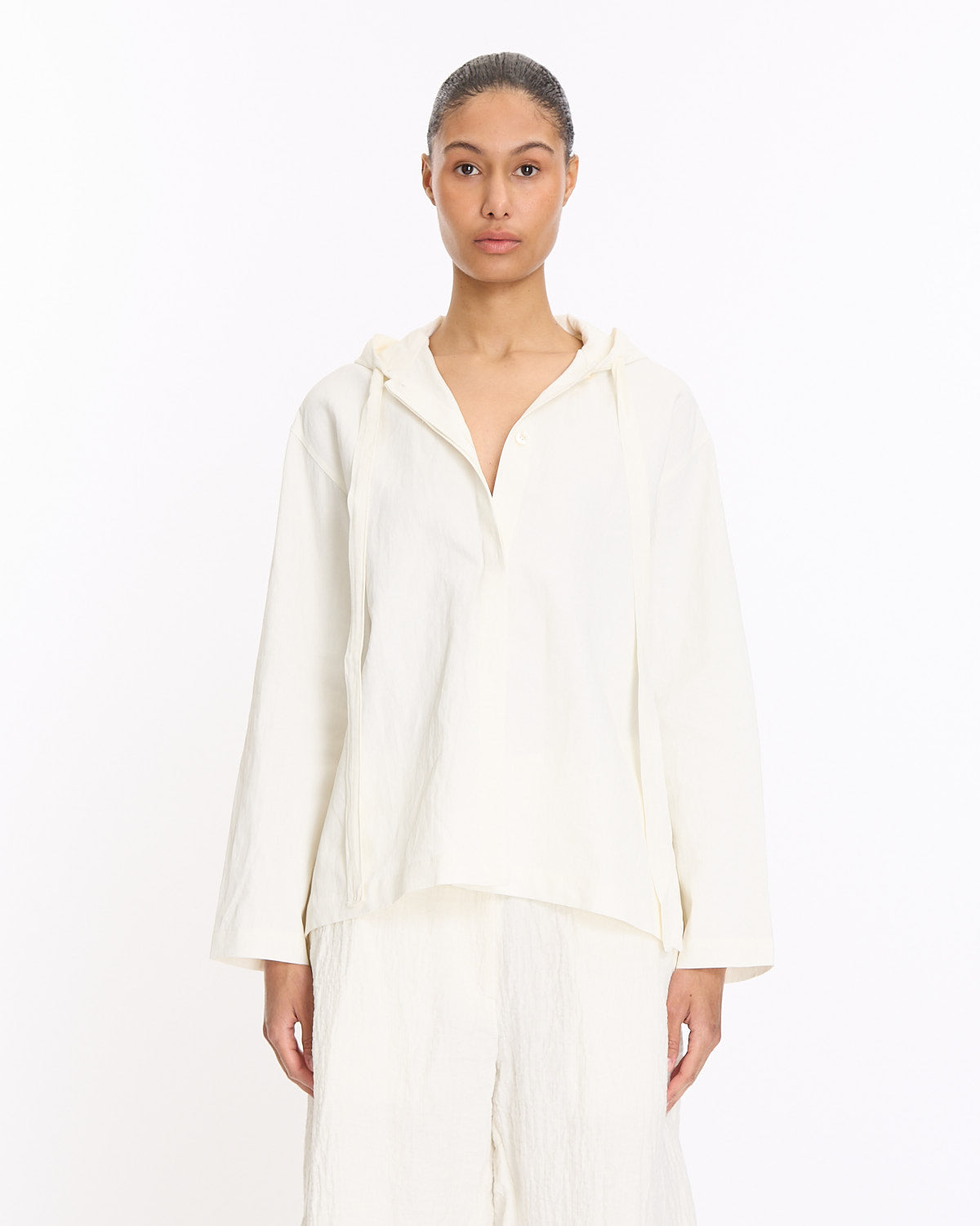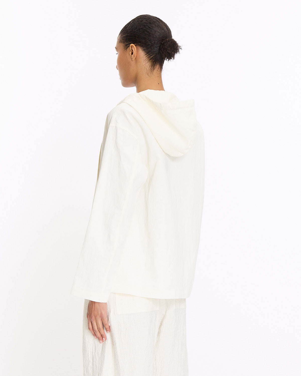 Studio Nicholson Belleri Hooded Jacket in milk features a sharp silhouette in a relaxed fit. Details include articulated sleeves, hood with adjustable drawstring, concealed placket and dropped shoulders.