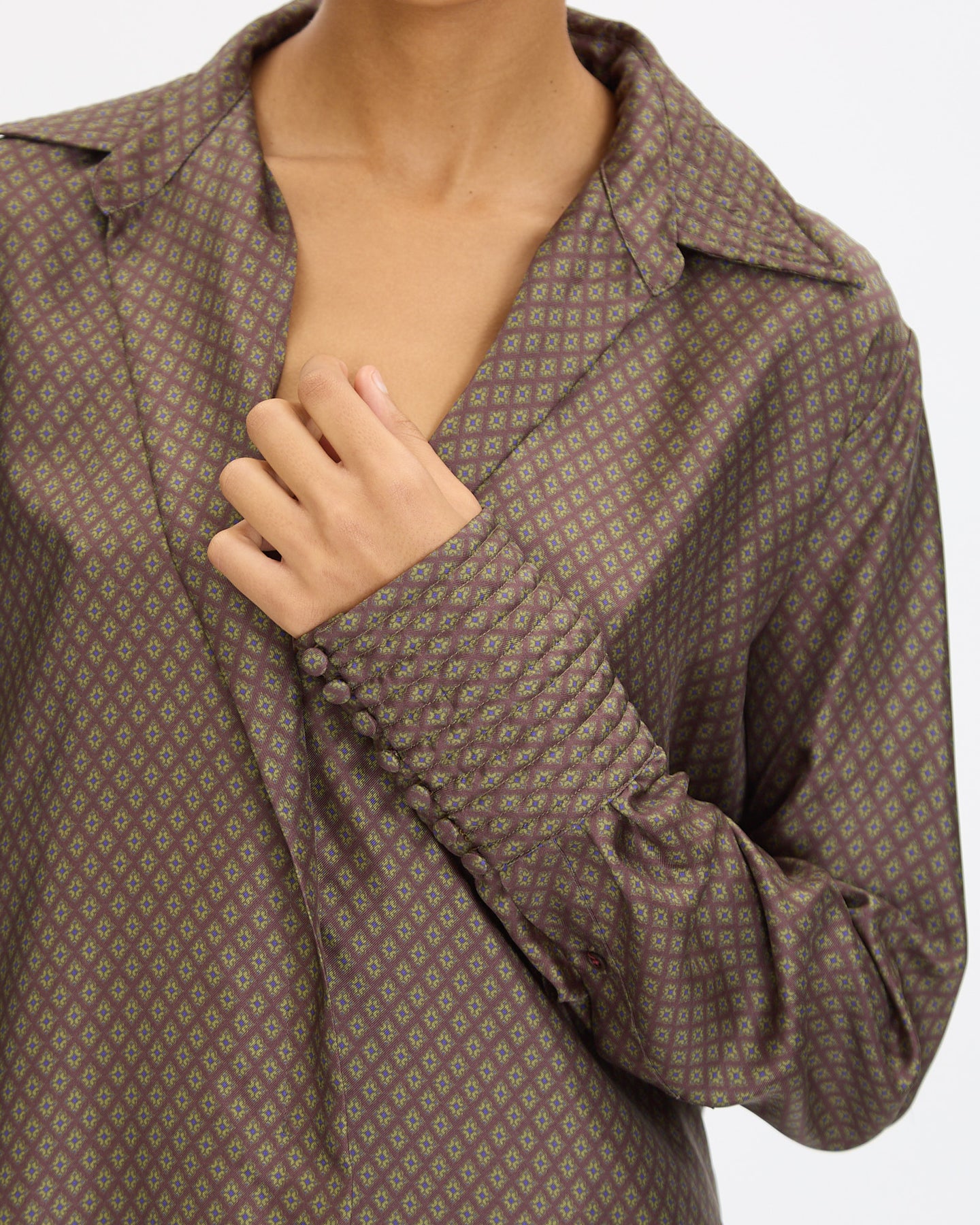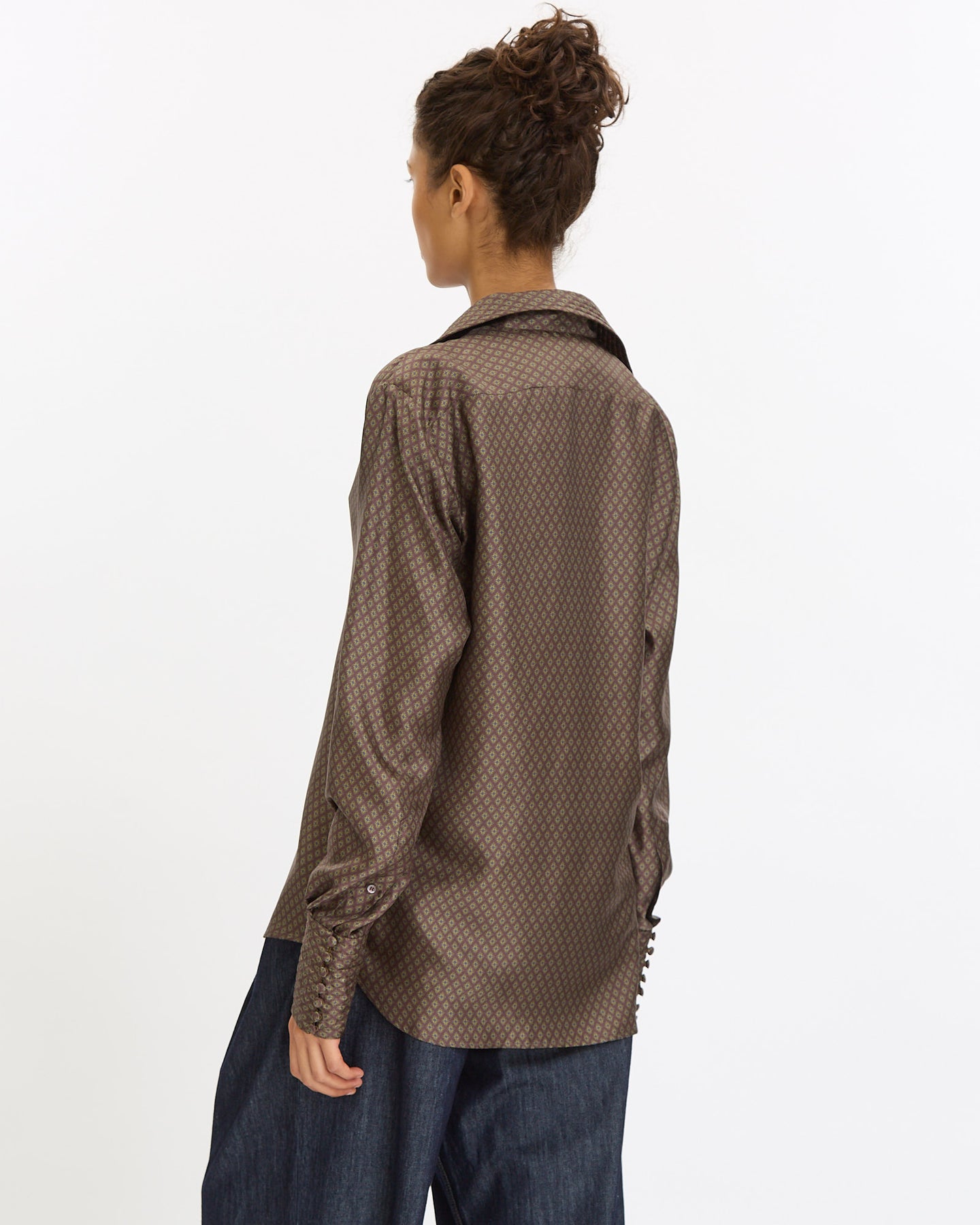 Dries Van Noten Celinta Shirt in brown features a flowy silhouette in a silk fabrication. Details include long sleeves with button cuffs, spread collar, and closed placket front.