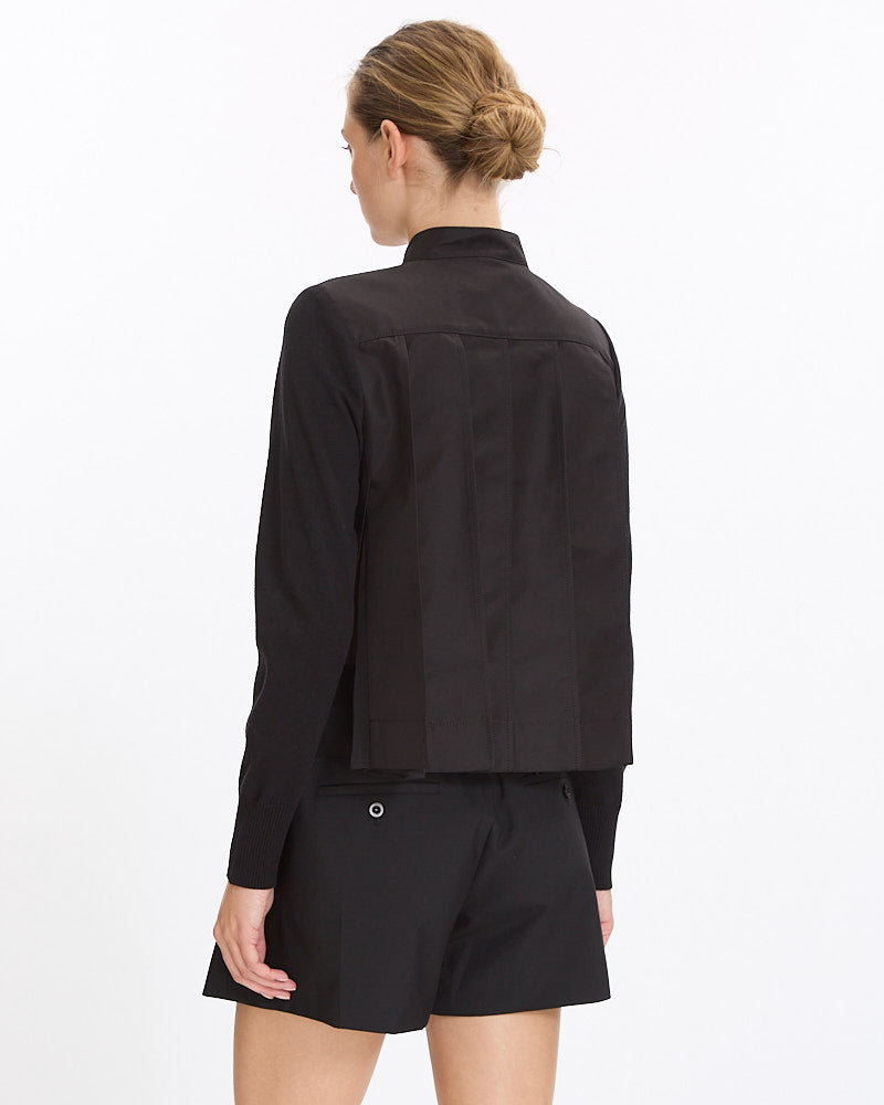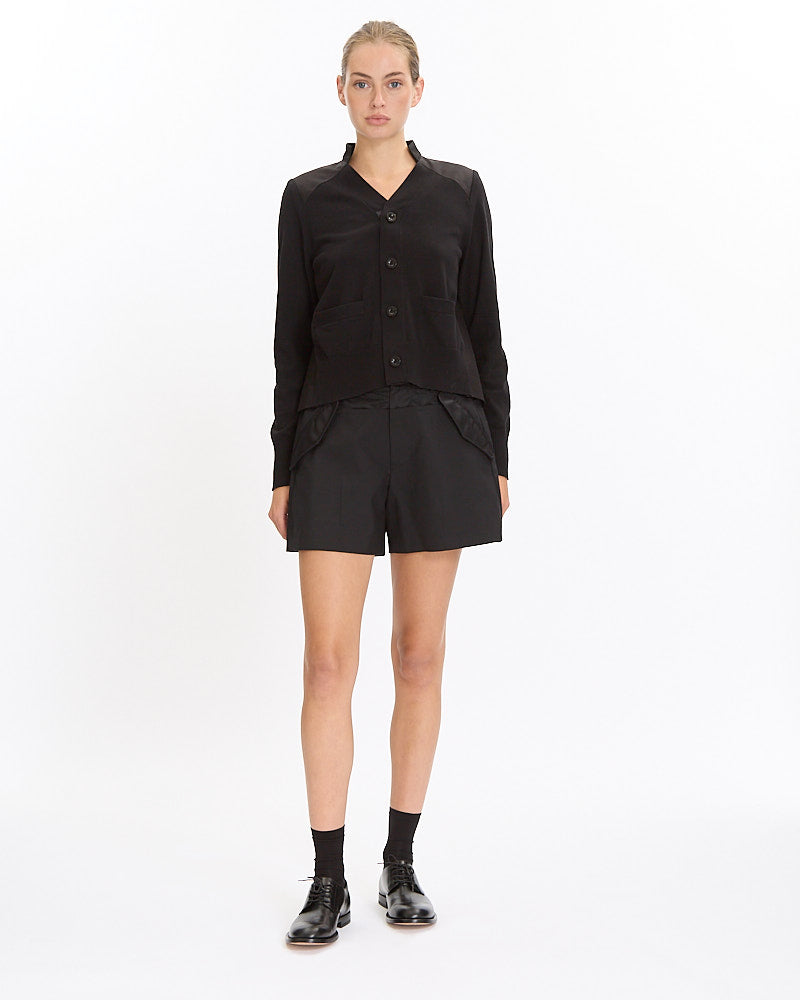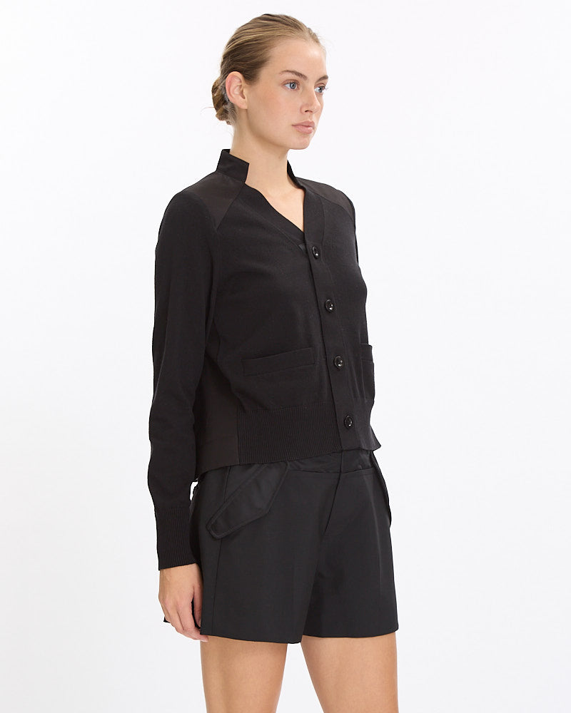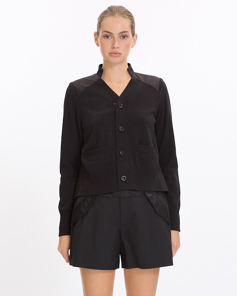 Sacai Cotton Garbardine x Knit Cardigan in black features a knitted and panelled construction. Details include front button closures, front welt pockets, pleated back, stand collar and ribbed sleeve cuffs.