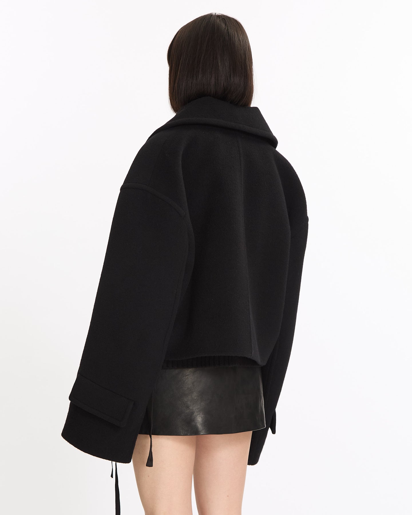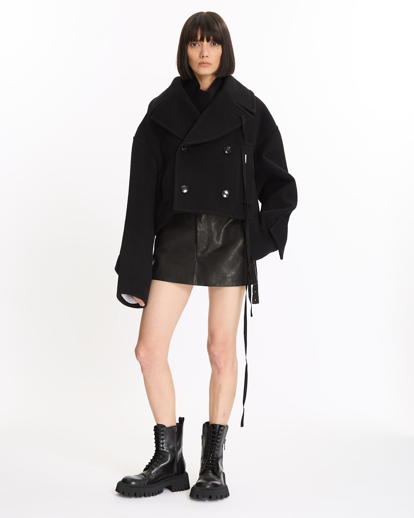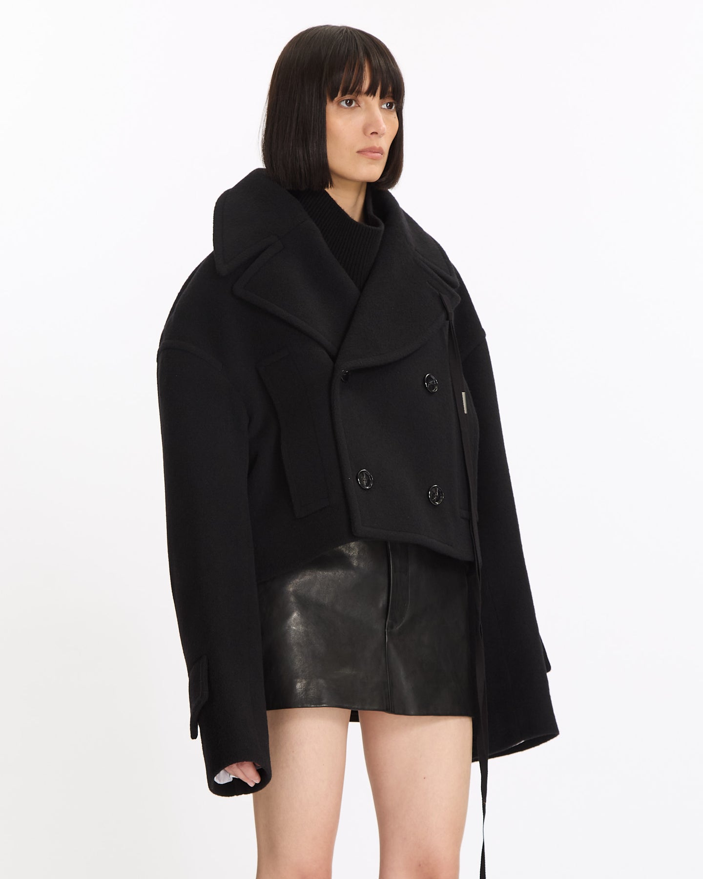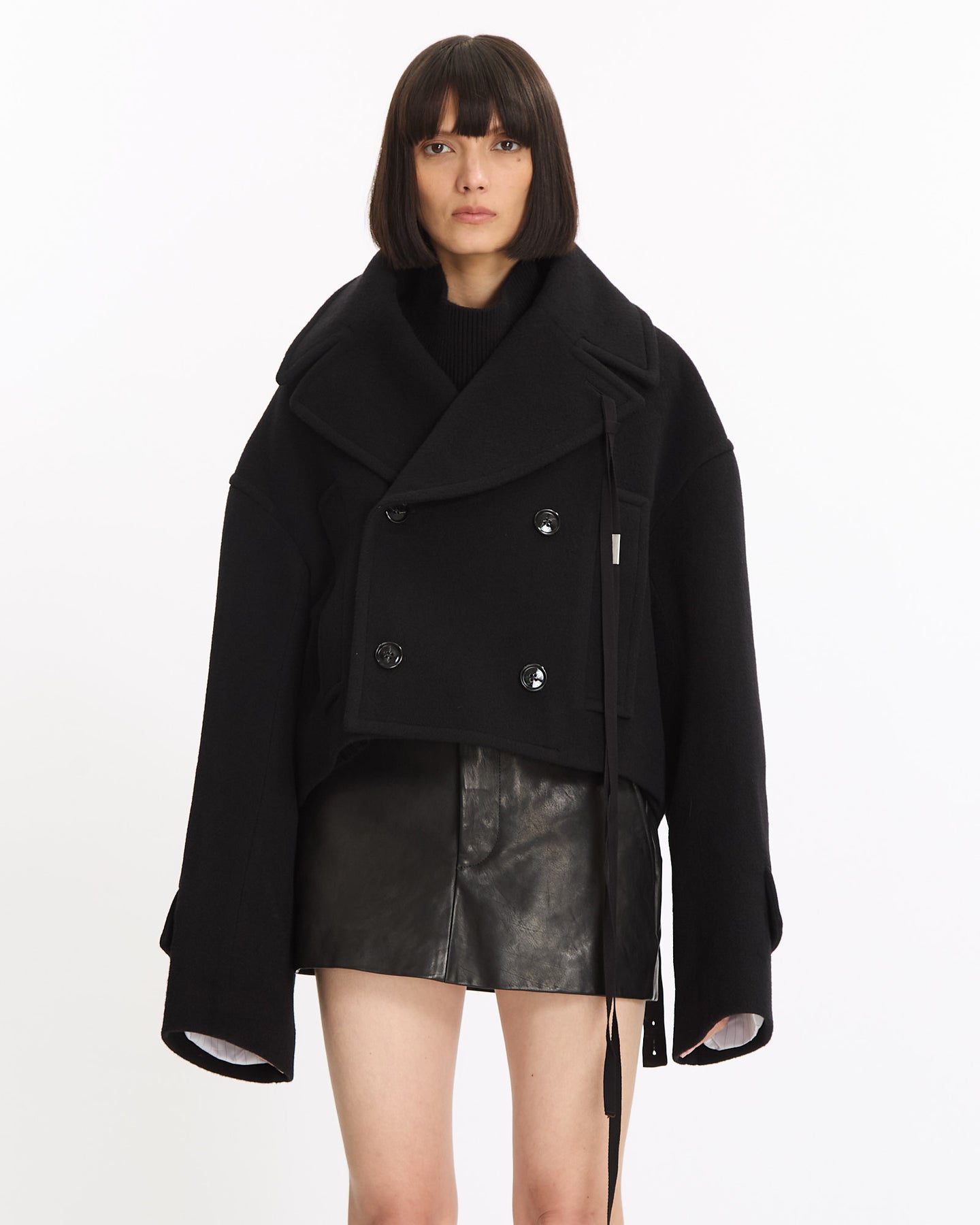 Ann Demeulemeester Davin Peacoat in black features a relaxed silhouette. Details include notched collar, removable ribbon with engraved logo plaque, double-breasted button closure and side pockets.