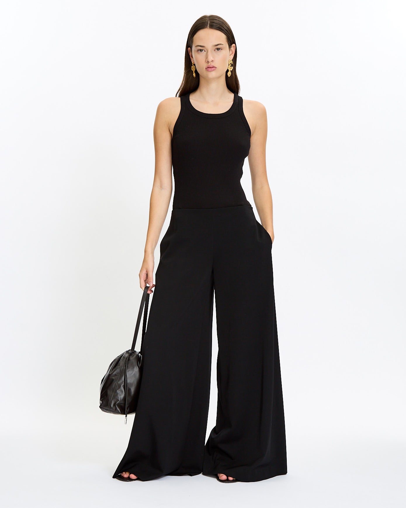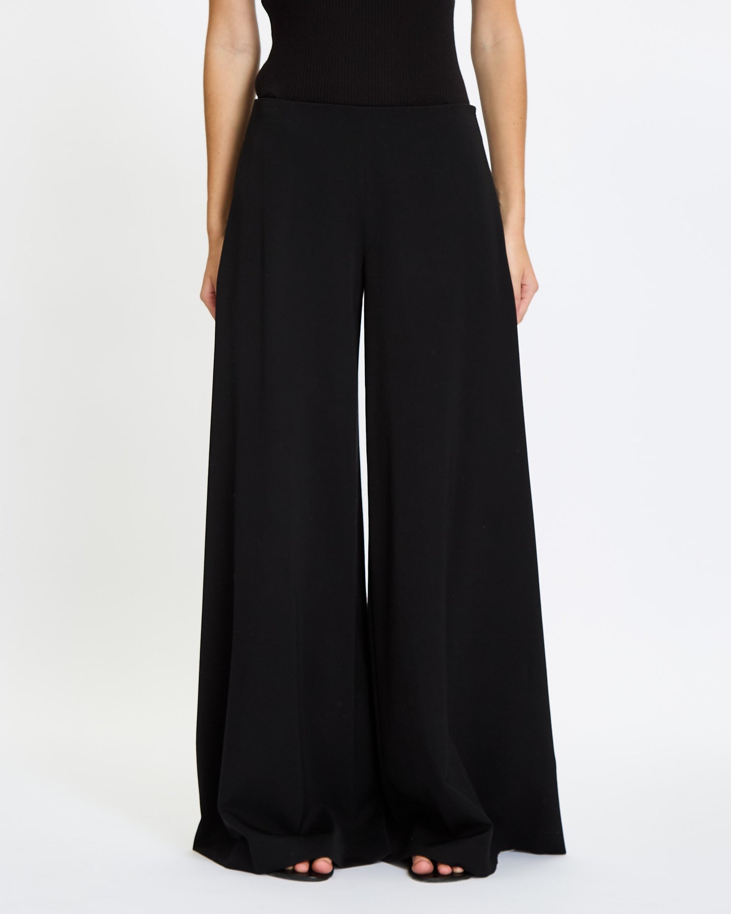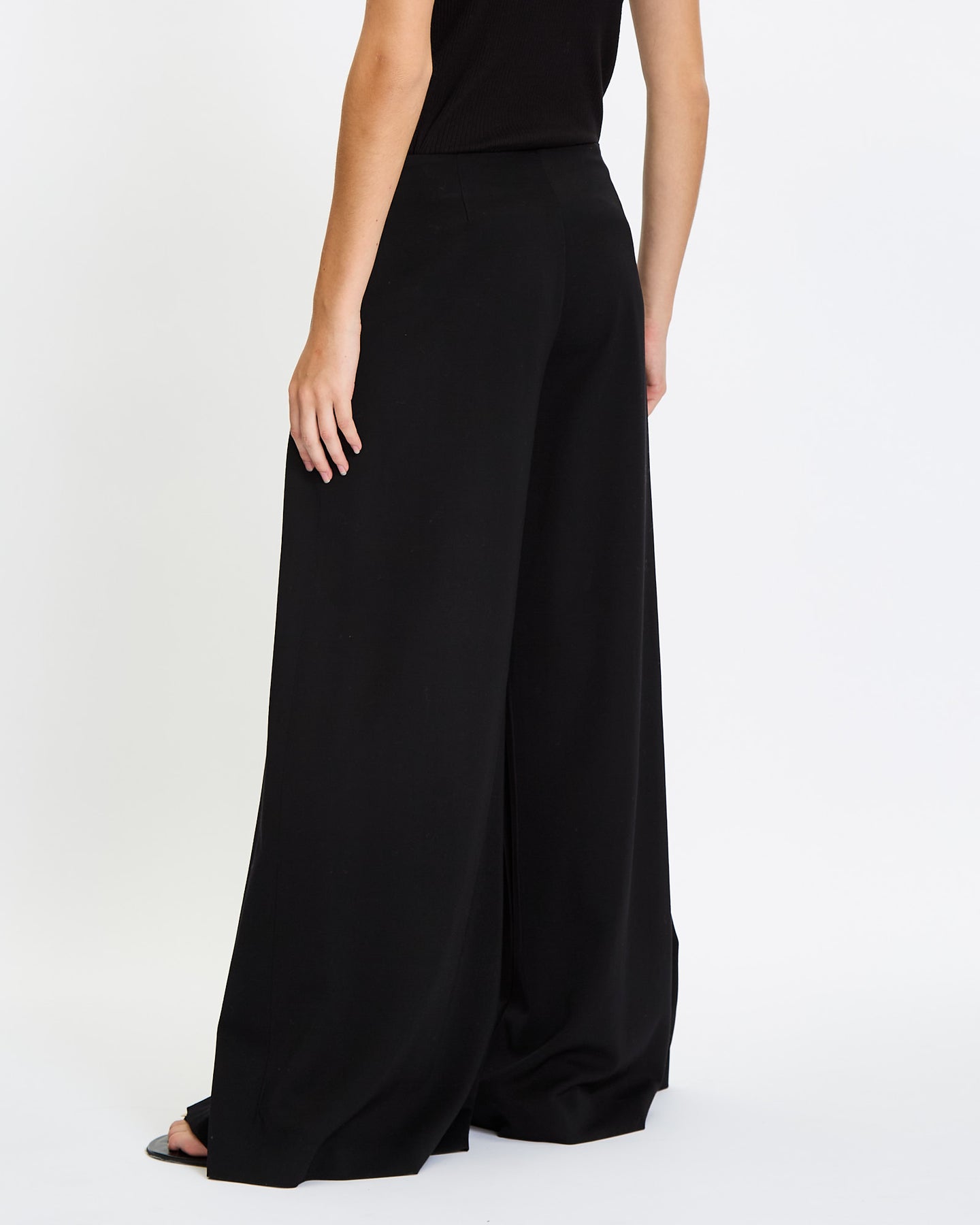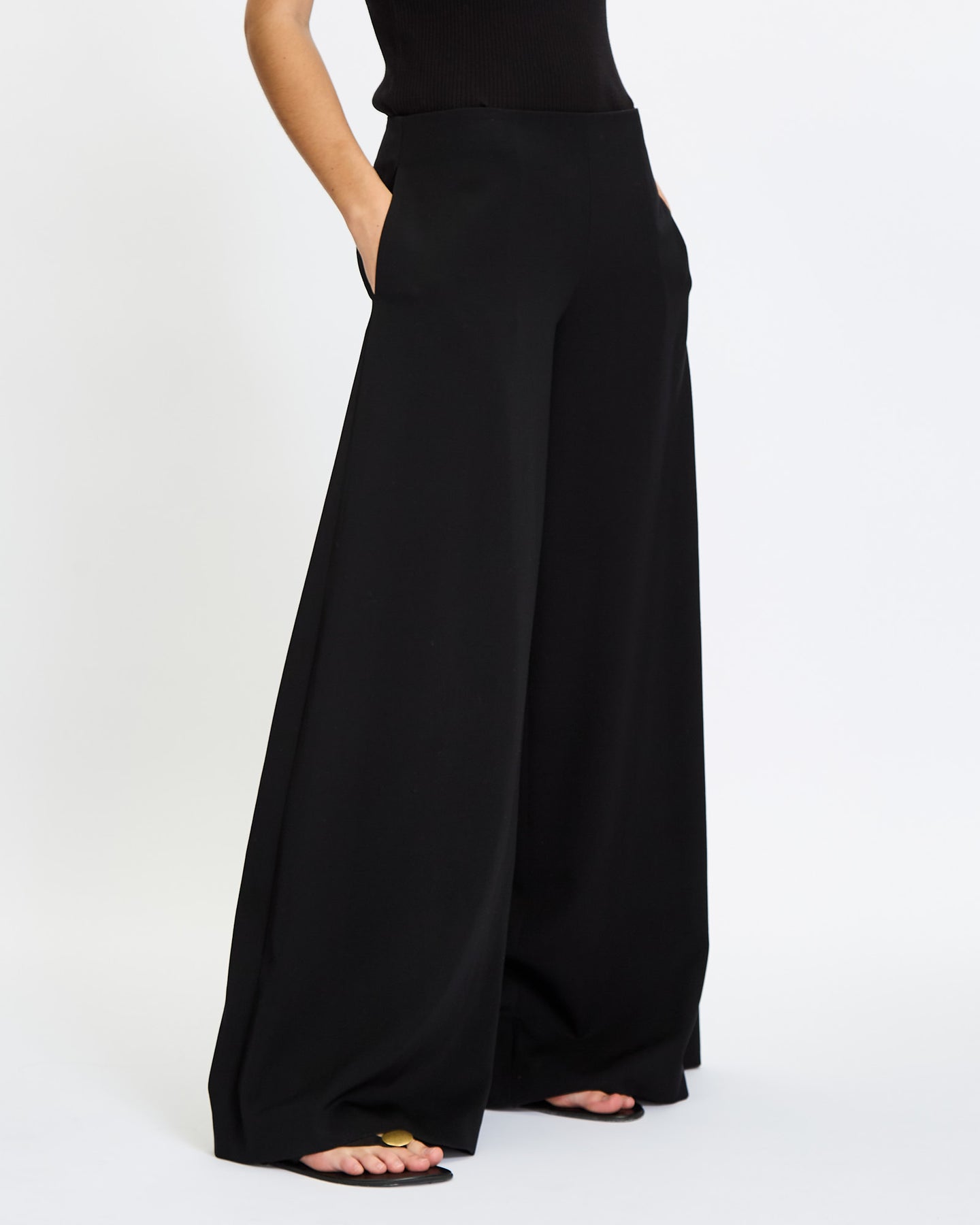 The Row Dela Pant in black features a wide leg silhouette. Details include mid-rise, soft textured wool, side seam pockets, and side zip closure.