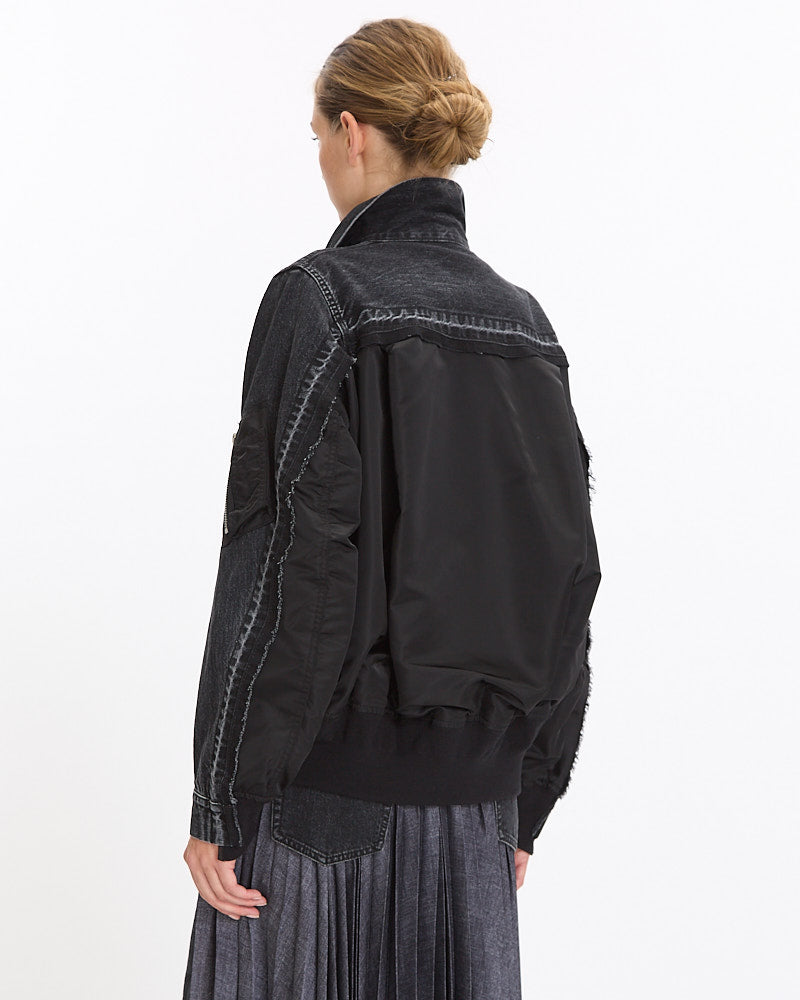 Sacai Nylon Twill Blouson in black features an oversized silhouette with a panelled contrast denim construction. Details include front button closures, patch pockets and ribbed finishing at hem and sleeve cuffs.