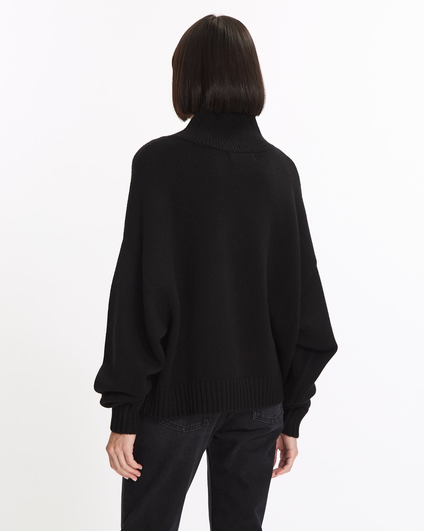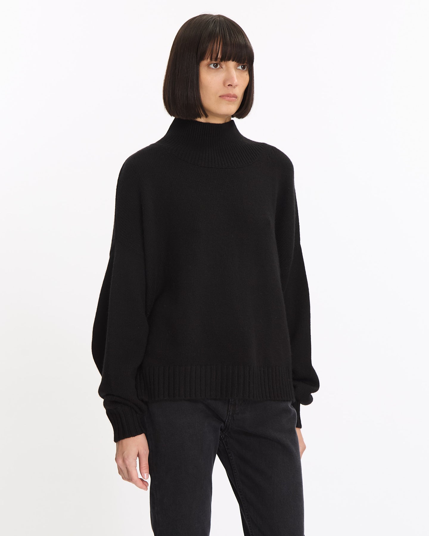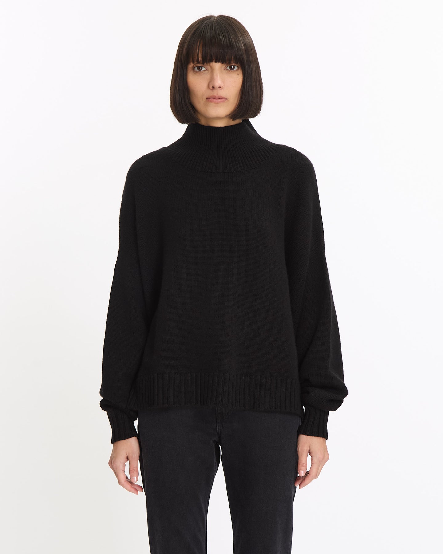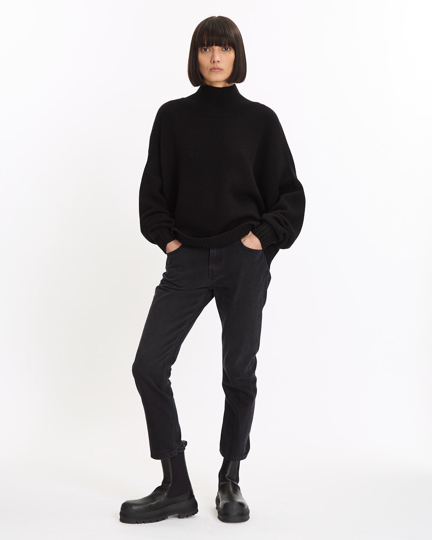 Doffer Boys Devon Turtleneck in black features an oversized fit. Details include boxy cut with dropped shoulder, elongated arms, 3 gauge cashmere knit and ribbed finishing at neck, hem and cuff.
