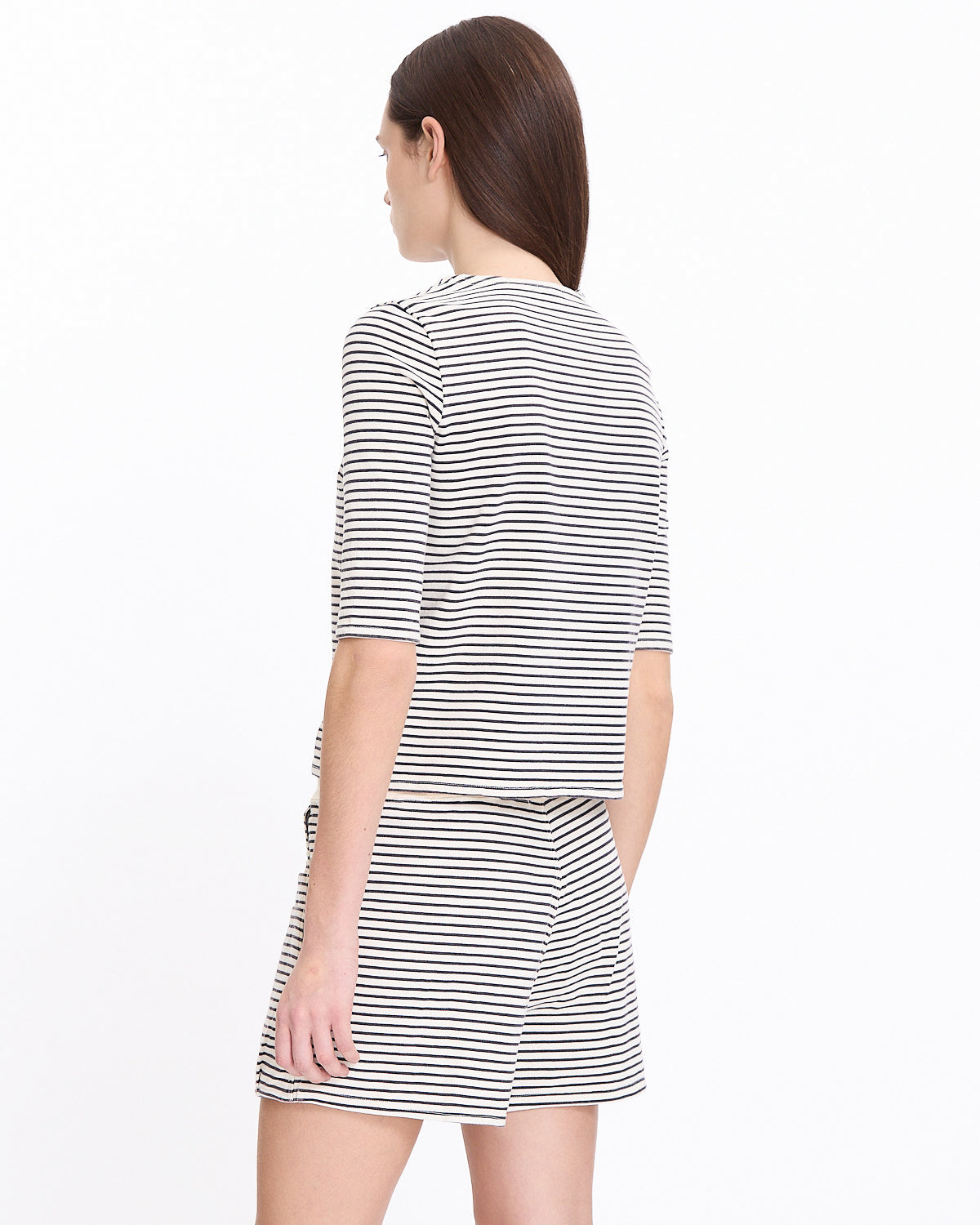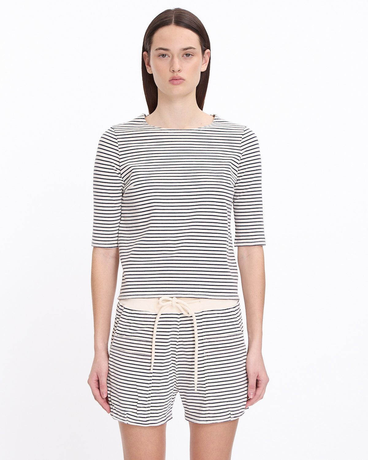 R13 Elbow Sleeve Stripe Tee in navy/ecru features a fitted silhouette in a heavyweight cotton fabrication. Details include bust darts, elbows sleeves and clean finishing at collar, hem and sleeve cuffs.