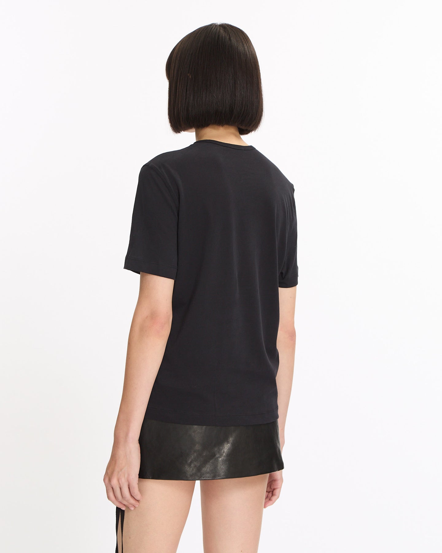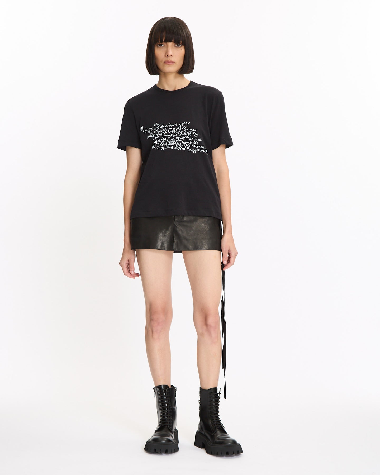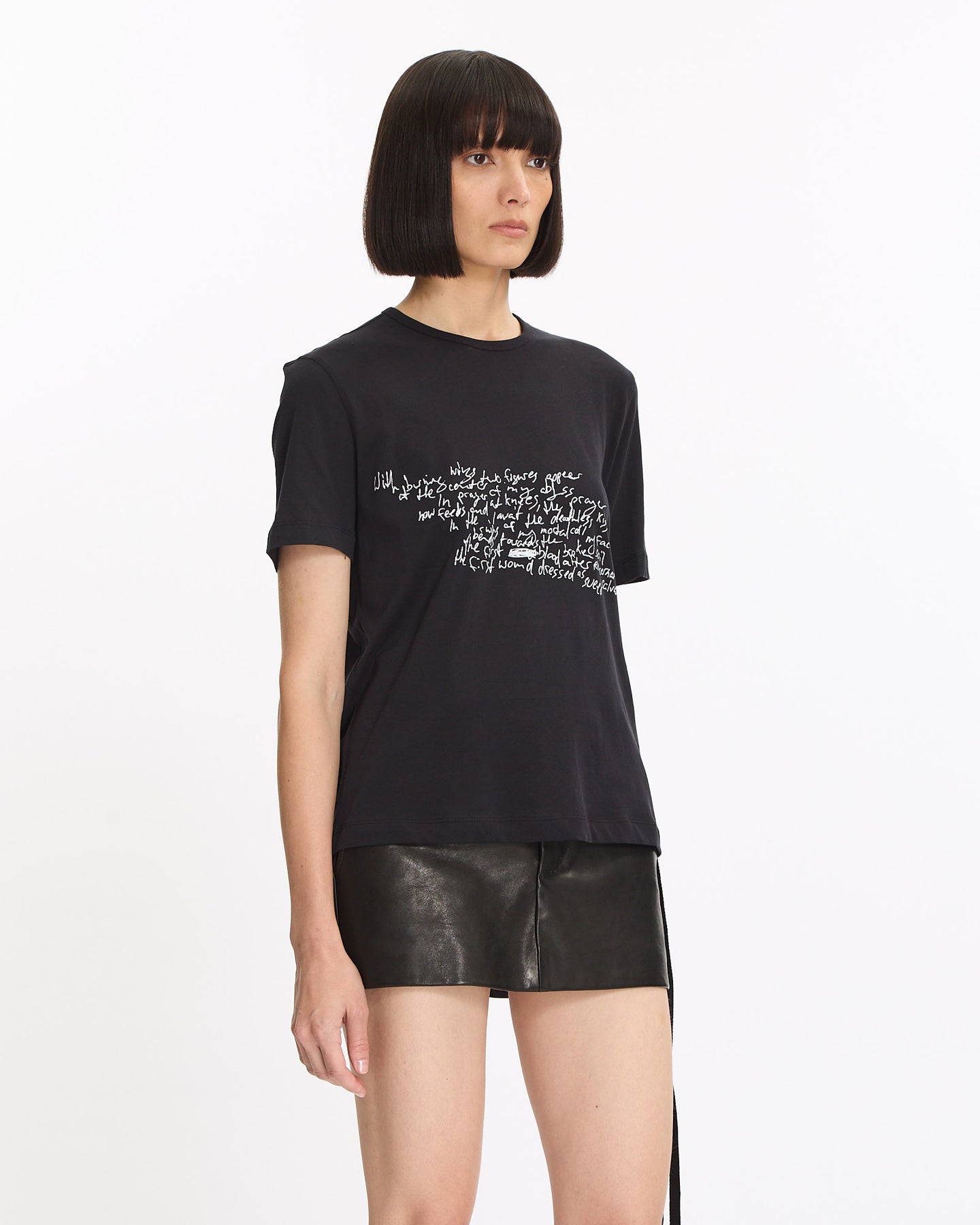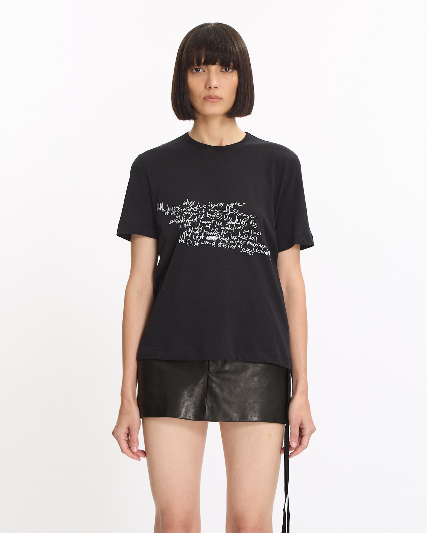 Ann Demeulemeester Faine T-Shirt in black features a relaxed fit. Details include light weight brushed cotton jersey, round neckline, front poem print and dropped shoulders.