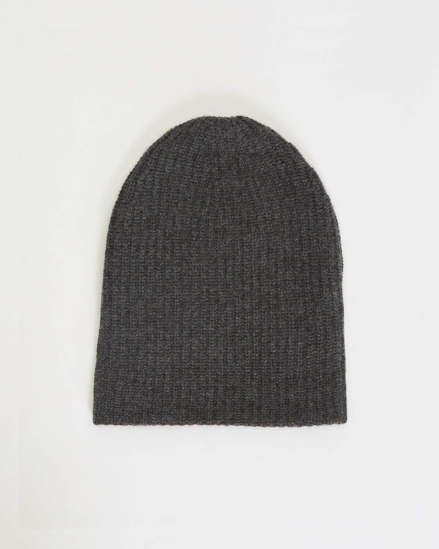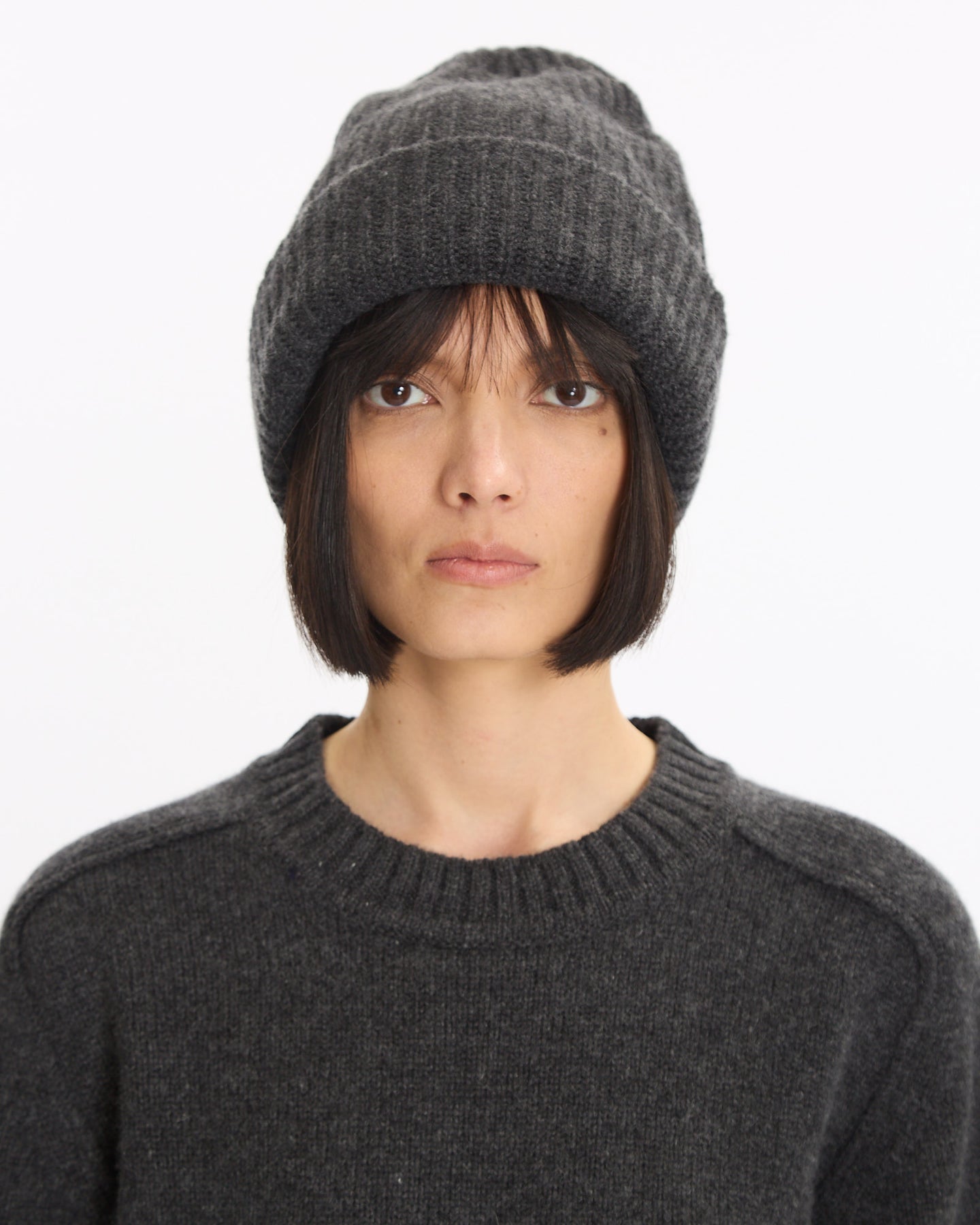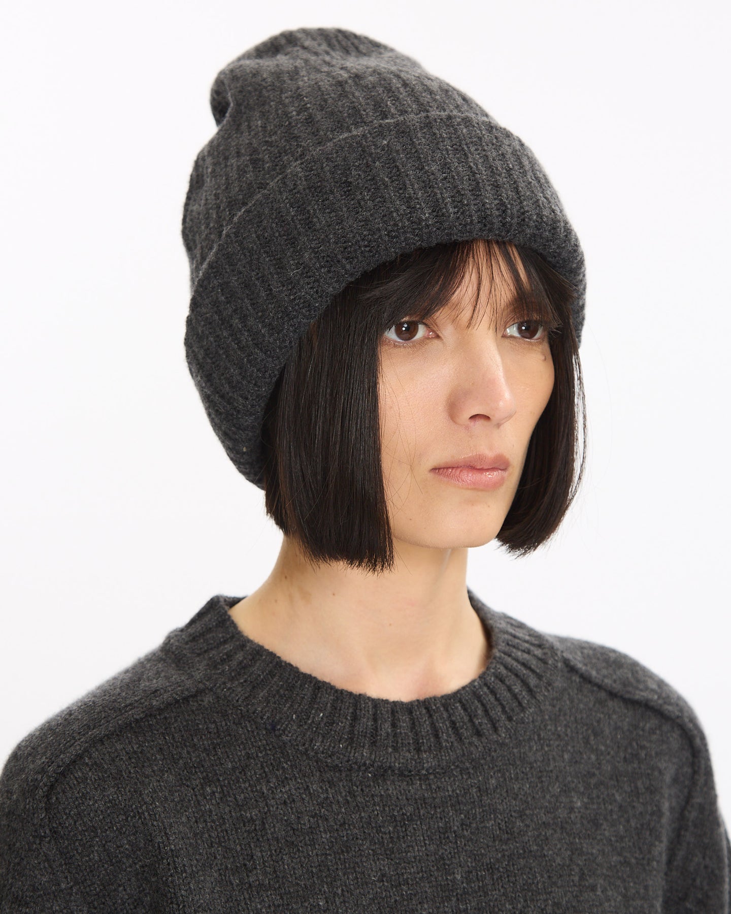 Doffer Boys Fat Hat in charcoal features a double layered toque style in cashmere knit with an adjustable roll cuff.