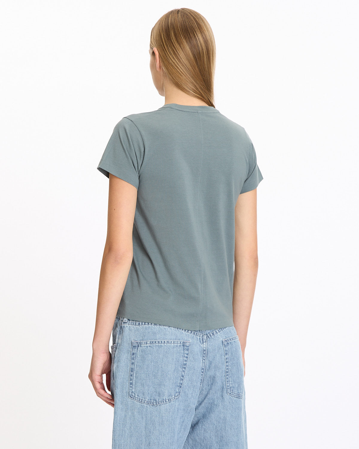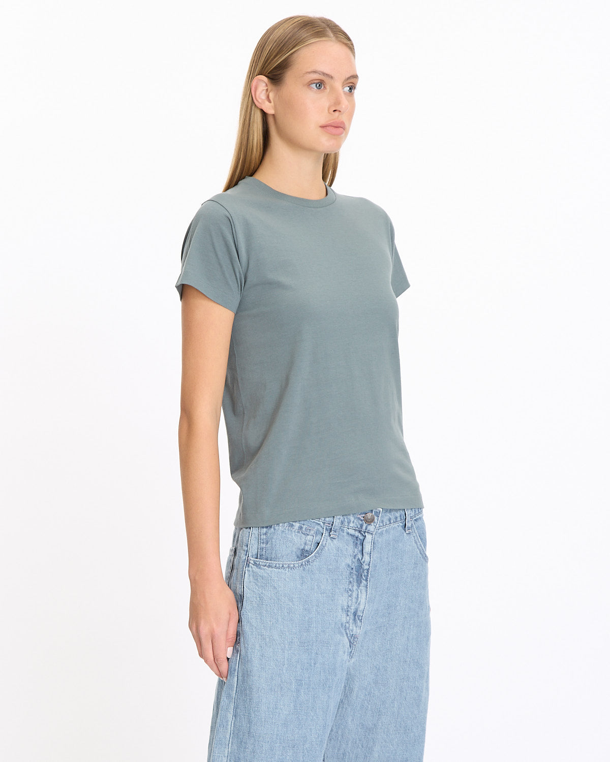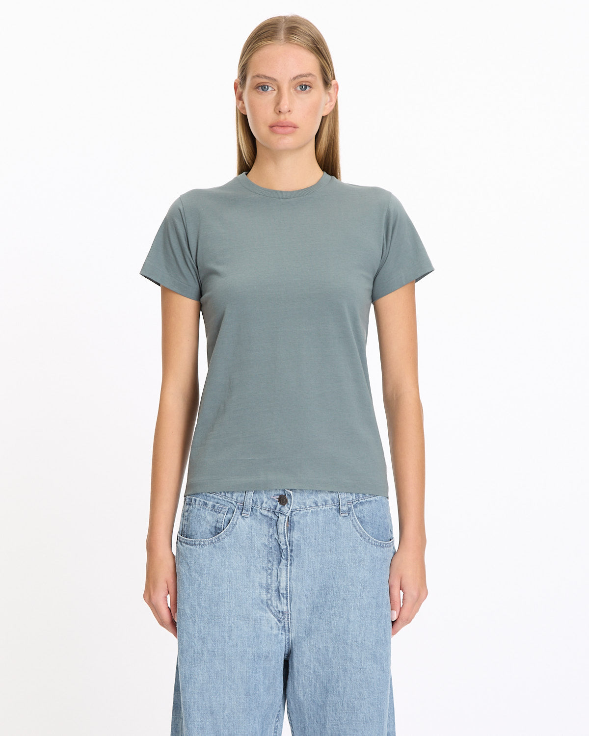 The Row Florie Top in timouse grey features a classic crewneck silhouette in a brushed organic cotton jersey fabrication. Details include slim fit, short sleeves, ribbed neckline and The Row signature centre back detail.