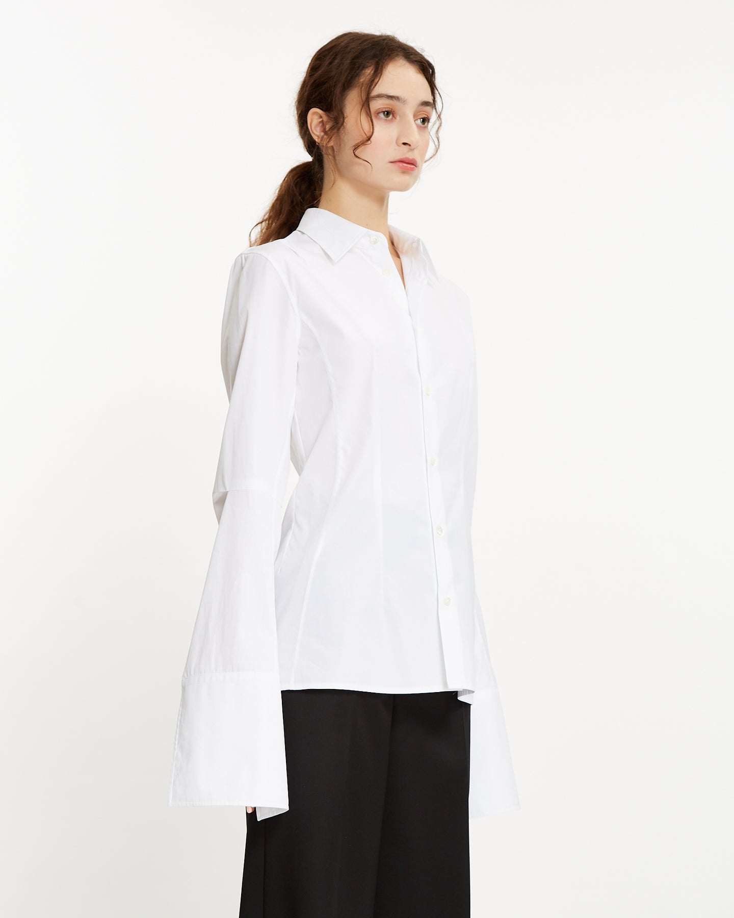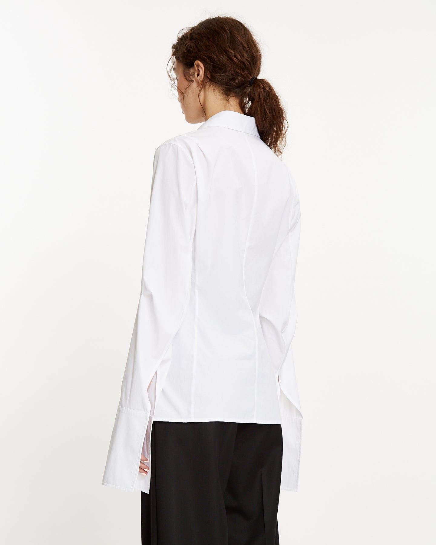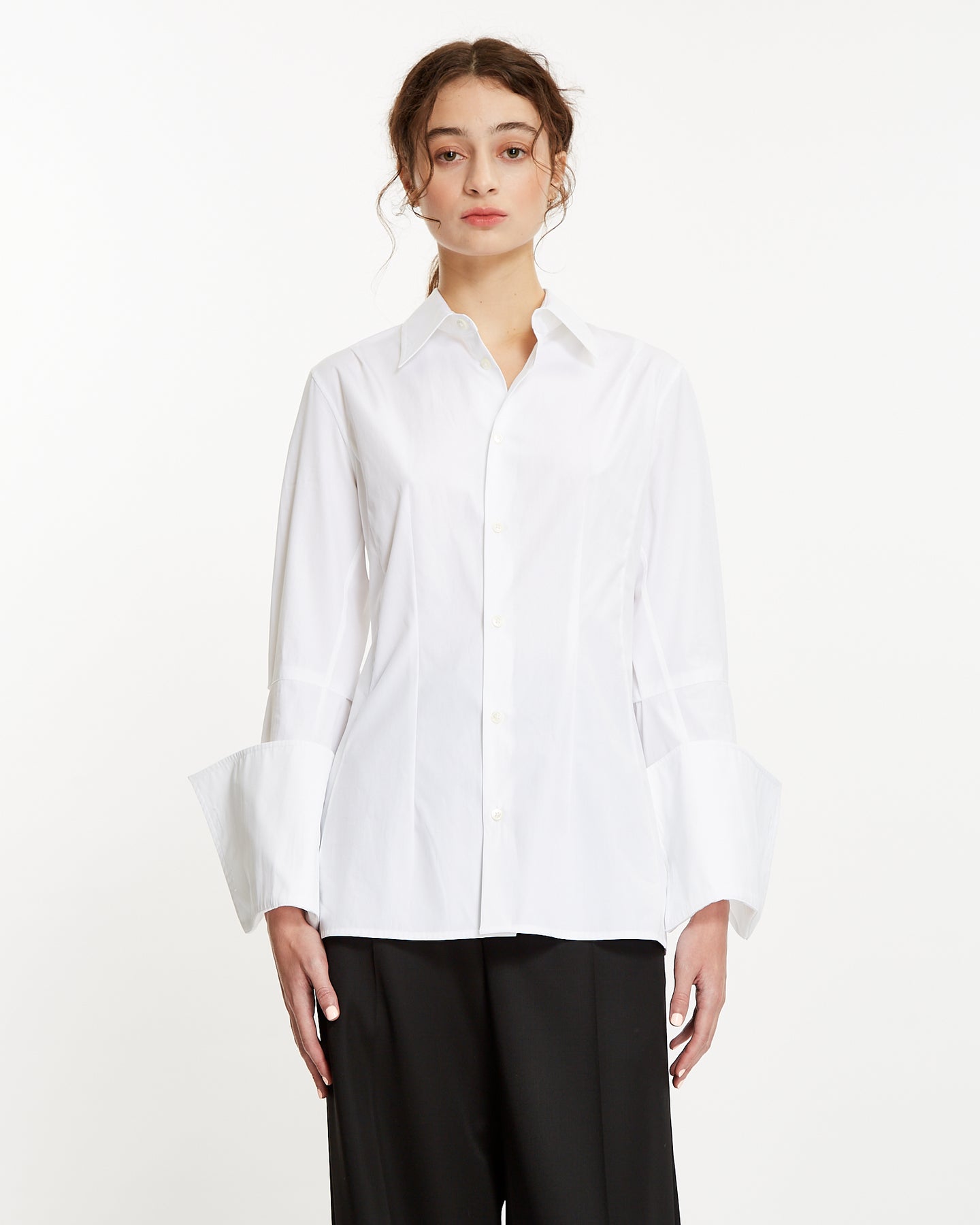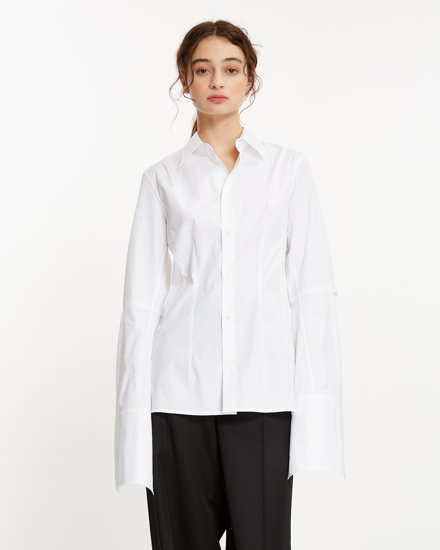 Ann Demeulemeester Gracienne Shirt in white features a fitted silhouette. Details include spread collar, front button closure at open front and exaggerated elongated vent cuffs