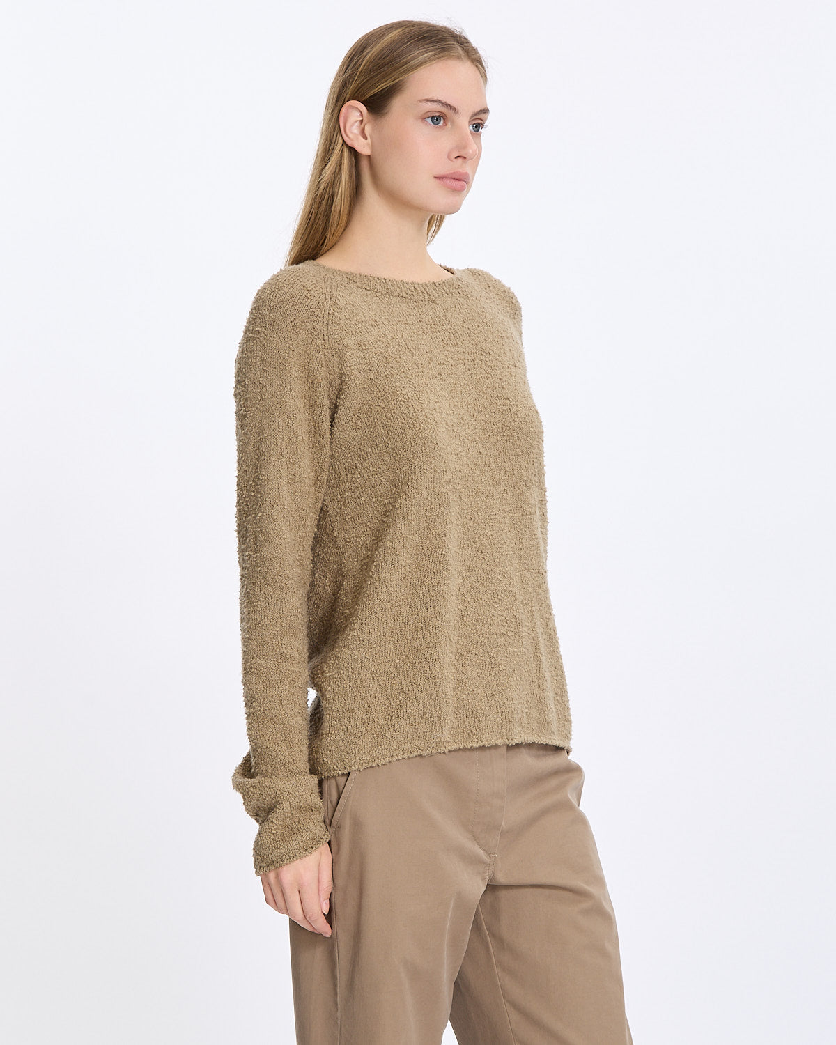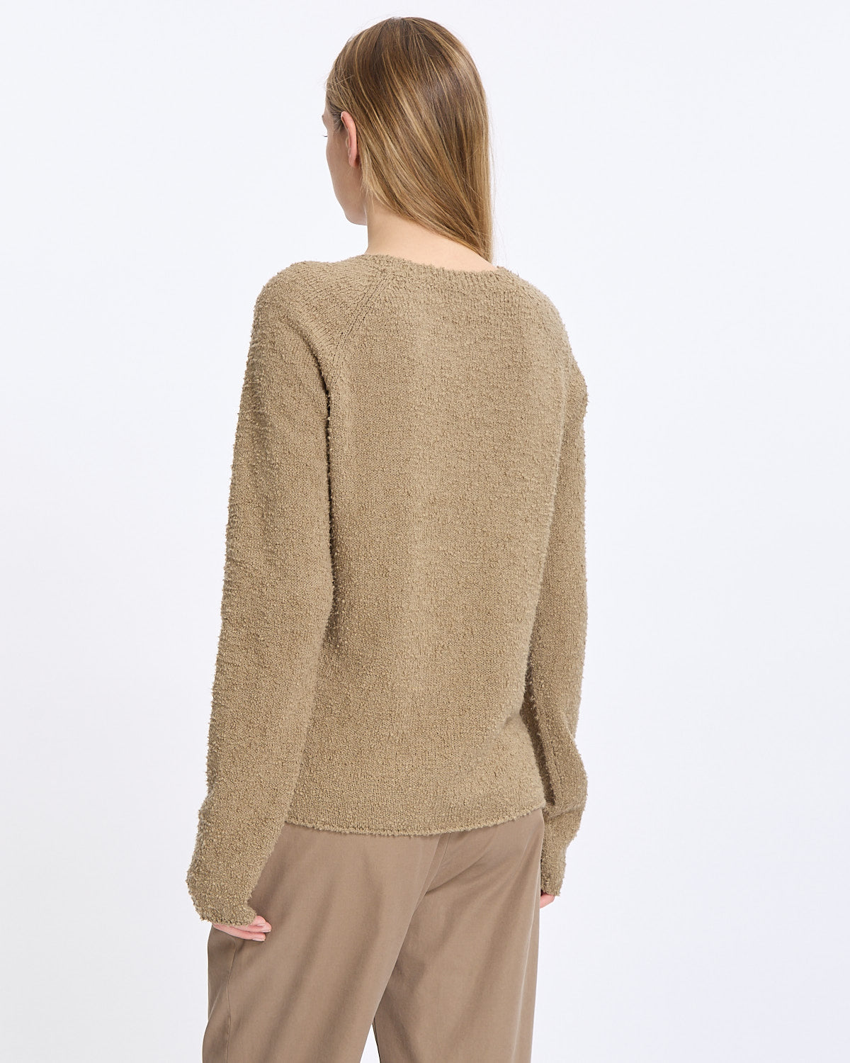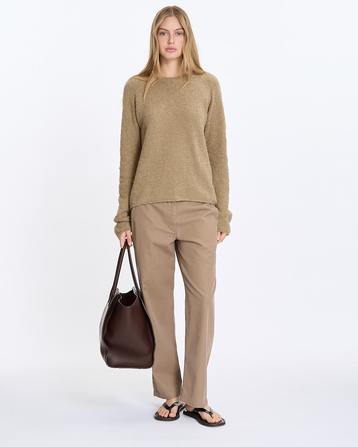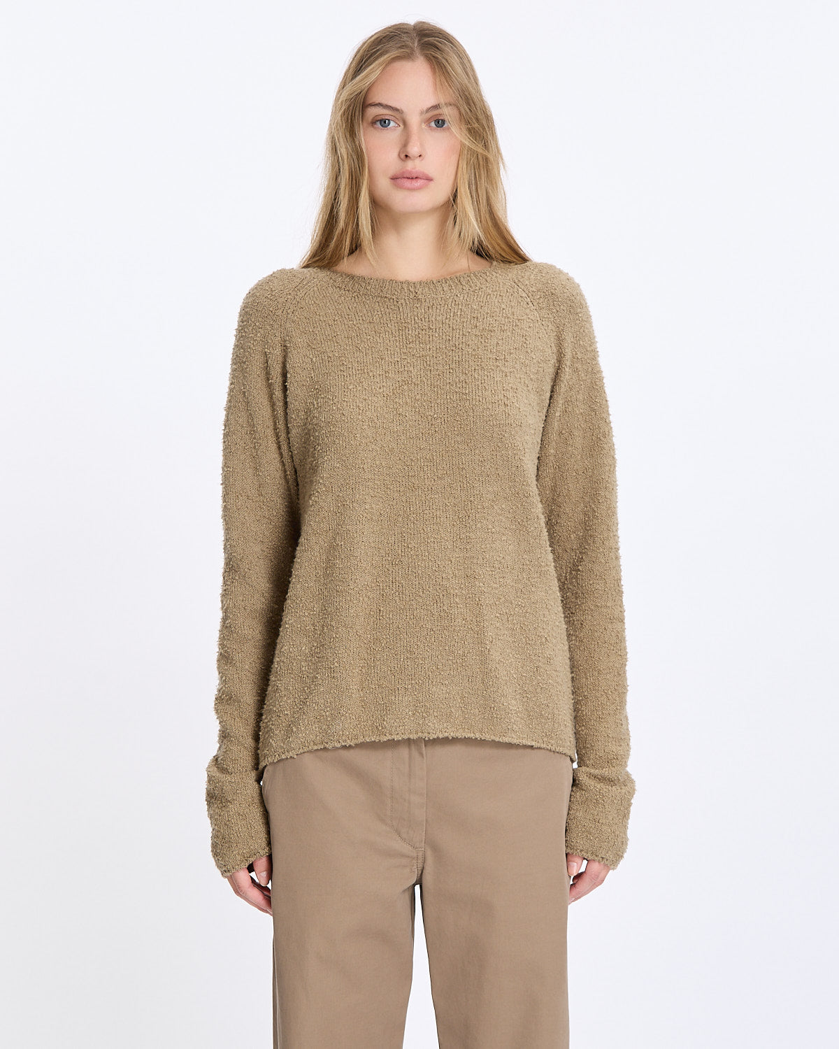 The Row Kathy Sweater in khaki features a relaxed crewneck fit in a textured bouclé fabrication. Details include raglan sleeves and ribbed finishing at neckline.