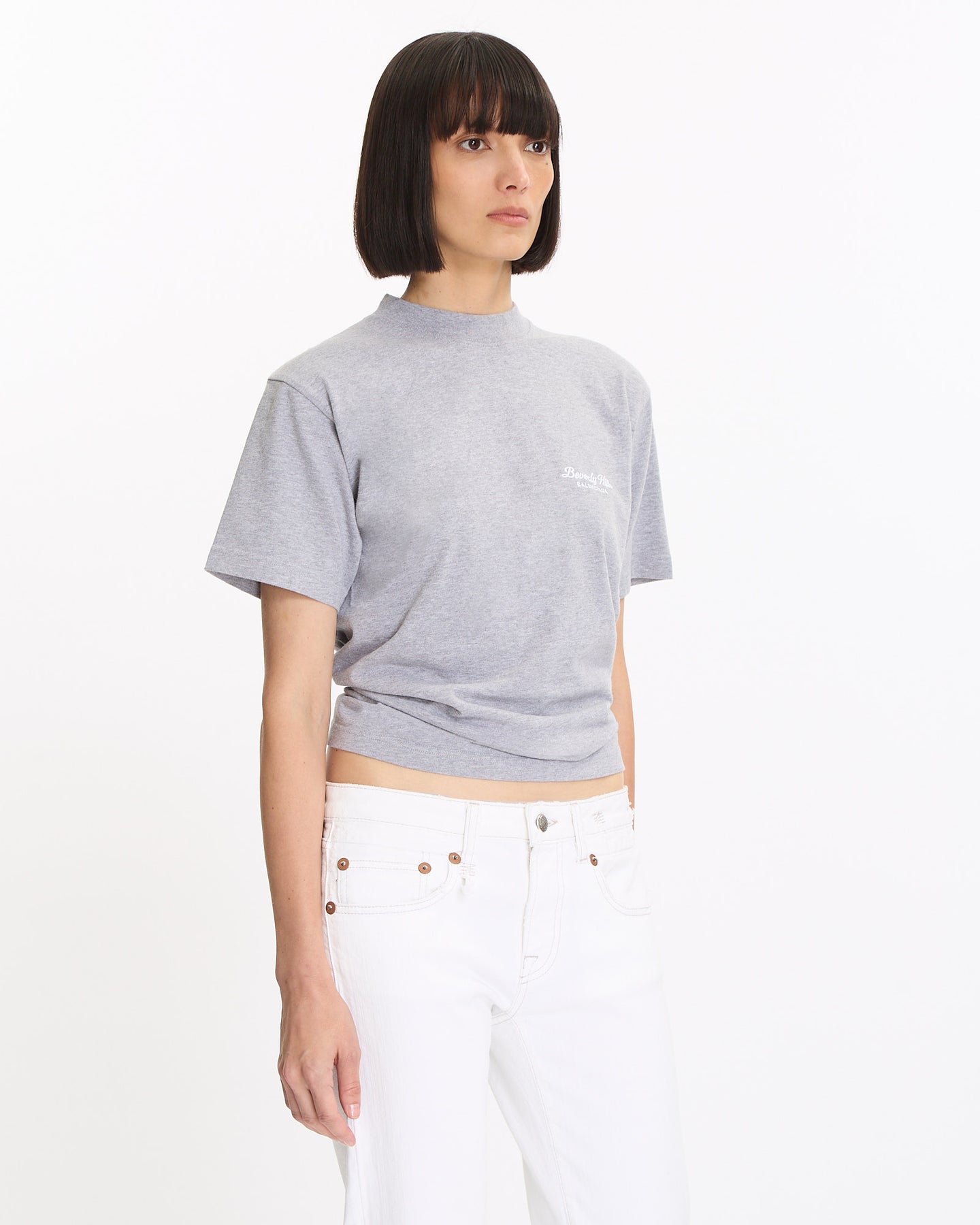 Balenciaga Knotted T-Shirt in grey and white features a small fit. Details include vintage jersey, crewneck, short sleeves, knot detailing at back and Beverly Hills logo on chest.