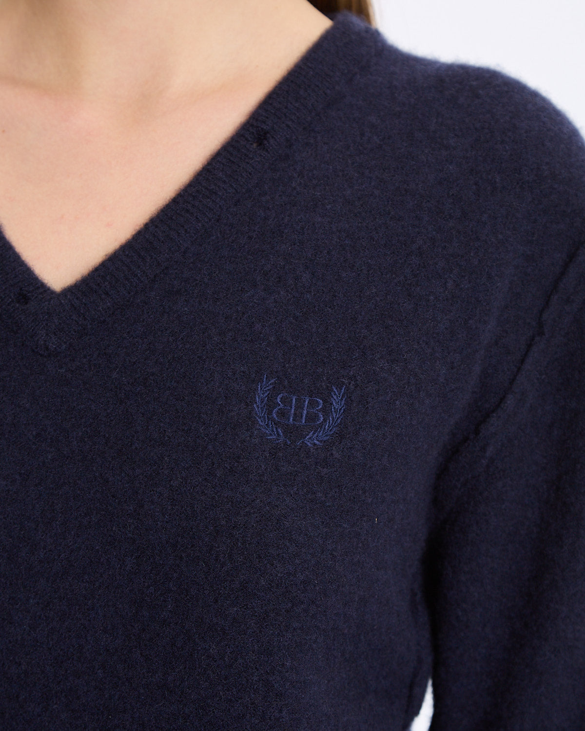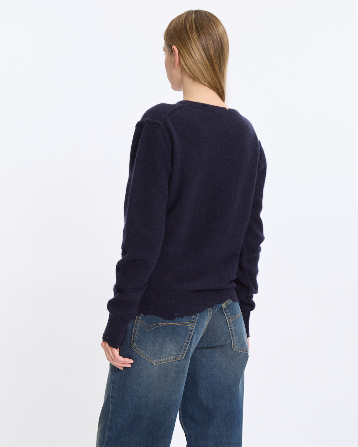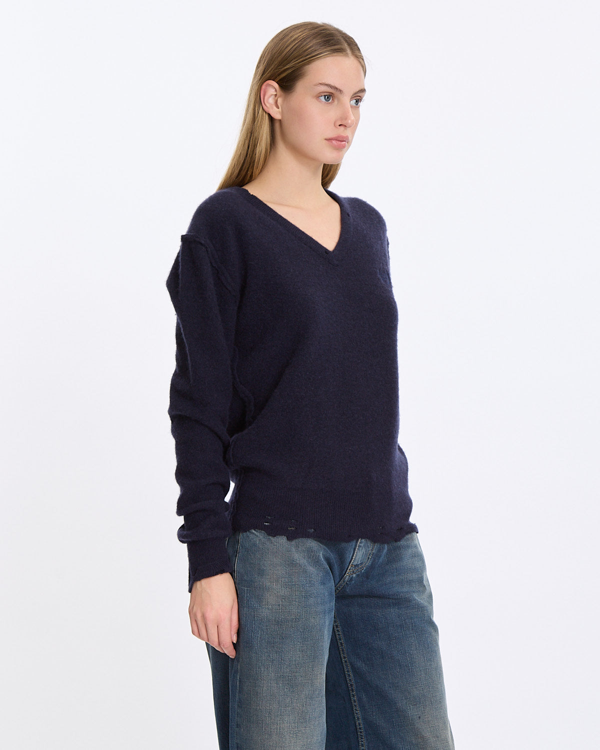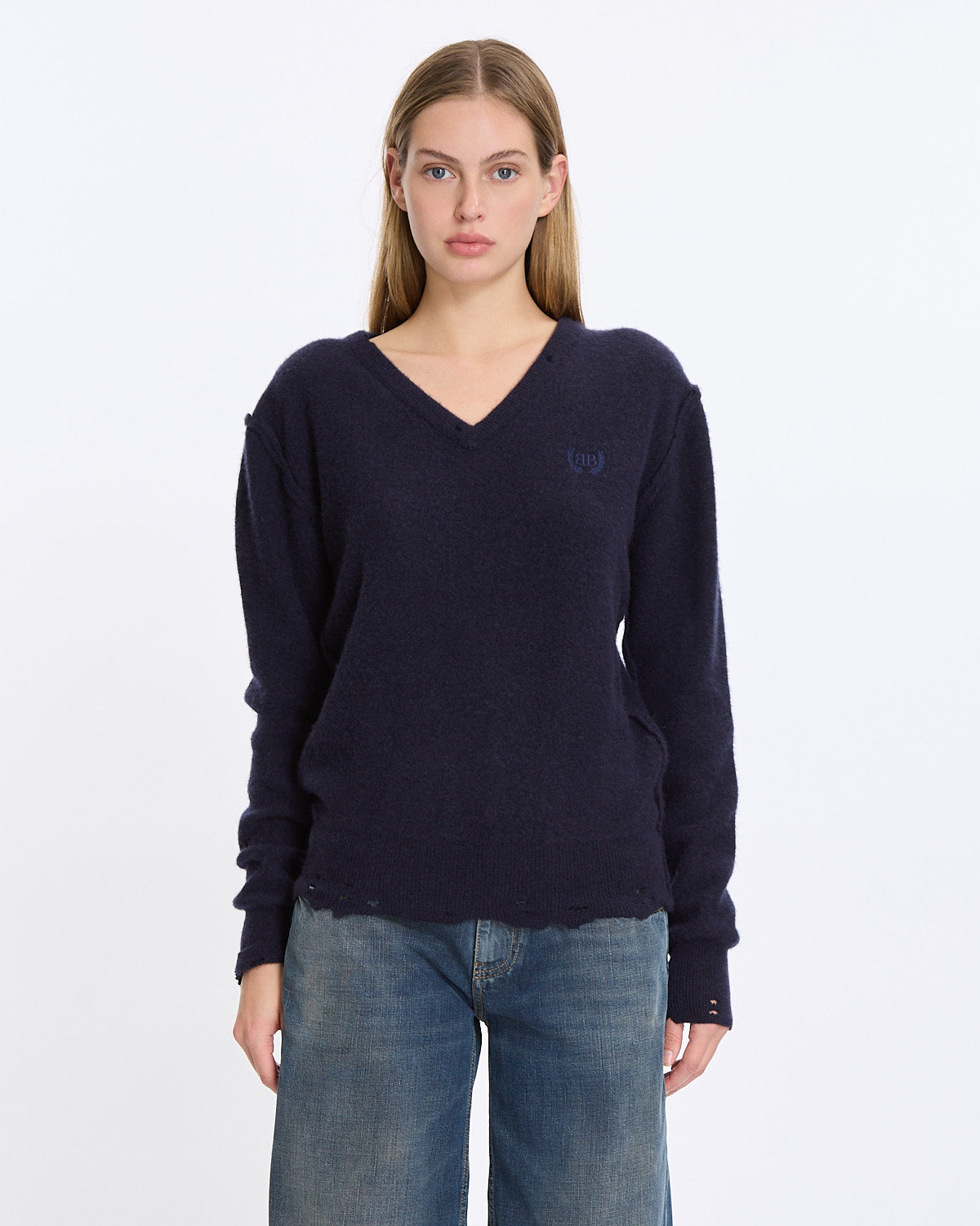 Balenciaga Laurel Inside Out V-Neck Sweater in navy features a classic silhouette in an exposed seam construction with distressed detailing. Details include dropped shoulders and chest embroidery.