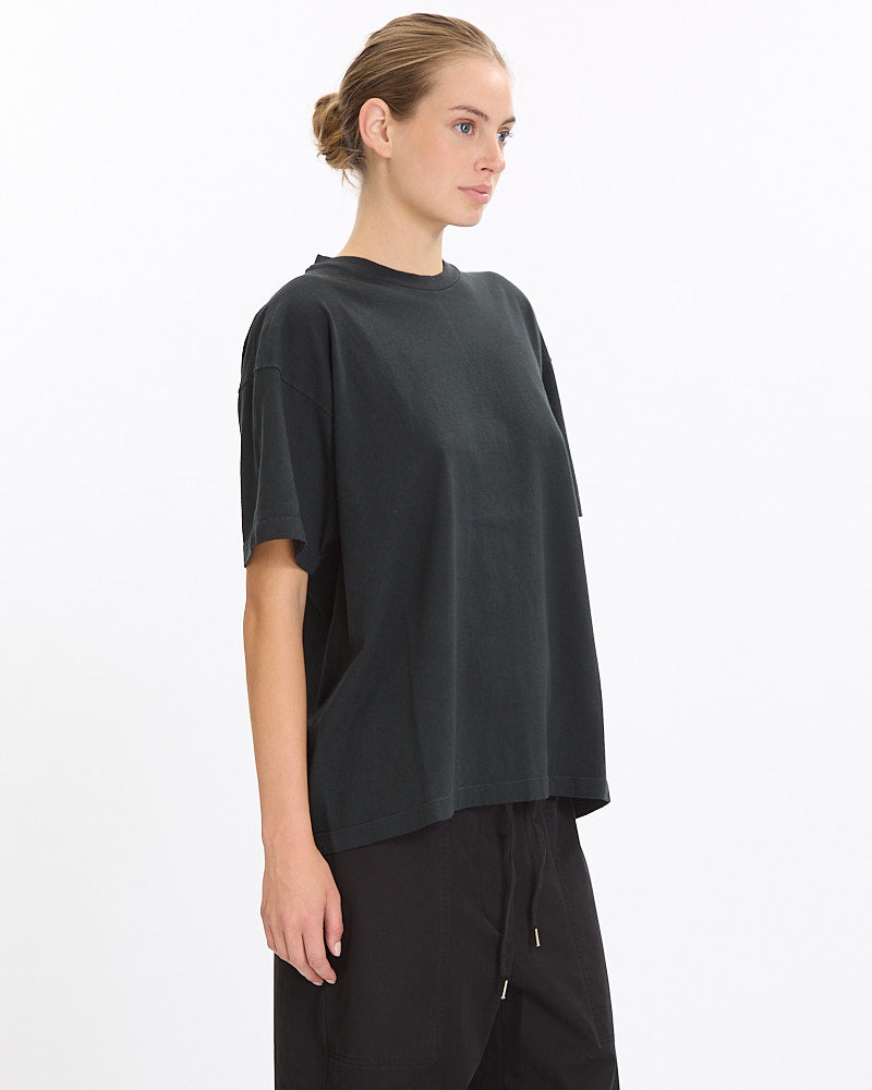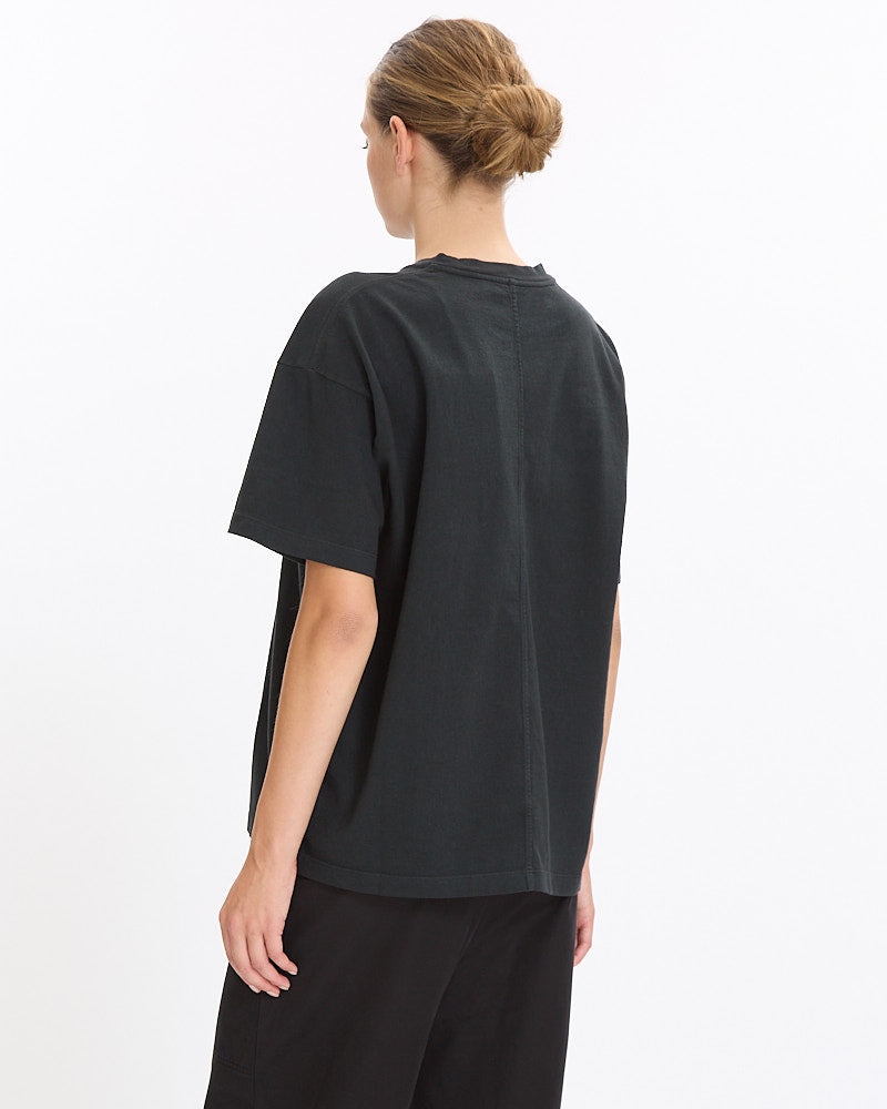The Row Lavinia Top in black features an oversized t-shirt silhouette in a mid weight jersey fabrication. Details include ribbed crew neckline and signature centre back detail.