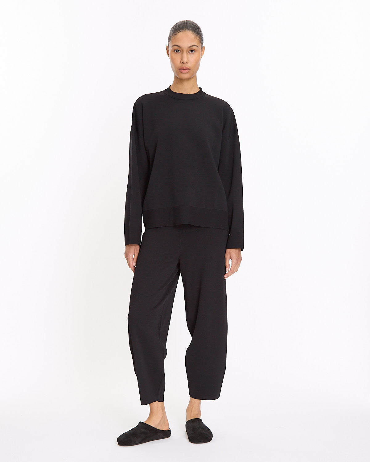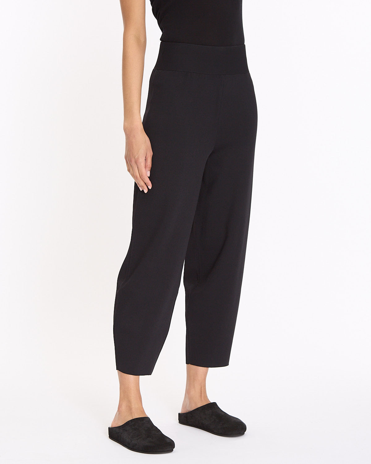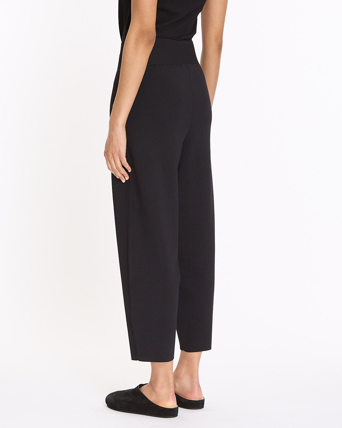 Studio Nicholson Moura Pant in darkest navy features a tapered silhouette with a gently rounded shape. Details include elasticated waist and slight crop.