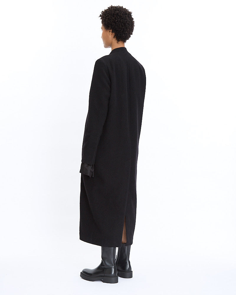 Rick Owens Museum Coat in black features a double breasted design with a minimal v-neckline collar. Details include concealed button closure, back vent, side welt pockets and five-button surgeon’s cuffs.