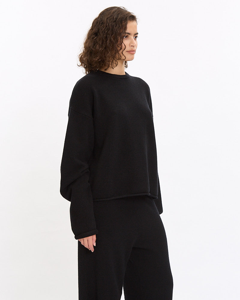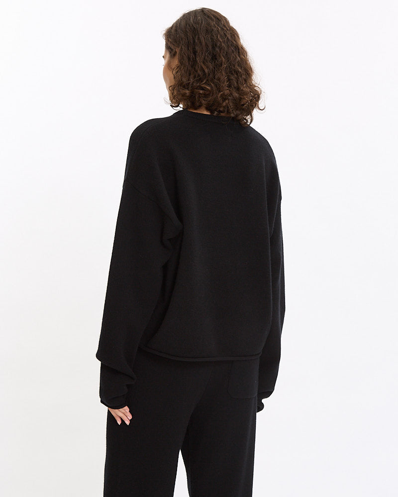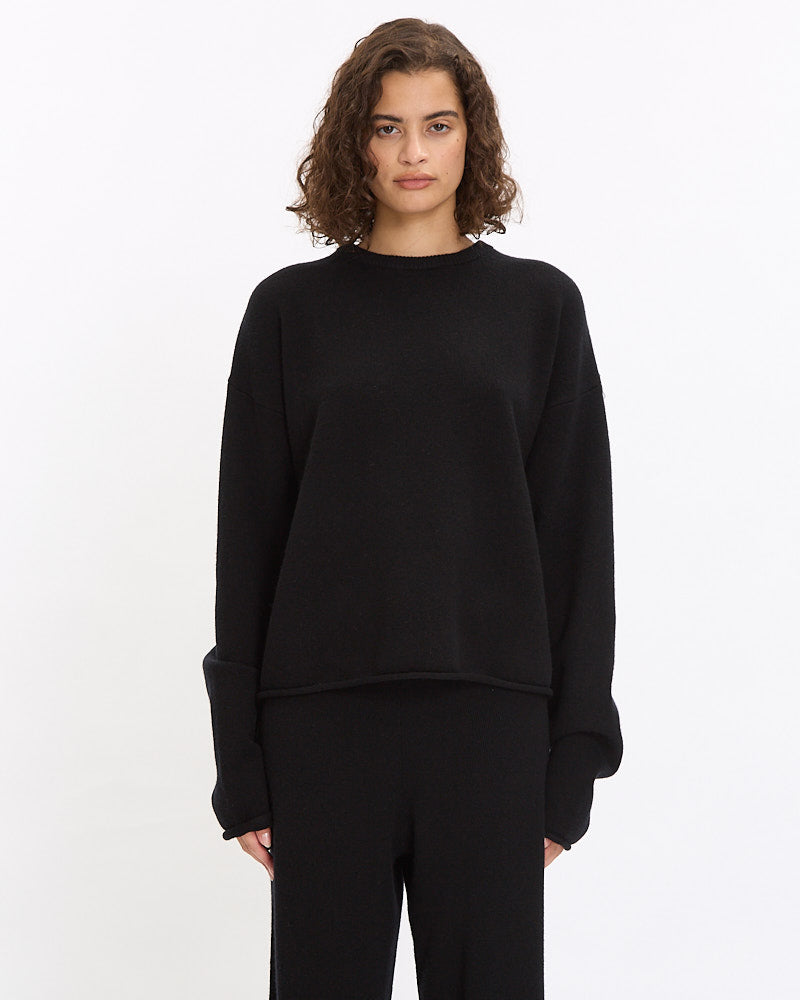 Extreme Cashmere N°246 Comfy Sweater in raven features a boxy fit with a slight crop. Details include long sleeves, ribbed finished crew neckline and rolled edge hem.