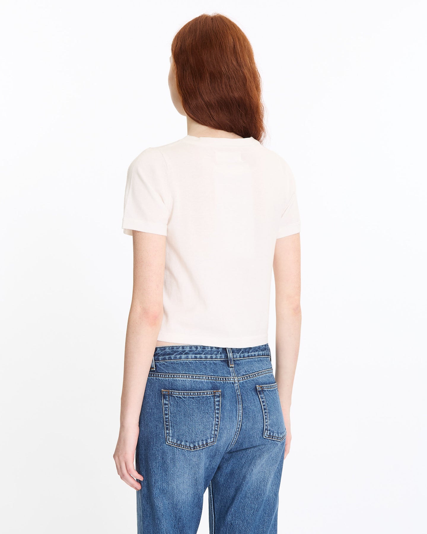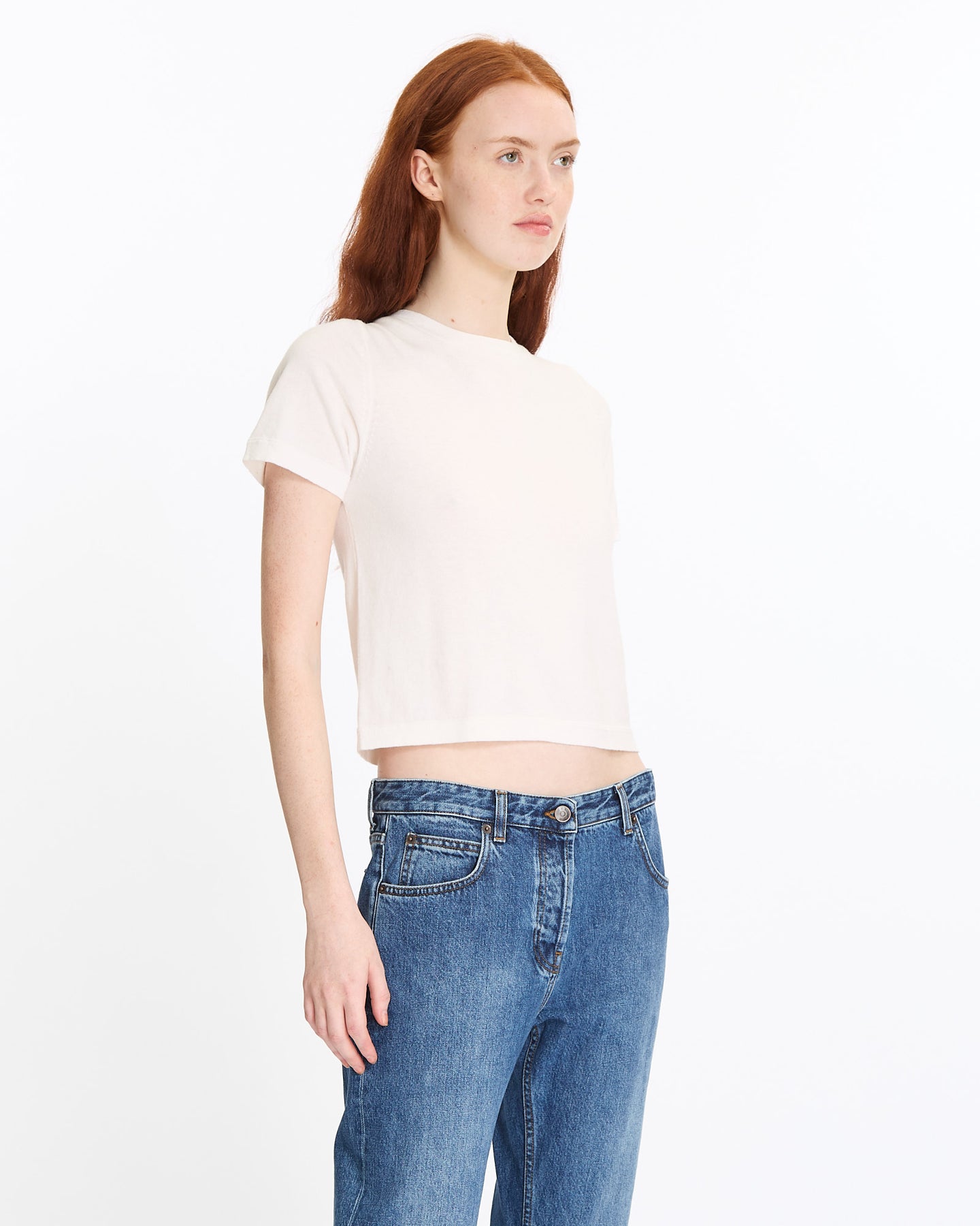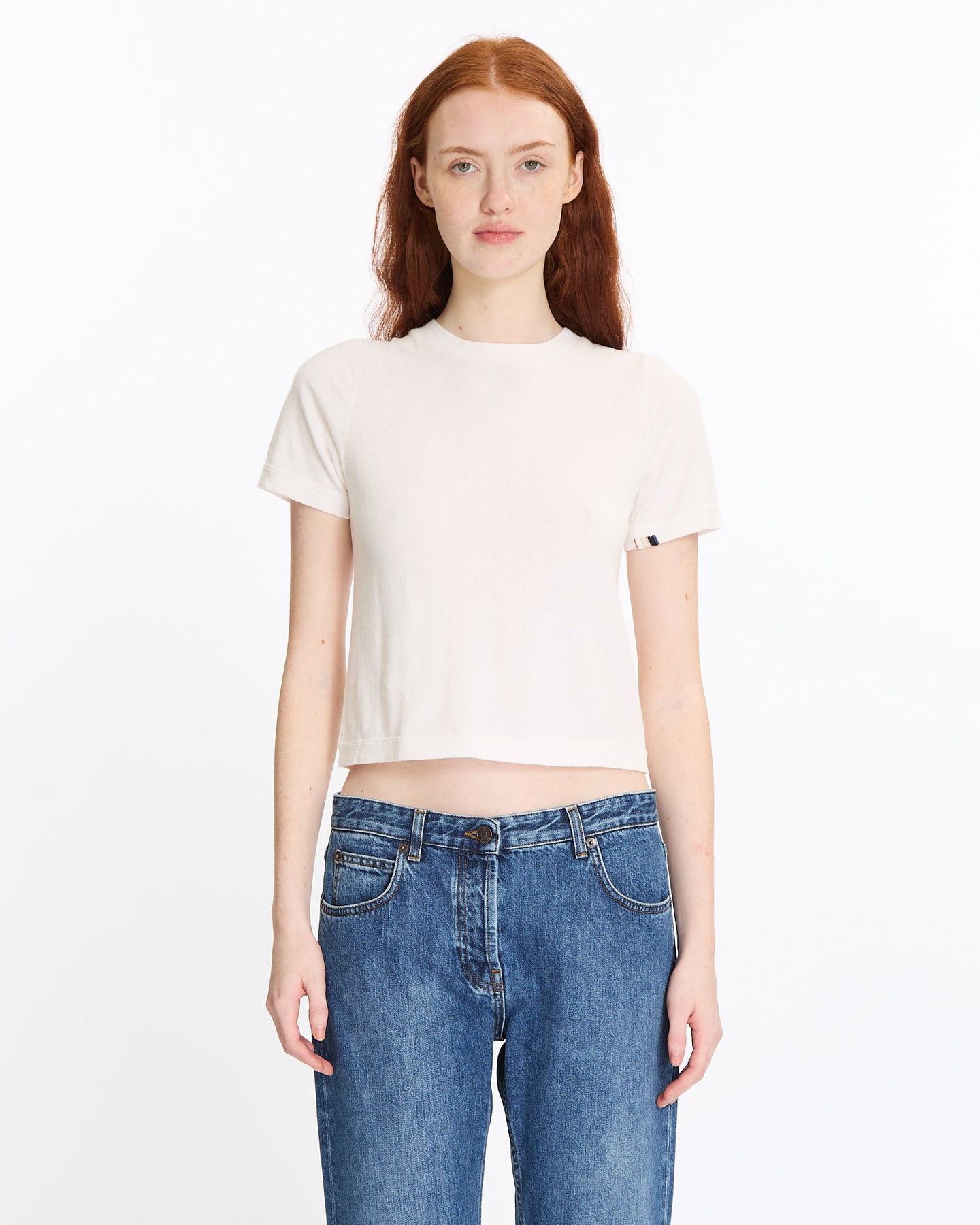 Extreme Cashmere N°267 Tina in snow features a shrunken silhouette. Details include small, short-sleeve, light weight cotton-cashmere fabrication and crew neckline.