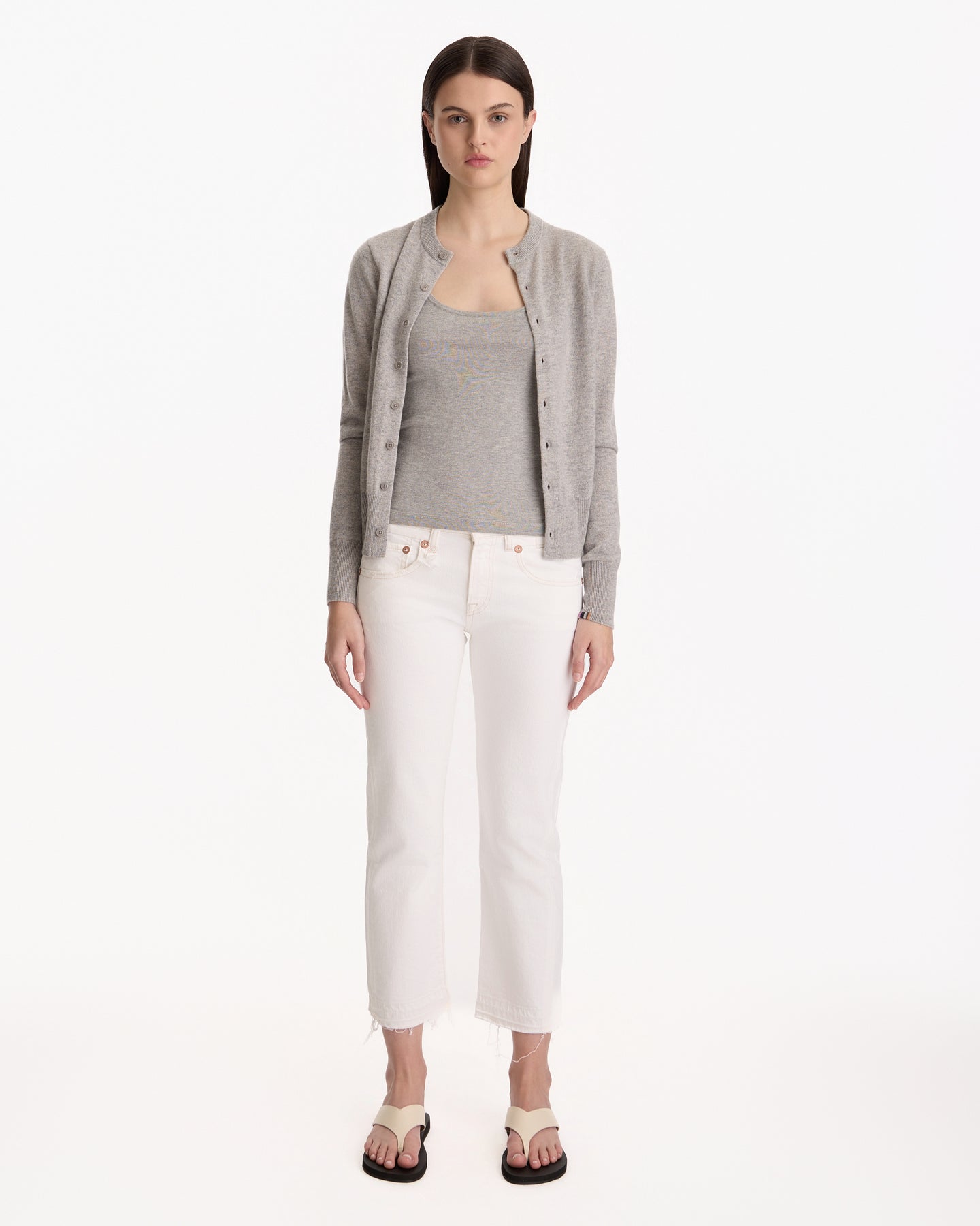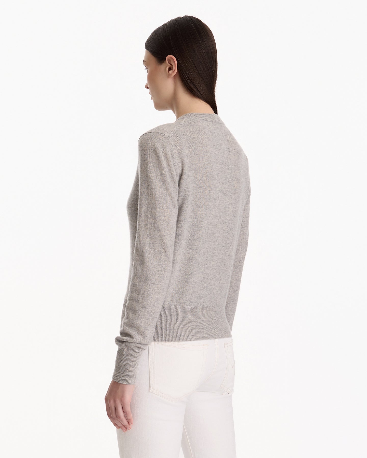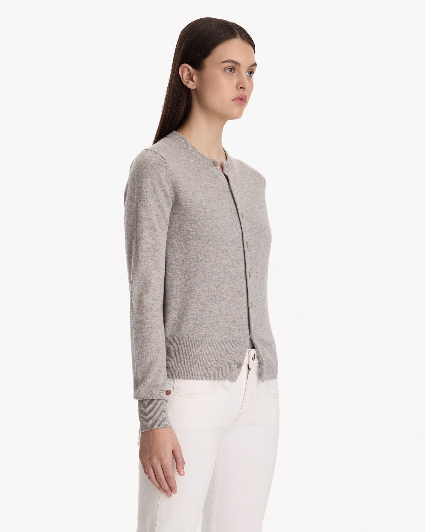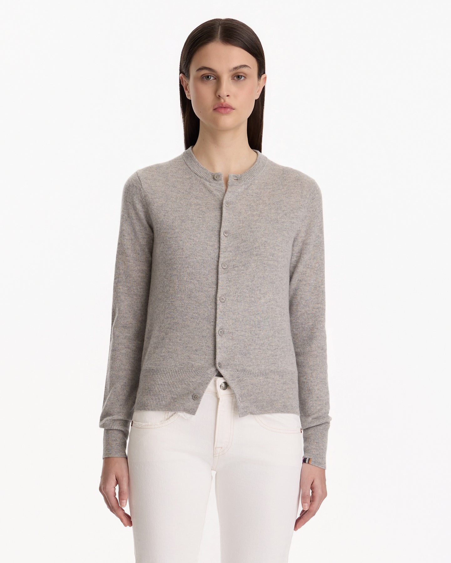 Extreme Cashmere N°300 Little 2 Cardigan in grey features a classic crewneck cardigan in a lightweight cashmere fabrication. Details include front button closures, petite fit and ribbed finishing at neckline, sleeve cuffs and hem.