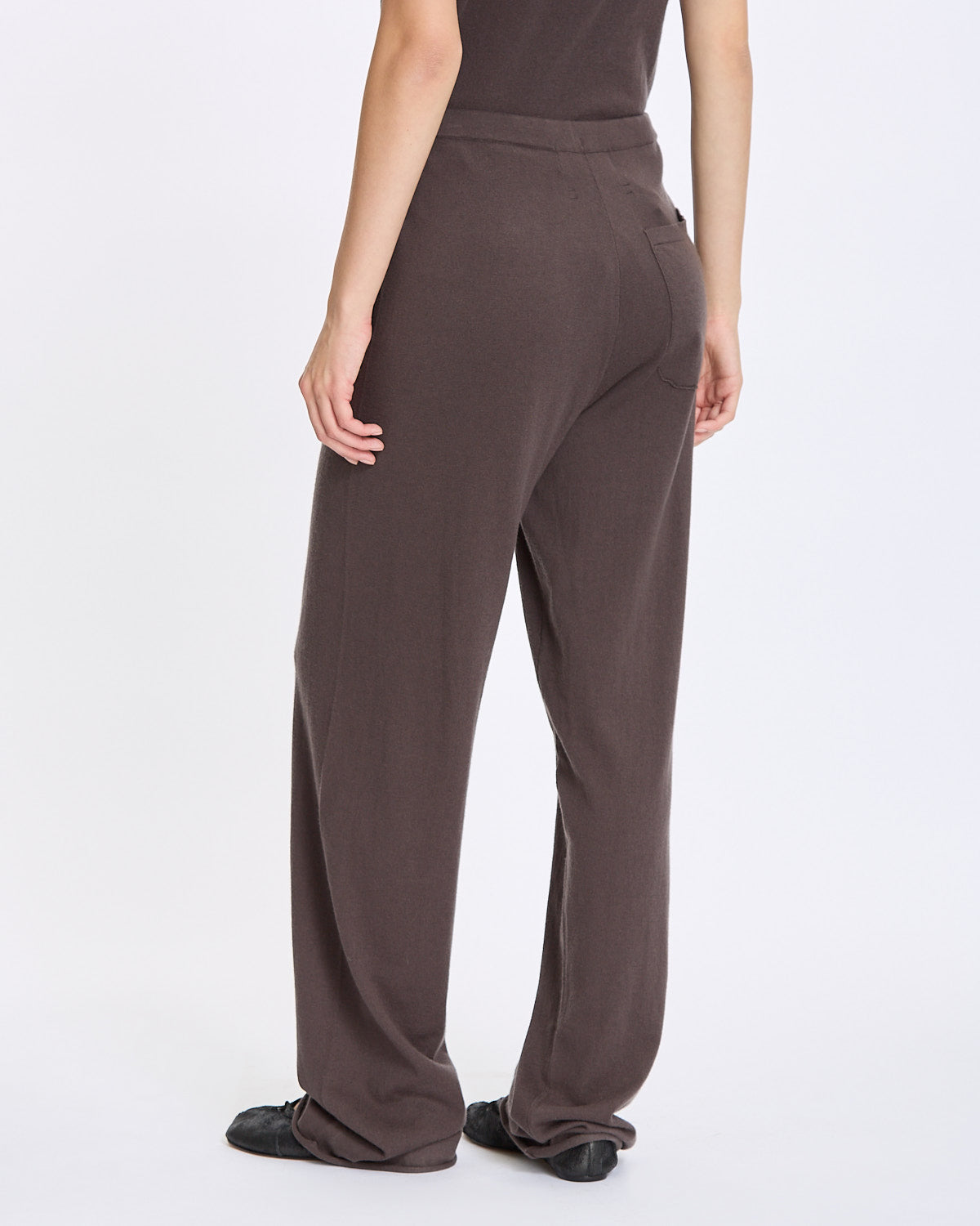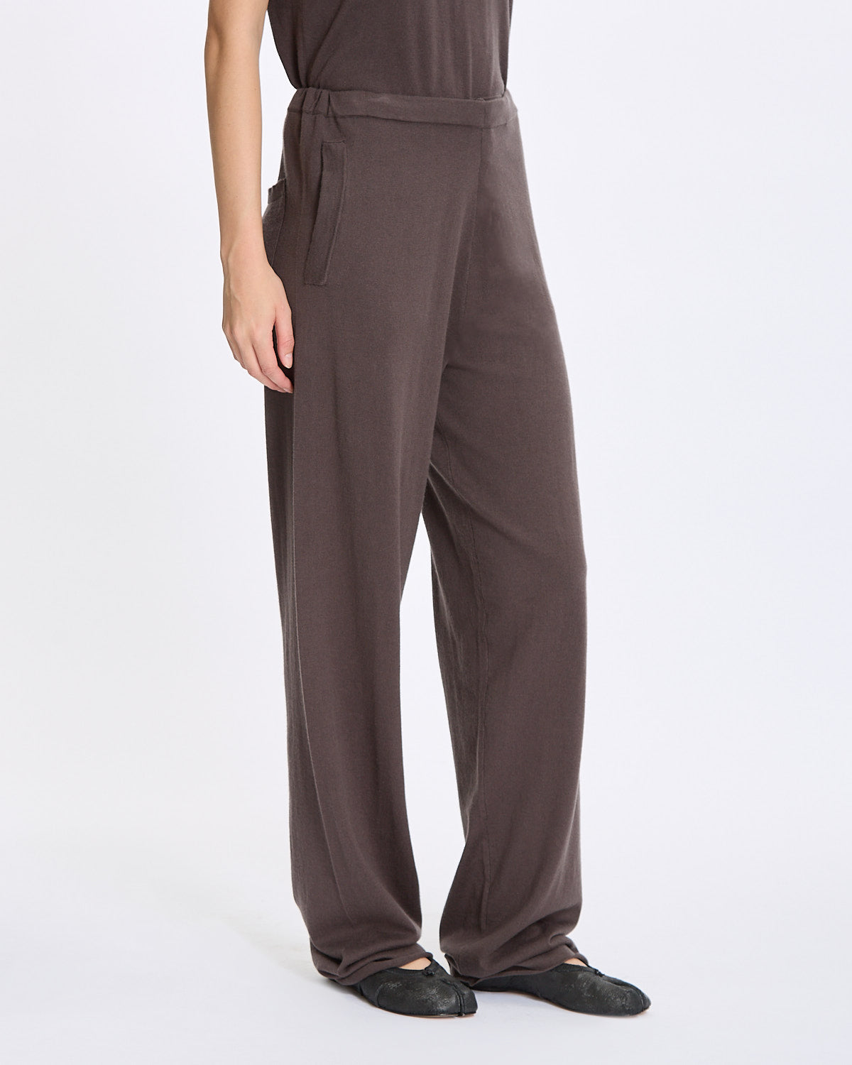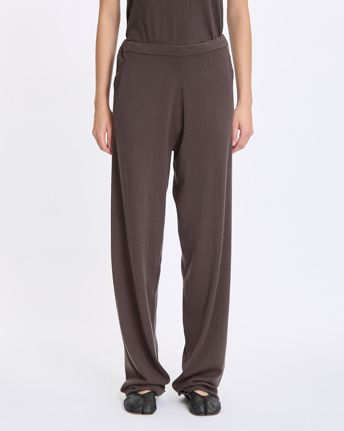 Extreme Cashmere N°353 Relax Trousers in mud feature a tapered fit. Details include side slit pockets, adjustable hidden drawstring and raw-cut hem finishings.